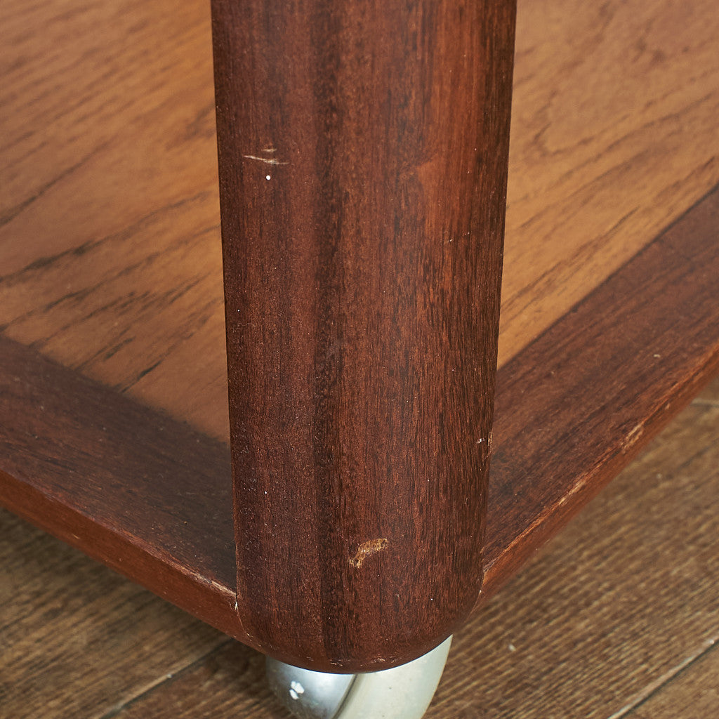 コンパクトでキューブ型のフォルムが印象的なコーヒーテーブル。美しいチーク材ががフレームに使用され、天板にはクリアグラスがセットされています。丈夫で個性的なキャスターが付いているので、掃除の際などの移動も楽に行なえます。日本ではあまり見かけない珍しいお品です。