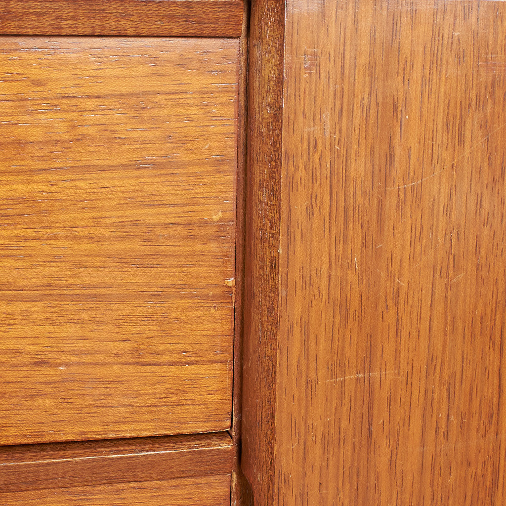 デンマークスタイルのデザインに独自のアレンジが施された個性的なサイドボード。幅1310 mmの小ぶりなボディは使い勝手がよく、シンプルなフォルムに遊び心とかっこよさを併せ持つ洗練された一品。実用的でありながらも作り手のこだわりを感じさせるヴィンテージファニチャーです。