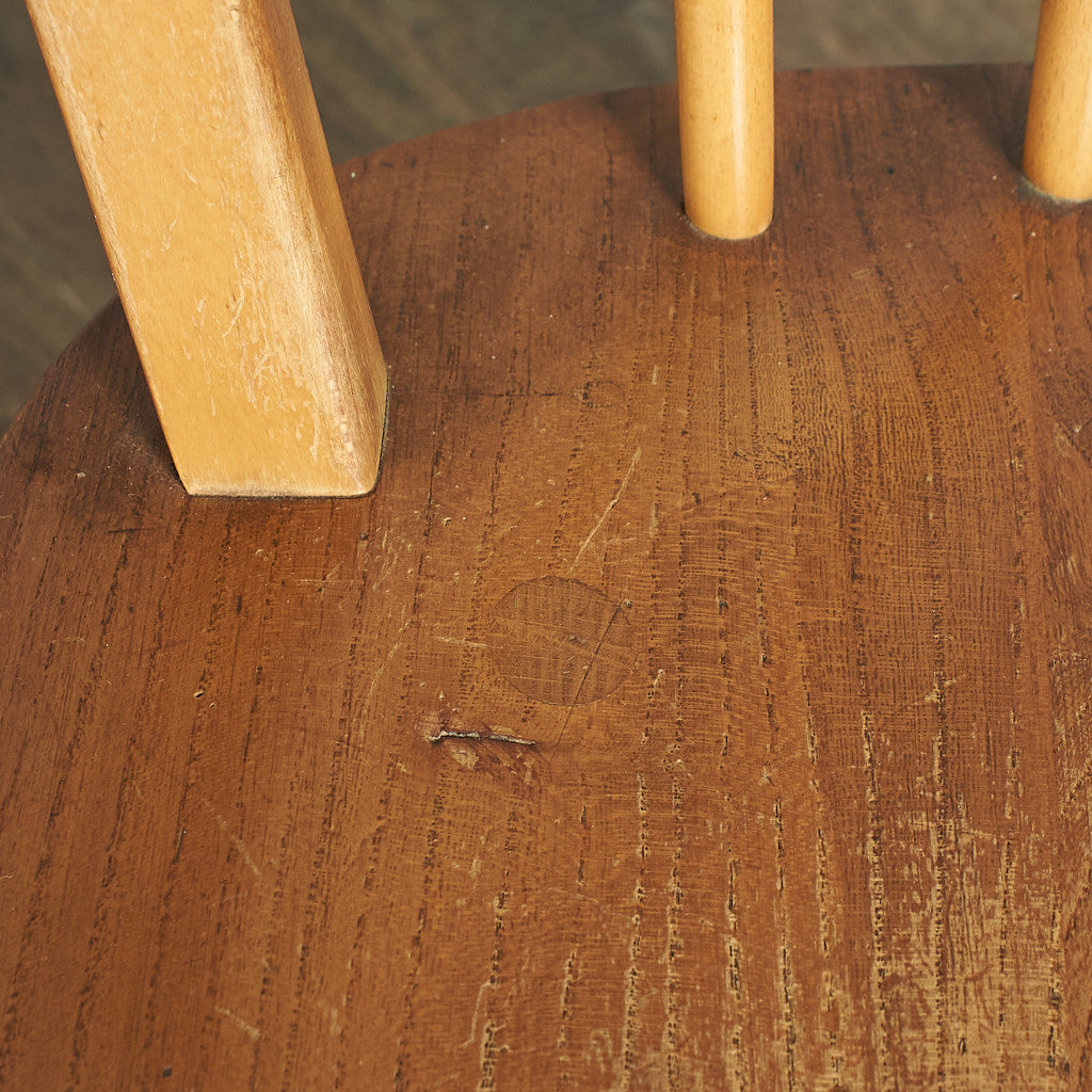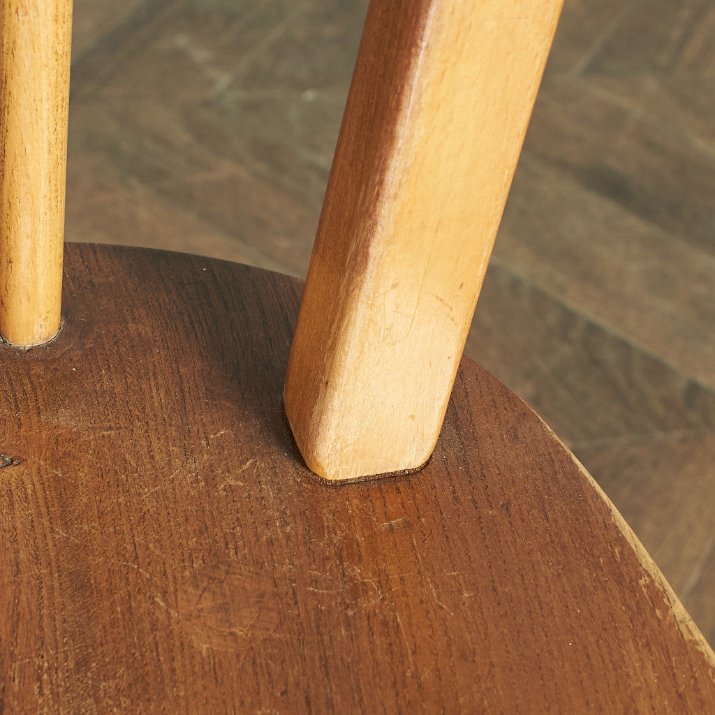 ERCOLのアイコン的存在であるウィンザーチェアシリーズの中で、最もオーソドックスなスタイルのフープバックチェアは「ボウバック(弓型の背もたれ)」という、クラシカルなデザインをベースに作られています。様々なバージョンがあり、背もたれのスポーク数が4本、5本、6本の3タイプ、座面はノーマル型とバイオリン型の2タイプ、大きさはノーマルサイズとラージサイズがあり、さらに6本スポークのチェアにはストレートレッグやアーム付きなどが存在し、その種類の豊富さもコレクター心をくすぐる大きな魅力となっています。特にスポーク5本タイプは流通量が少なく、希少性の高いアイテムです。
