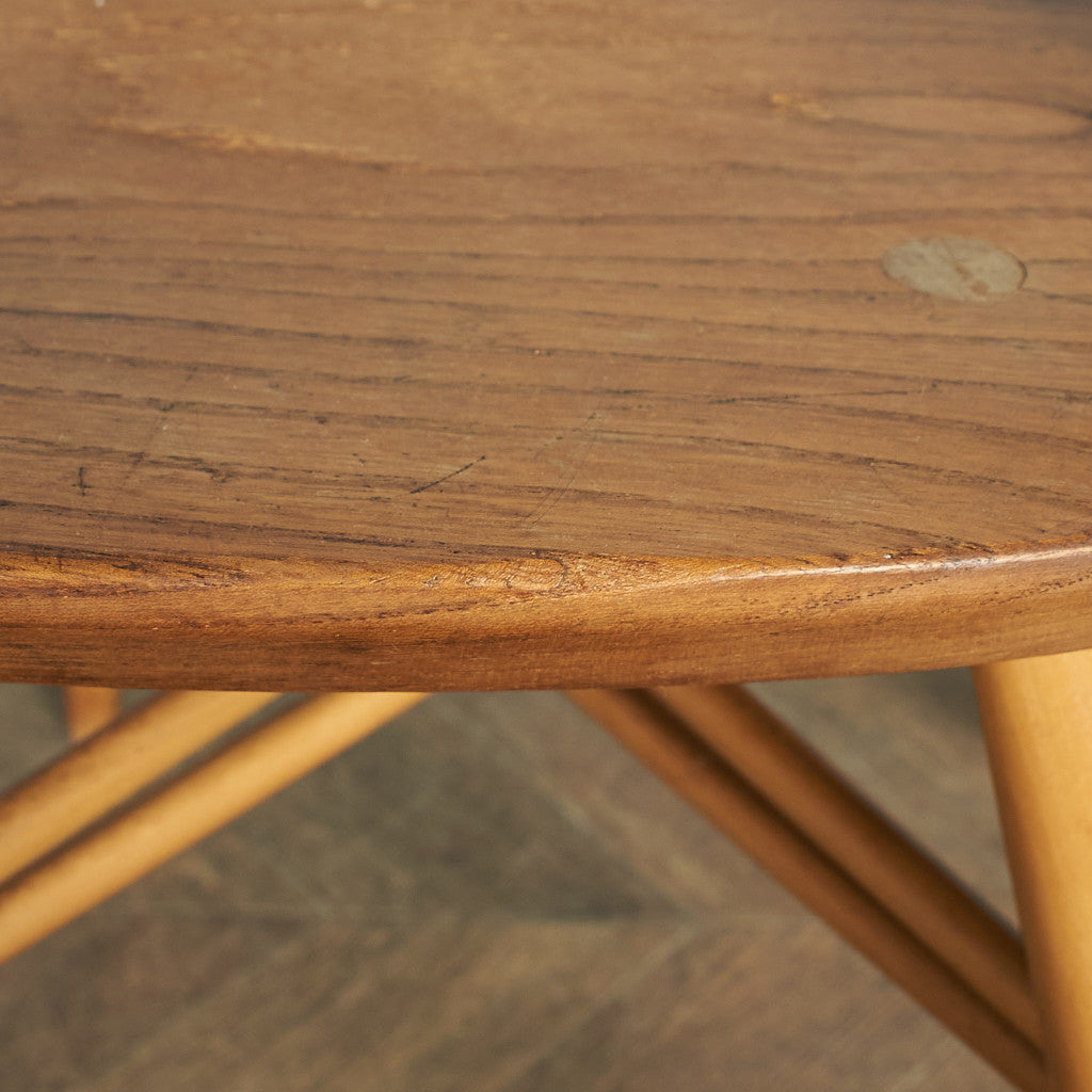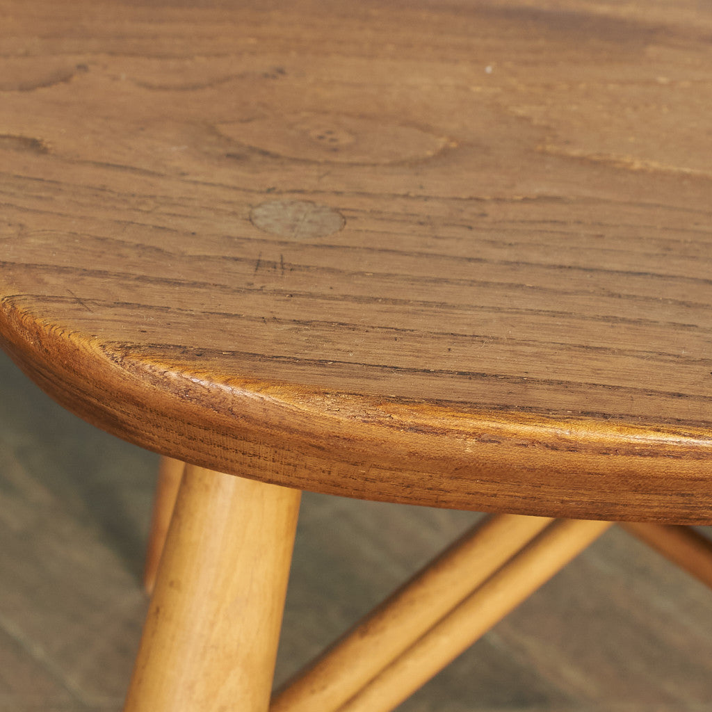 アーコール社は現存するイギリスの老舗家具メーカー。新品家具としてもアンティーク品としても同一のモデルで同様に高い支持を受け続けている稀有なブランドです。20世紀初頭にイギリスに移住してきたイタリア生まれの家具デザイナー "ルシアン・アーコラーニ"によって、1920年にハイ・ワイコムにアーコールファニチャーは設立されました。ERCOL社の成功のポイントとして当時乾燥が難しく歪みが生じるため家具材としては不適格として安価であったエルム材の乾燥方法を編み出したことがあります。ウィンザーチェアーに代表される伝統的な製法と、モダンデザインを融合させたコレクションは、さりげないデザインで軽やかでシンプル。1957年デザインのスタッキングチャイルドチェアーは、小学校などの施設で多く使用され一躍ベストセラーブランドとなりました。近年マーガレット・ハウエル(英国の服飾デザイナー)は、アーコール社スタッキングチャイルドチェアーのヴィンテージ品をロンドンショップで展示し、アーコールチェアーは大好評を得ることになりました。それをきっかけにアーコール社は2002年から同商品の復刻版の製造を開始するまでになります。 その後マーガレット・ハウエルのショップでもこの復刻版は販売されることとなり、たちまち人気が高まりました。イエロー×ゴールドの通称ゴールドラベルがついた1960年代〜70年代頃アーコール全盛期の品物は以前よりプレミアム的に価値で取引されておりましたが、近年ではそれ以前のヴィンテージ品ブルーラベルのお品物も含めてイギリス現地で一昔前の倍近くの取引相場にまで高騰しています。