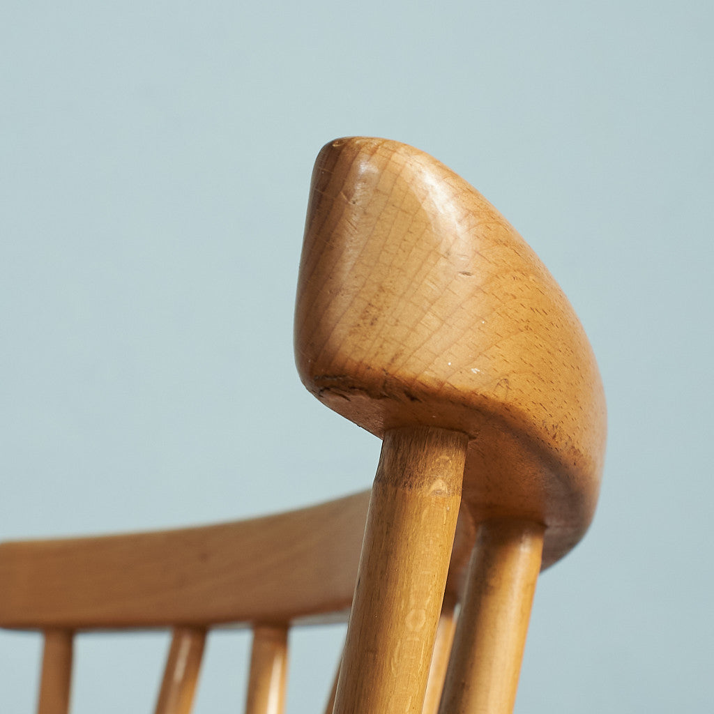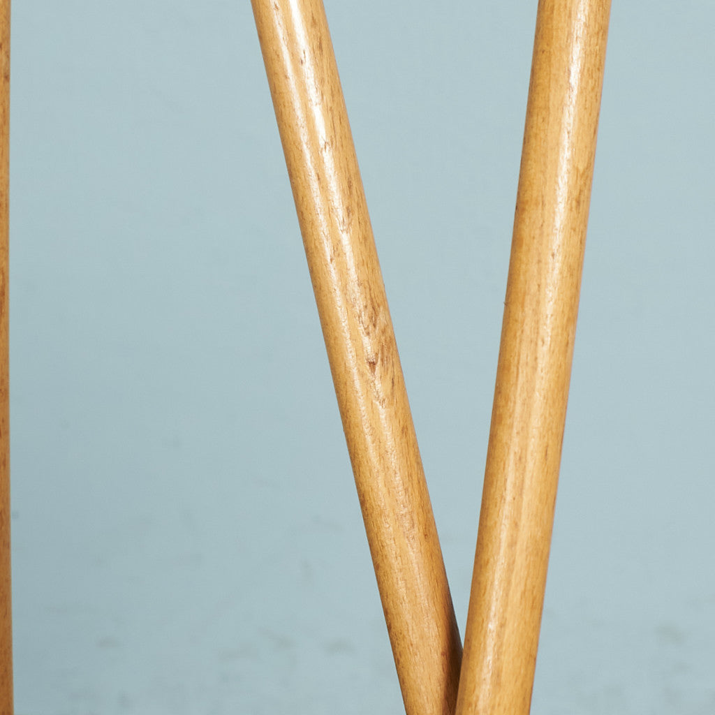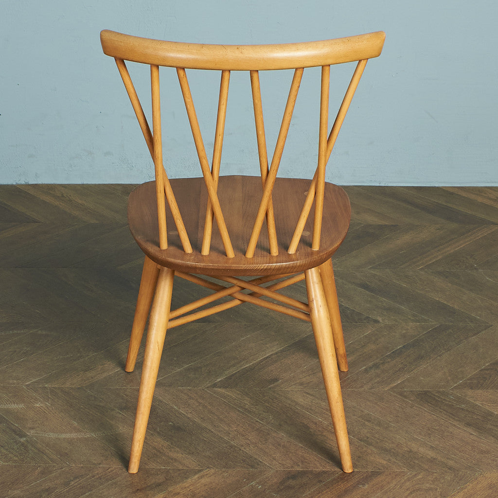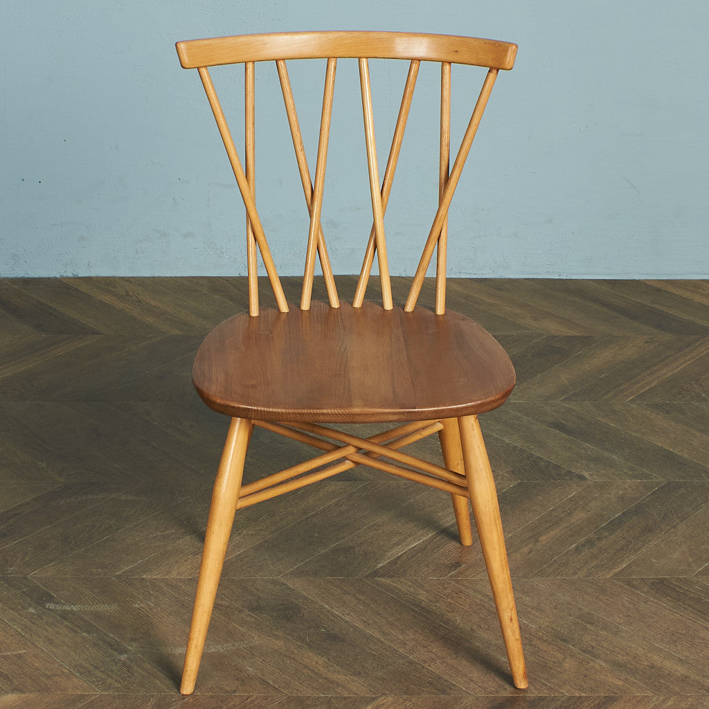 アーコール社のチェアの中でも希少性の高い一品。ラティスドチェアとはしなやかに組まれたスピンドルのフォルムが、庭のラティスフェンスに似ていることに因みます。この椅子にはクロスバックチェア、キャンドルメイカーズチェアの別称もあります。また、脚の貫部分までクロスになっていて、優雅なシルエットが際立っています。8本のスポークが座板に差し込まれていますが、その1本ずつの角度も深さも異なっているため、大変難しい作業となりますが、熟達の鮮やかな手仕事が伺えます。笠木部分にはブナの木を弓状に曲げるウィンザーボウーの技術が息づき、エルム材を使った座面も緩やかな座刳りが施されるなど、随所に職人の丁寧な技巧が凝縮した一脚です。