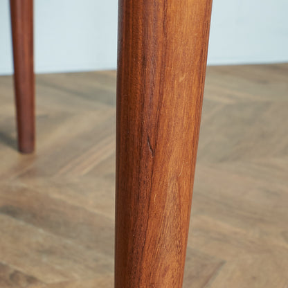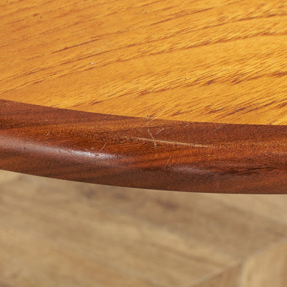 ミッドセンチュリーG-PLANコレクションの中心とも言える定番モデルのラウンドエクステンションテーブル。G-PLANのカタログにおいてもフレスコ、シエラ、ダニッシュ等のチーク材を用いたシリーズで横断的に組み合わせられるベーシックかつ汎用性の高いテーブルです。トップにはチーク、脚と縁には濃色の材を用いたバイカラー仕様。天板下に収納された拡張天板を中央に展開させることでテーブルの上はそのままに簡単にサイズの拡張が可能なエクステンションテーブルです。普段は2人〜4人用、来客時などは天板をさっと広げて6人用としてお使いいただけます。