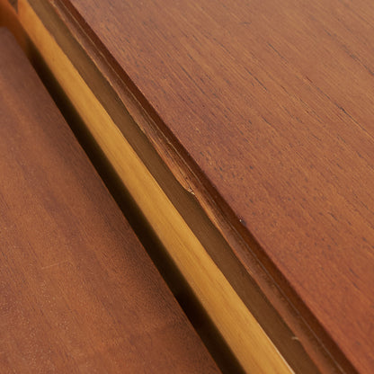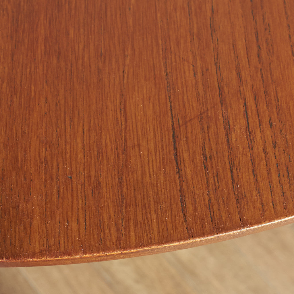 褐色の木肌が美しいチーク材を使用した、ヴィンテージテーブル。天板下に収納された拡張天板を中央に展開させることでテーブルの上はそのままに簡単にサイズの拡張が可能なエクステンションテーブルです。普段は2人〜4人用、来客時などは天板をさっと広げて6人用としてお使いいただけます。