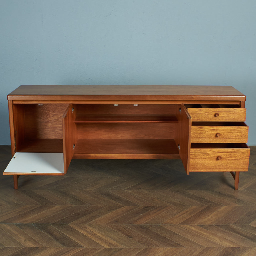 ネイサン社の創業は1916年、イギリス・ロンドンでロシア出身のバーネット・ネイサンが手作りの家具を製造したことに遡ります。1954年ニュー ヨークで開かれた家具展覧会においてイギリスを代表するデザインとして選ばれて一躍有名になり、チーク材の家具を本格的に生産。G-planシリーズで有名なエベネゼル・グーム社と並び、イギリスミッドセンチュリーを代表する家具メーカーへと発展しました。とくに「クラシックレンジ」シリーズは、時代を超越したデザインで優れた快適性と職人技が見事に融合。クラシックと北欧スタイルの折衷的な独自のデザインスタイルを生み出し、ジャコビアンドアスタイリングと美しいチーク材の組み合わせの自然な輝きがロンドンの都市生活者を虜にしました。