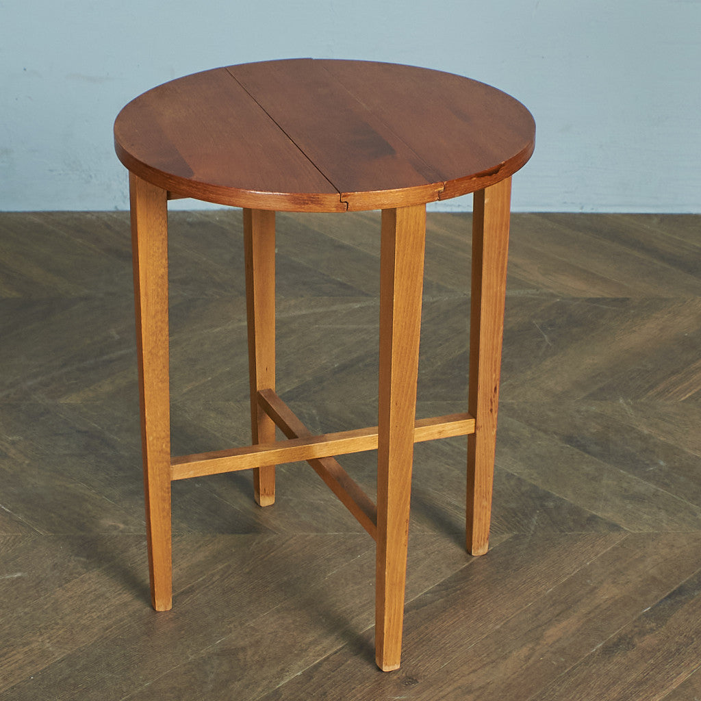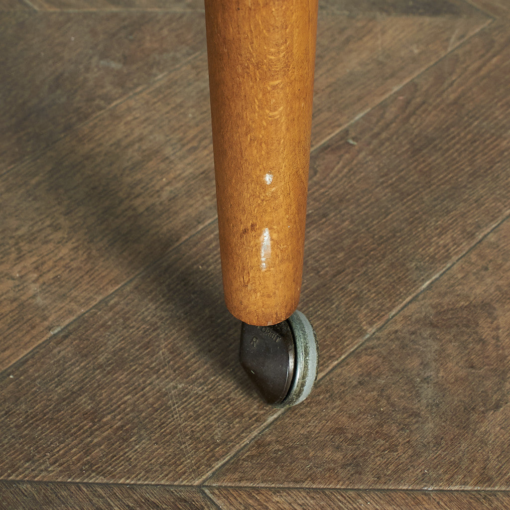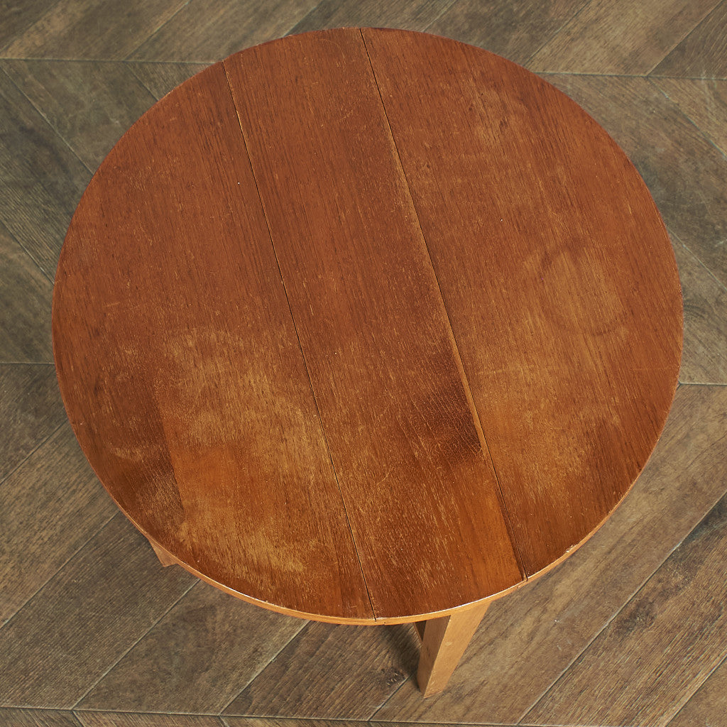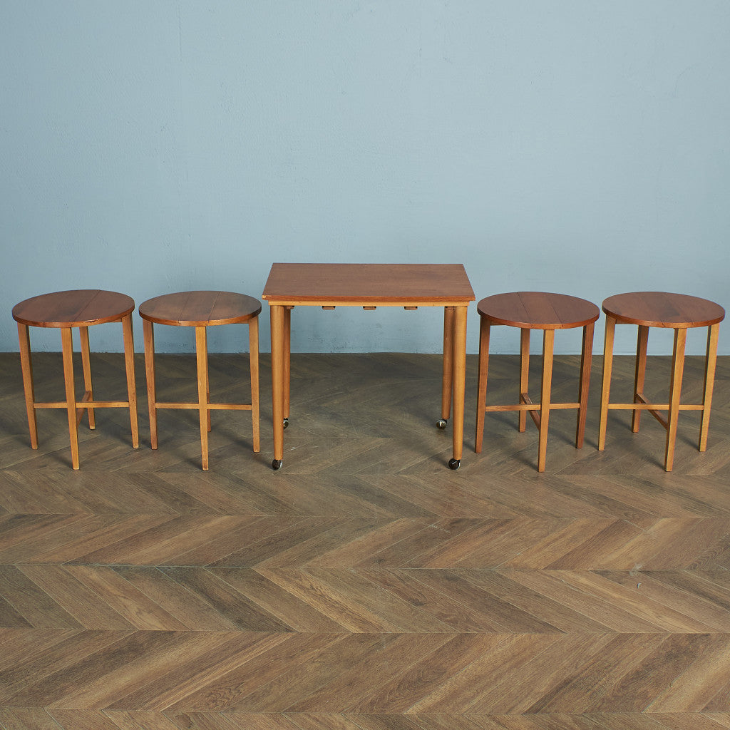 正方形のキャスター付きテーブルの下に、折りたたみの小さいラウンドテーブルを複数収納している変則タイプのユニークなデザイン。市場でもかなり希少なお品です。