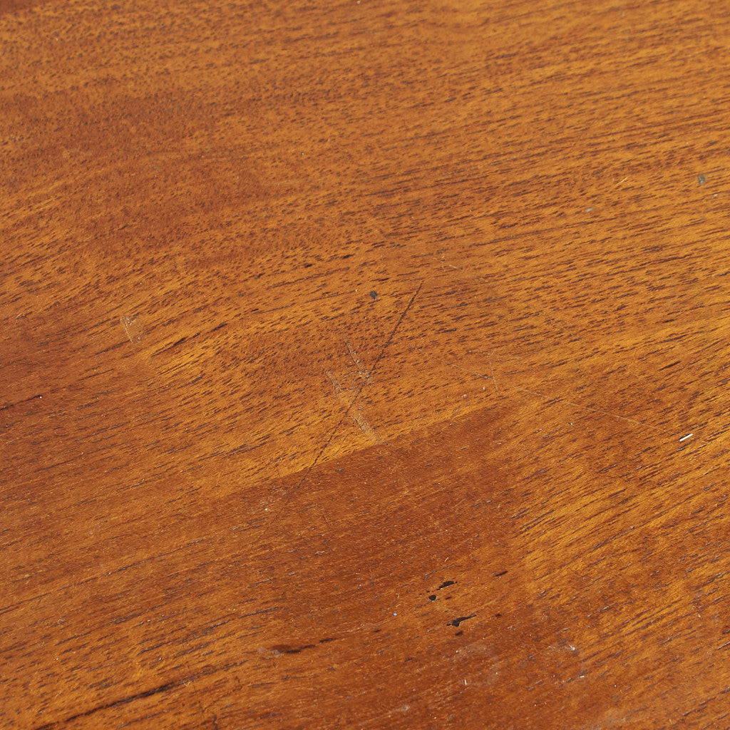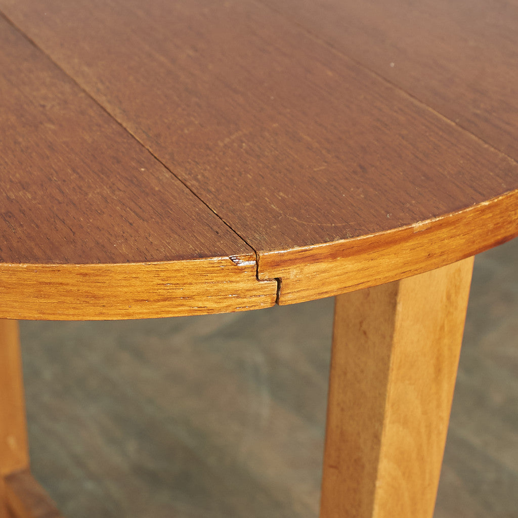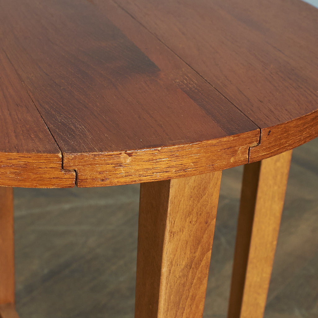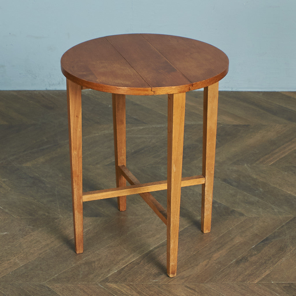 正方形のキャスター付きテーブルの下に、折りたたみの小さいラウンドテーブルを複数収納している変則タイプのユニークなデザイン。市場でもかなり希少なお品です。