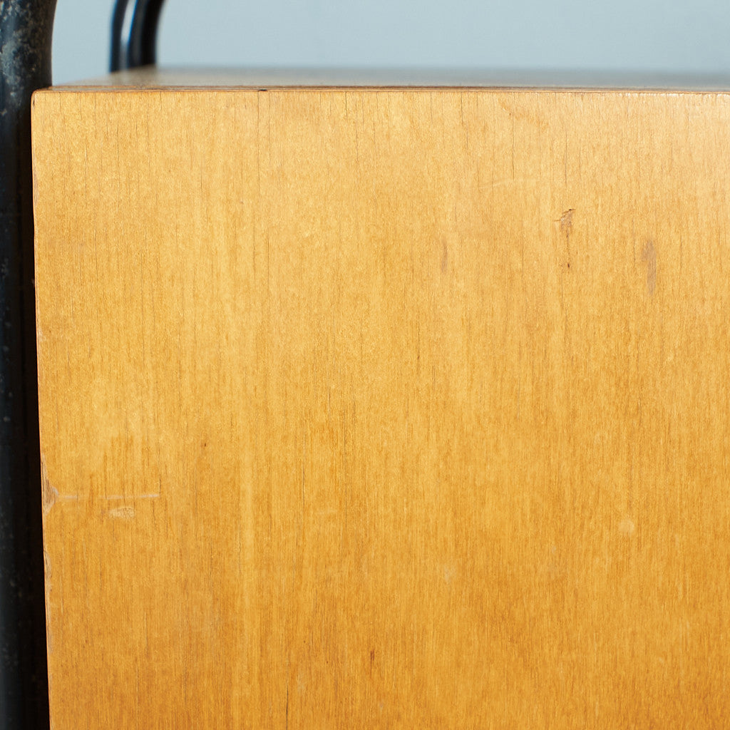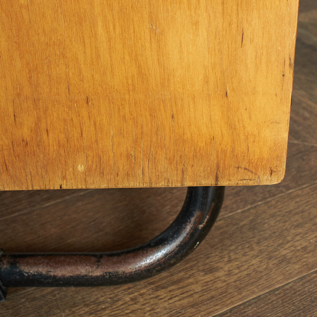 オーク材の木肌に無骨な金属フレームのコントラストが印象的。美しいフレームラインに圧迫感のないデザイン、現代的でインダストリアルな雰囲気が魅力です。実用的でありながらも作り手のこだわりを感じさせる洗練された一品です。