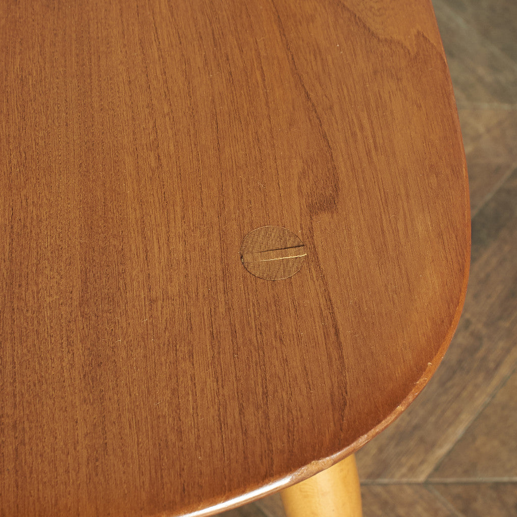 アーコール社は現存するイギリスの老舗家具メーカー。新品家具としてもアンティーク品としても同一のモデルで同様に高い支持を受け続けている稀有なブランドです。20世紀初頭にイギリスに移住してきたイタリア生まれの家具デザイナー "ルシアン・アーコラーニ"によって、1920年にハイ・ワイコムにアーコールファニチャーは設立されました。ERCOL社の成功のポイントとして当時乾燥が難しく歪みが生じるため家具材としては不適格として安価であったエルム材の乾燥方法を編み出したことがあります。ウィンザーチェアーに代表される伝統的な製法と、モダンデザインを融合させたコレクションは、さりげないデザインで軽やかでシンプル。1957年デザインのスタッキングチャイルドチェアーは、小学校などの施設で多く使用され一躍ベストセラーブランドとなりました。近年マーガレット・ハウエル(英国の服飾デザイナー)は、アーコール社スタッキングチャイルドチェアーのヴィンテージ品をロンドンショップで展示し、アーコールチェアーは大好評を得ることになりました。それをきっかけにアーコール社は2002年から同商品の復刻版の製造を開始するまでになります。 その後マーガレット・ハウエルのショップでもこの復刻版は販売されることとなり、たちまち人気が高まりました。イエロー×ゴールドの通称ゴールドラベルがついた1960年代〜70年代頃アーコール全盛期の品物は以前よりプレミアム的に価値で取引されておりましたが、近年ではそれ以前のヴィンテージ品ブルーラベルのお品物も含めてイギリス現地で一昔前の倍近くの取引相場にまで高騰しています。