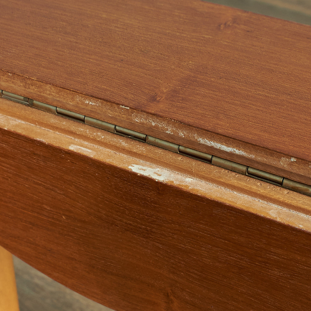 キャスター付きテーブルの下に、折りたたみの小さいラウンドテーブルを複数収納している変則タイプのユニークなデザイン。市場でもかなり希少なお品です。