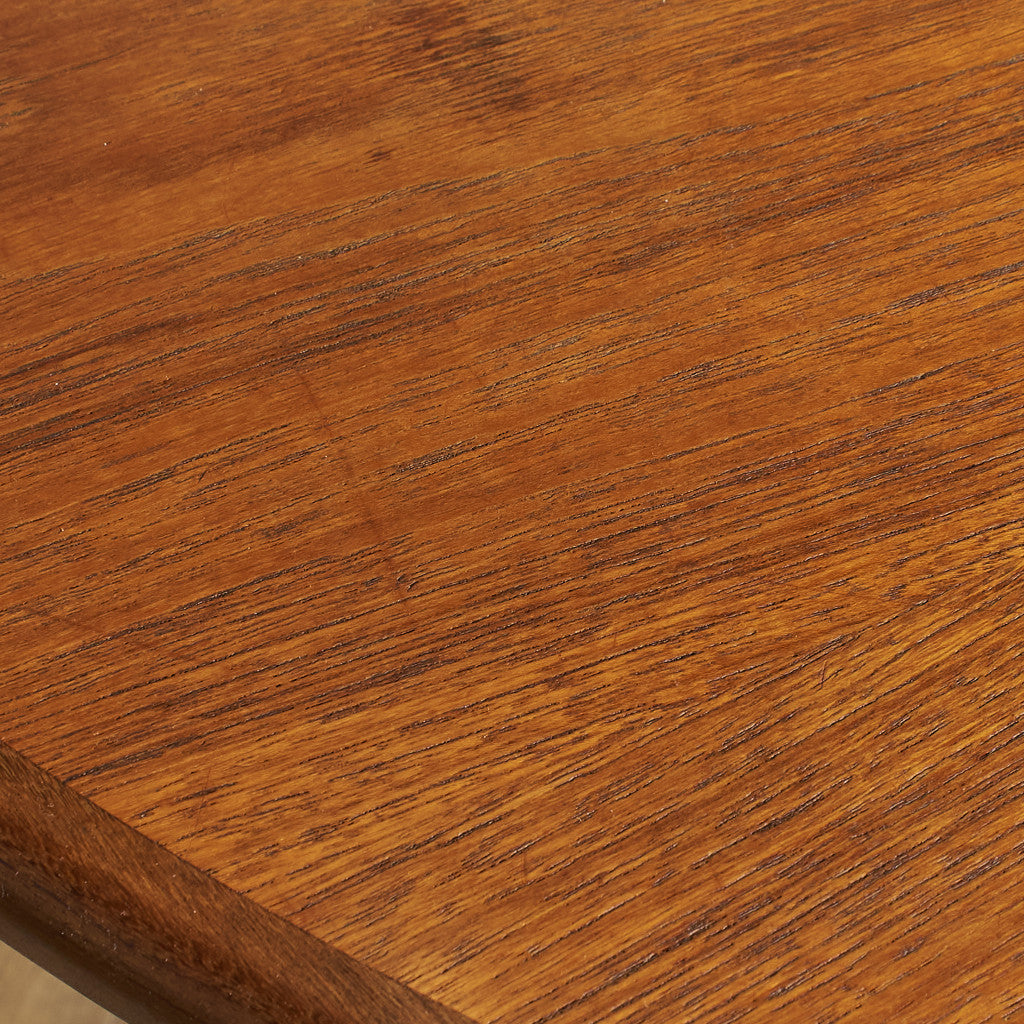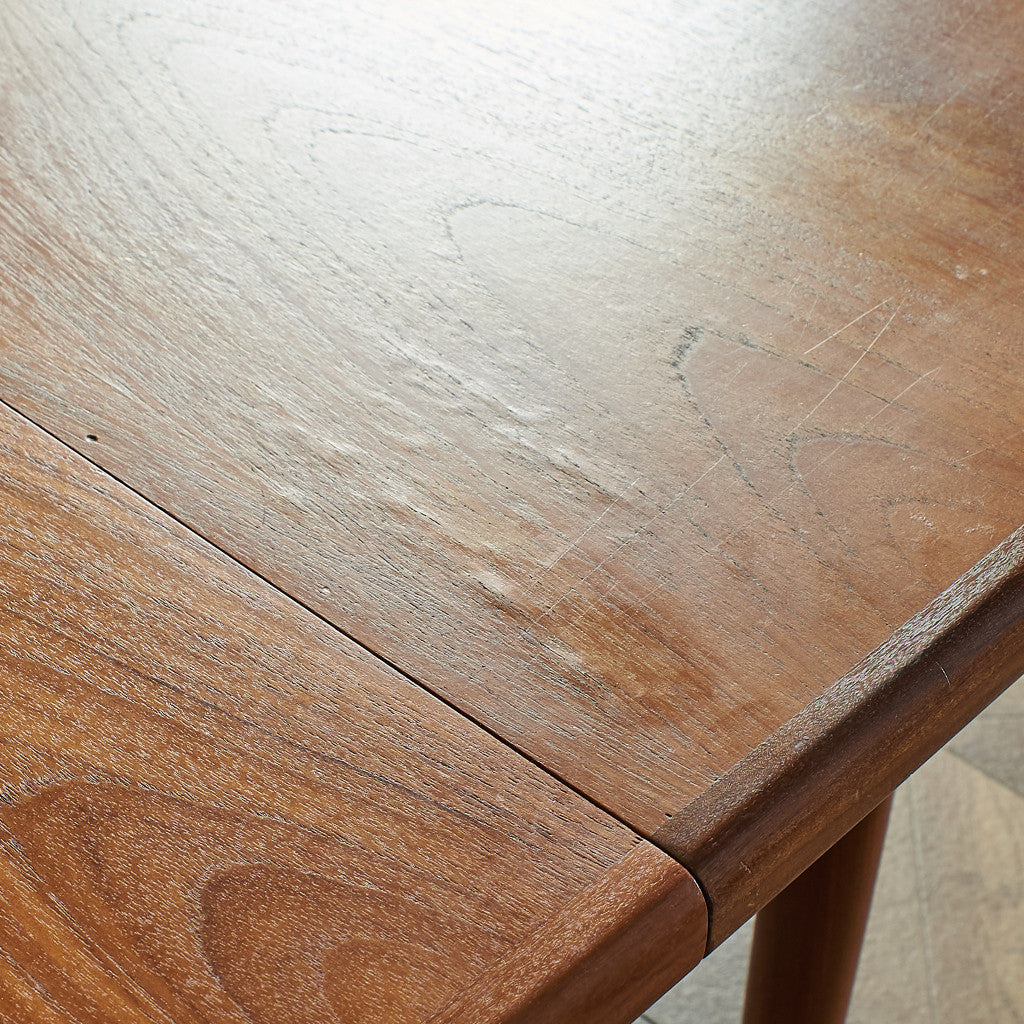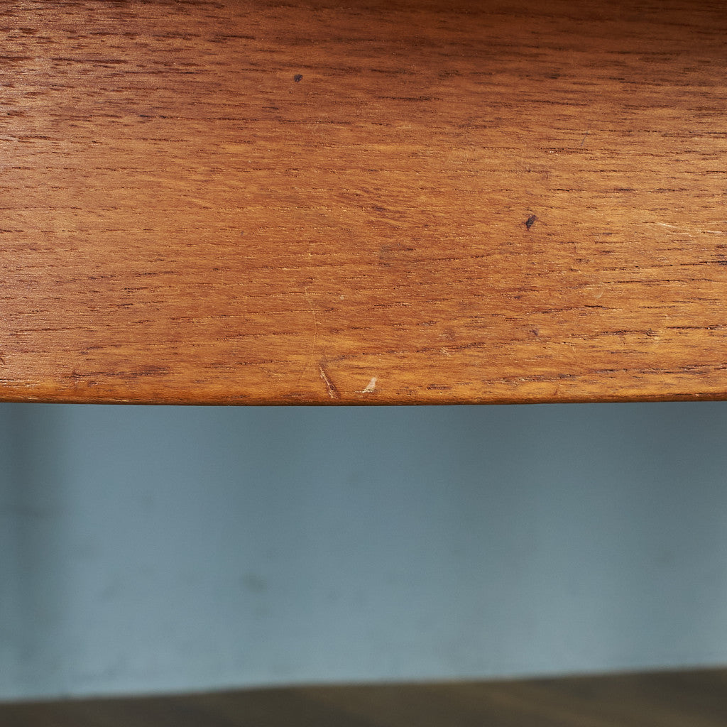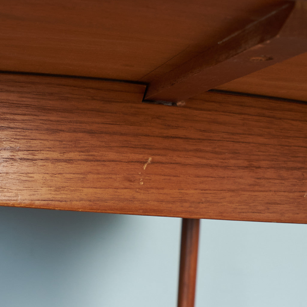 ミッドセンチュリーG-PLANコレクションの中心とも言える定番モデルのオーバルエクステンションテーブル。G-PLANのカタログにおいてもフレスコ、シエラ、ダニッシュ等のチーク材を用いたシリーズで横断的に組み合わせられるベーシックかつ汎用性の高いテーブルです。 トップにはチーク、脚と縁にはアフロモジアを用いたバイカラー仕様。天板下に収納された拡張天板を中央に展開させることでテーブルの上はそのままに簡単にサイズの拡張が可能なエクステンションテーブルです。普段は2人〜4人用、来客時などは天板をさっと広げて6人用としてお使いいただけます。