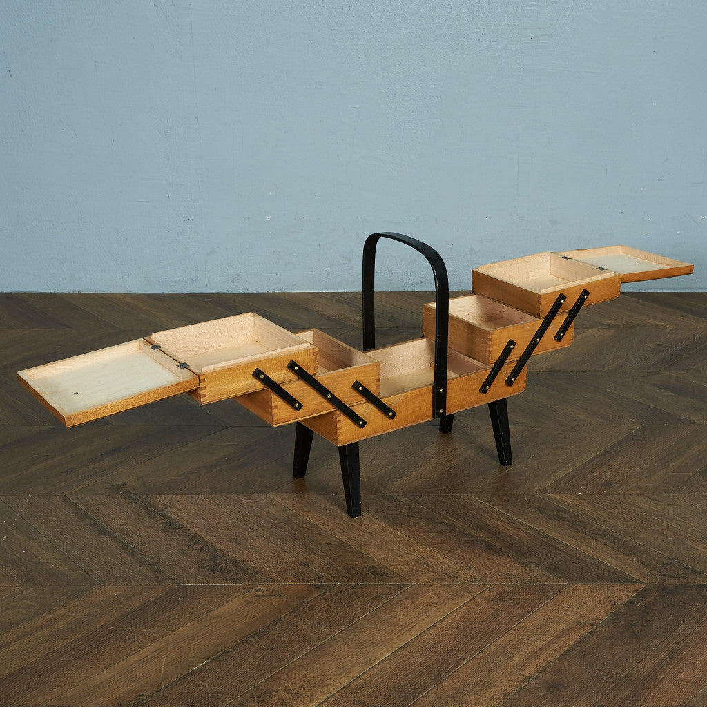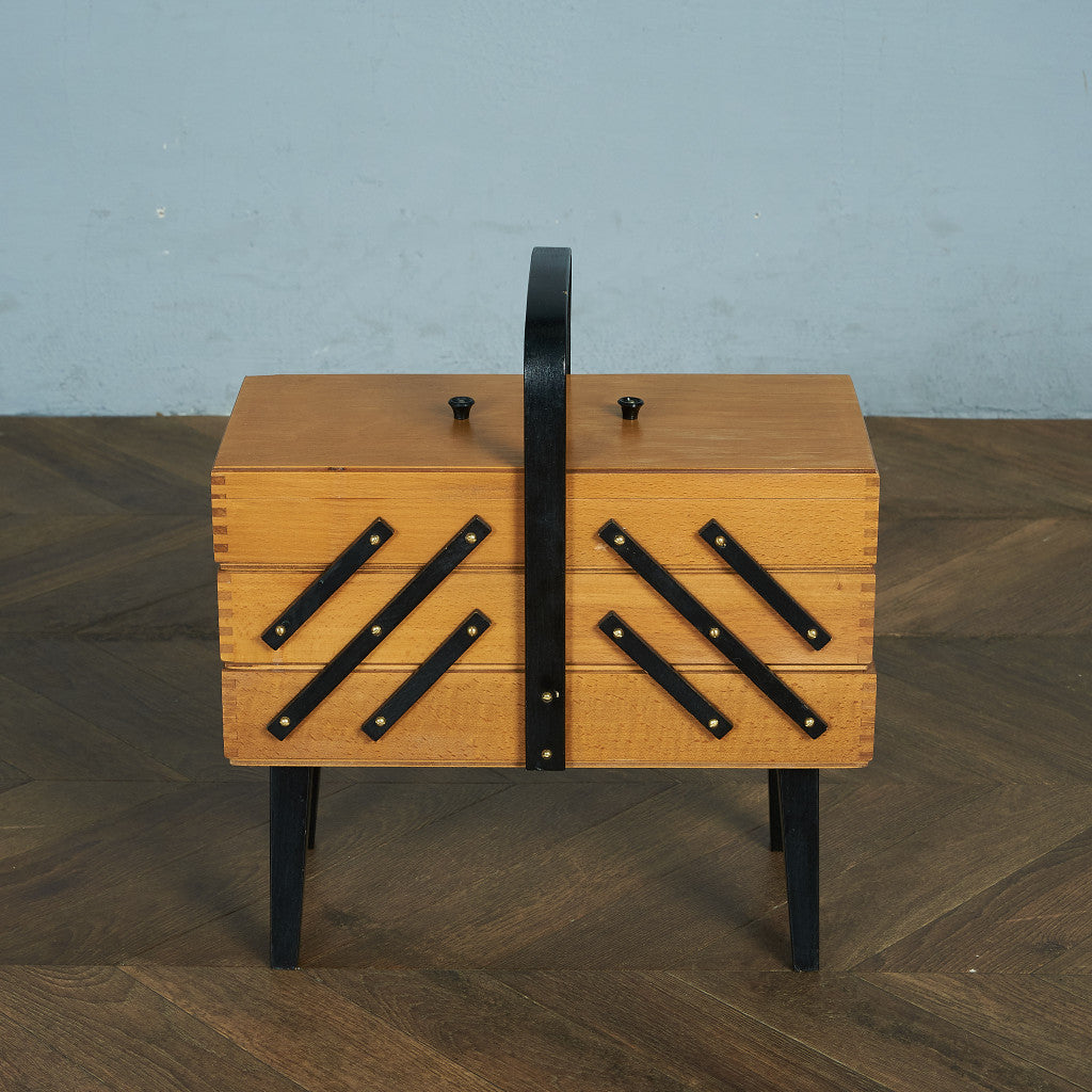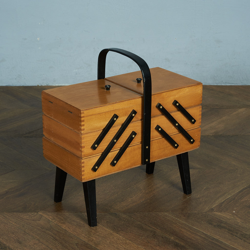 持ち運びのし易い取っ手を備えた小ぶりサイズのソーイングボックス。収納部分が大きく展開するので実用性も抜群です。展開部に施されたブラックの塗装がアクセントになった、遊び心とかっこよさをミックスしたデザインが印象的です。