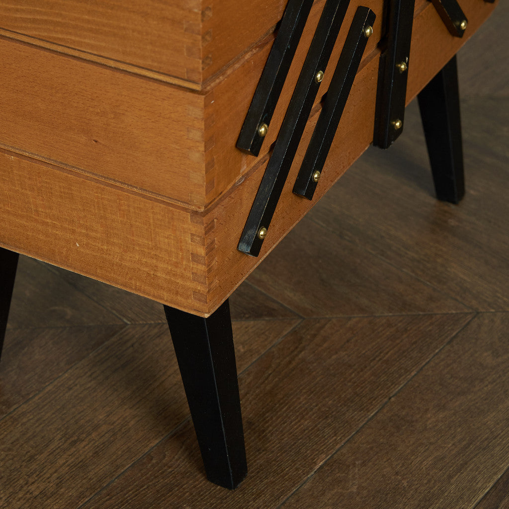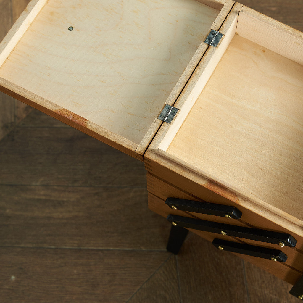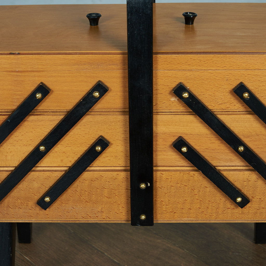 持ち運びのし易い取っ手を備えた小ぶりサイズのソーイングボックス。収納部分が大きく展開するので実用性も抜群です。展開部に施されたブラックの塗装がアクセントになった、遊び心とかっこよさをミックスしたデザインが印象的です。