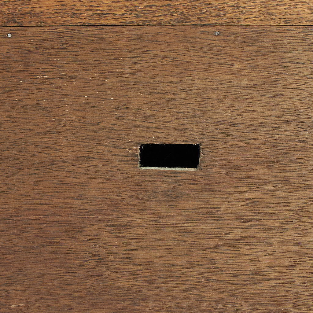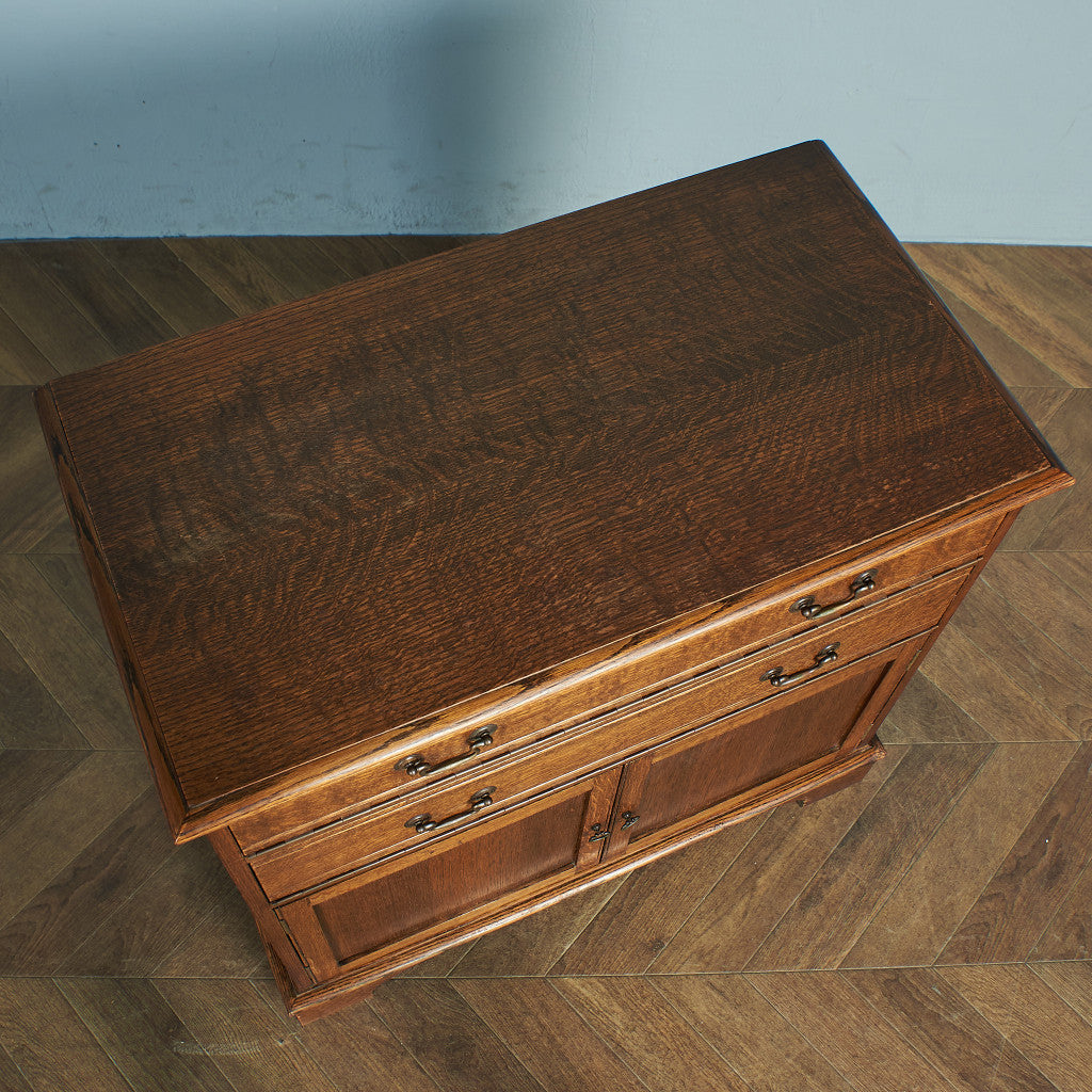 レコードプレーヤーの収納のために上部が開く仕様のキャビネット。内部に配線孔があるのでスマートフォン等身の周り充電が必要な細々したアイテムを見せずにスッキリ収納できます。