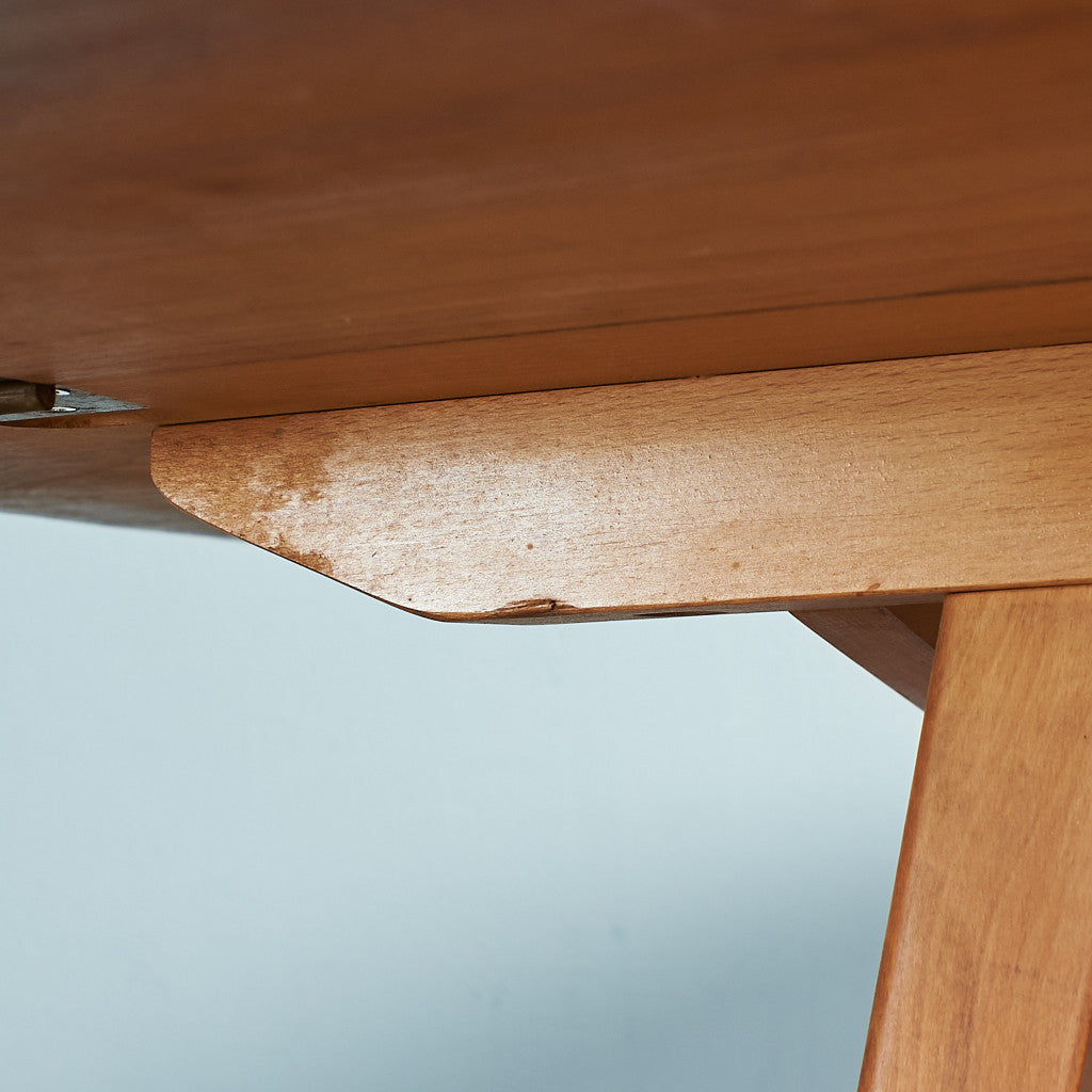 ウィングの部分を広げると楕円のテーブルトップになり、たたむと長方形になります。片側だけたたむ事もできます。パーティーなどでお客様が見えたりする時には広げて、普段お使いの際にはコンパクトにたたんで使用するなど、シチュエーションで使い分ける事ができるテーブルです。現在でも人気のあるこのテーブルは、2017年に復刻版が発売されました。折りたたみの天板を支える支柱がアルミに変更されています。
