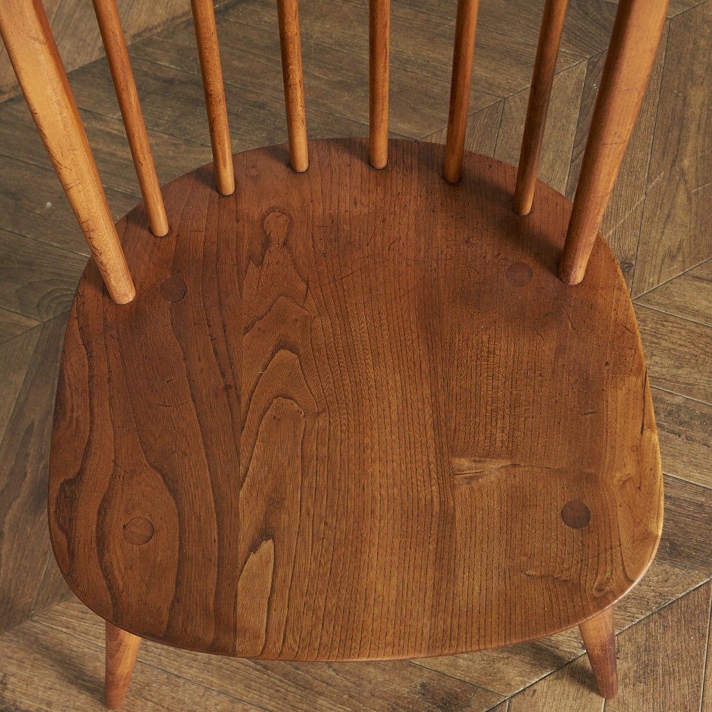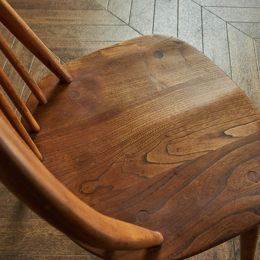 ERCOLのアイコン的存在であるウィンザーチェアシリーズの中で、最もオーソドックスなスタイルのフープバックチェアは「ボウバック(弓型の背もたれ)」という、クラシカルなデザインをベースに作られています。様々なバージョンがあり、背もたれのスポーク数が4本、5本、6本の3タイプ、座面はノーマル型とバイオリン型の2タイプ、大きさはノーマルサイズとラージサイズがあり、さらに6本スポークのチェアにはストレートレッグやアーム付きなどが存在し、その種類の豊富さもコレクター心をくすぐる大きな魅力となっています。特にスポーク5本タイプは流通量が少なく、希少性の高いアイテムです。