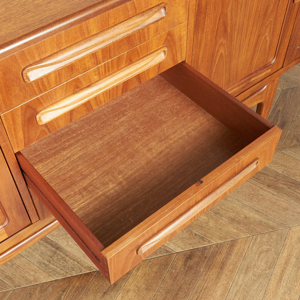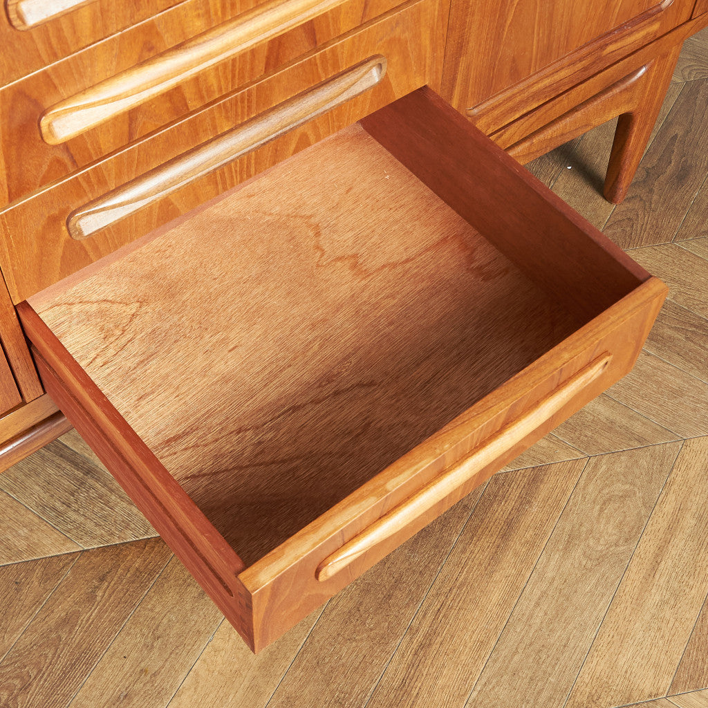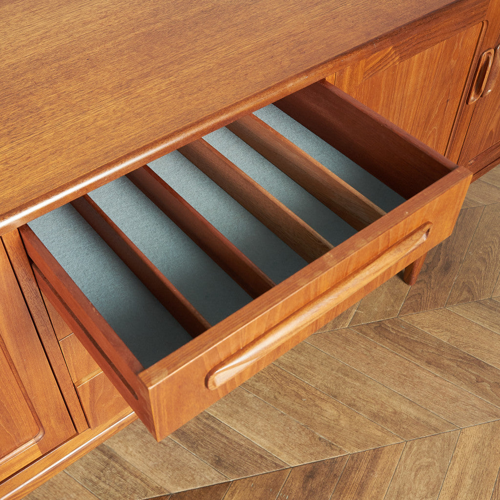 英国ミッドセンチュリー期を代表するブランド G-PLAN(ジープラン) による、Victor Bramwell Wilkins(ビクター・ブラムウェル・ウィルキンス)デザイン『Fresco(フレスコ)』脚付きロングサイドボードです。