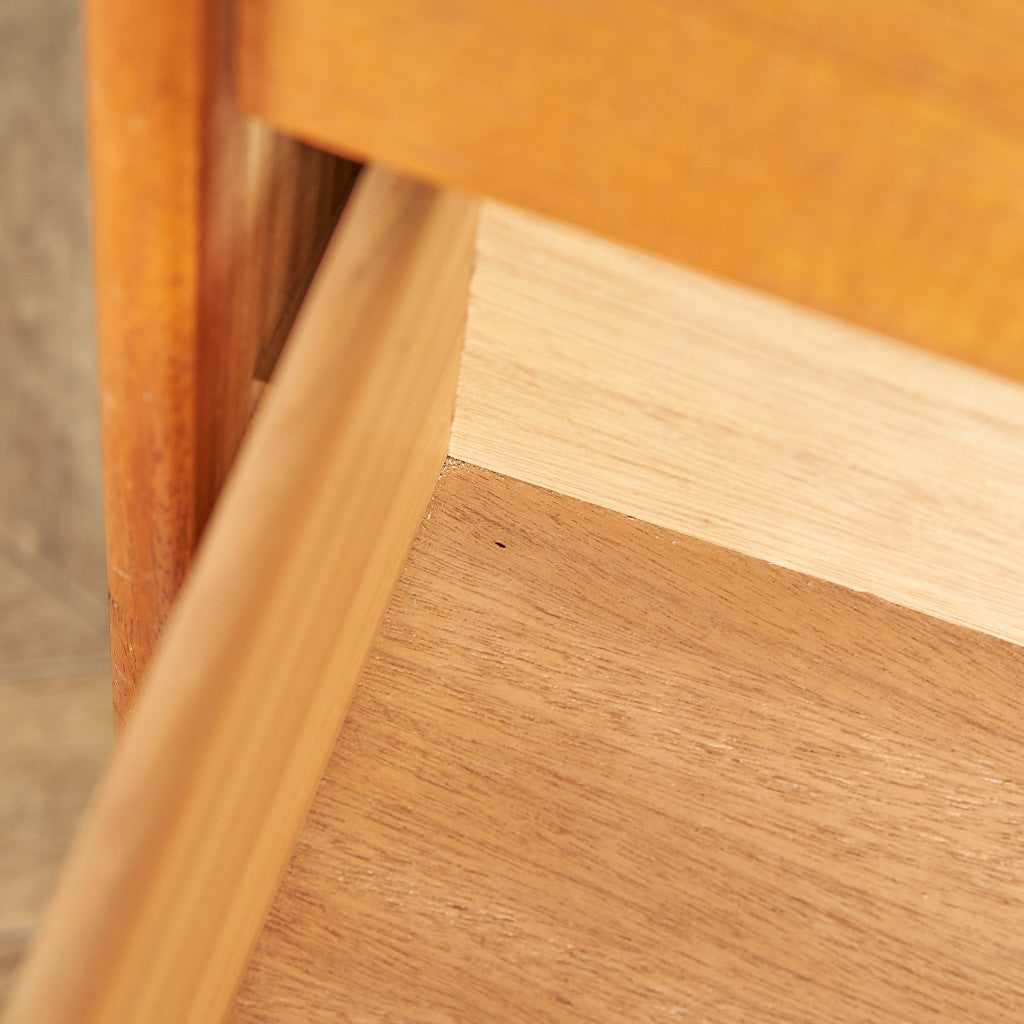 今では希少な高級材であるチーク材を使用した温かみのある褐色の木肌、ペーパーナイフのように研ぎ出された滑らかな取っ手等実用的でありながらも作り手のこだわりを感じさせるヴィンテージファニチャーです。