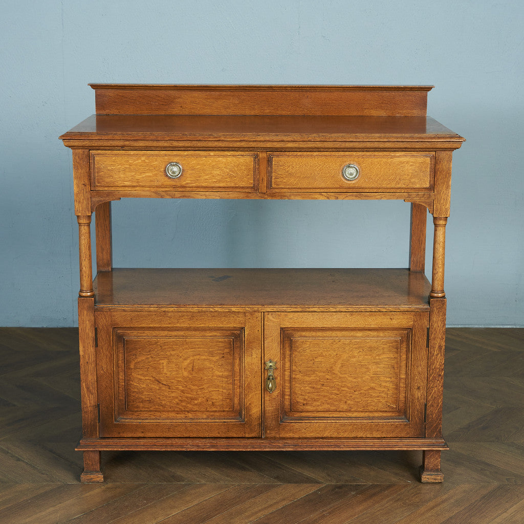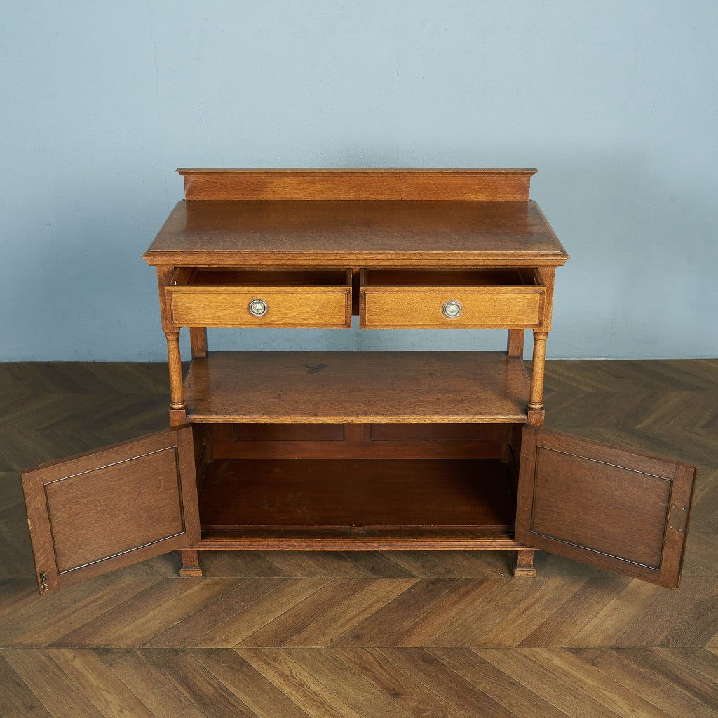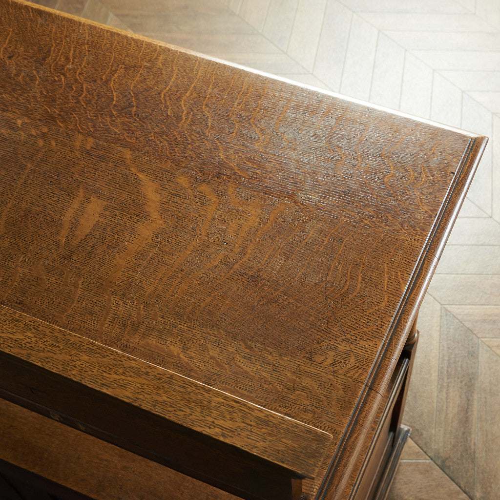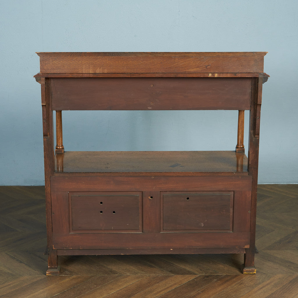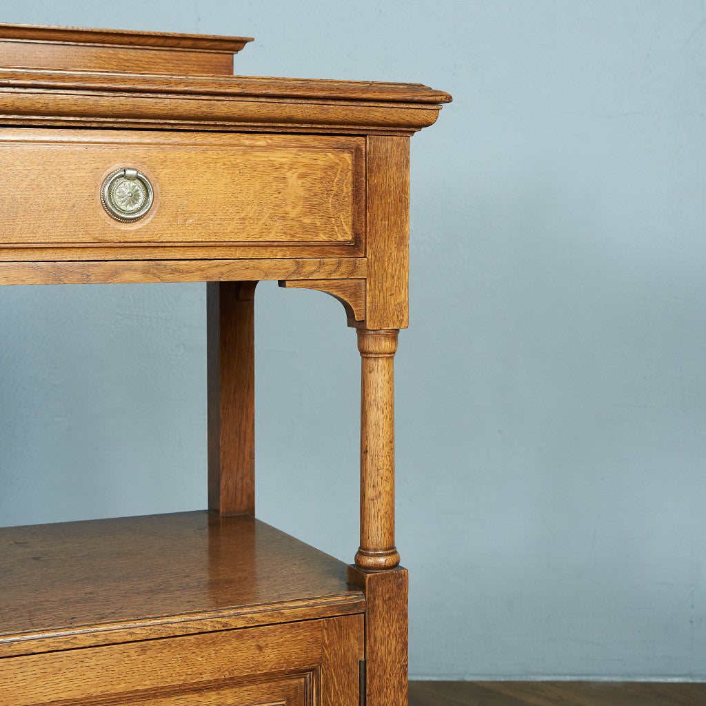 力強い木目のオーク材に金具取っ手がアクセントになった、エレガントな佇まいが魅力的。観音開きの扉収納や引き出し、オープン収納を備えた実用性の高い一品です。天板はちょっとした作業台としても便利にお使いいただけます。古き良き西欧の伝統を感じさせるクラシカルなデザイン、程よく古びた風合いが素朴で優しい雰囲気を演出します。