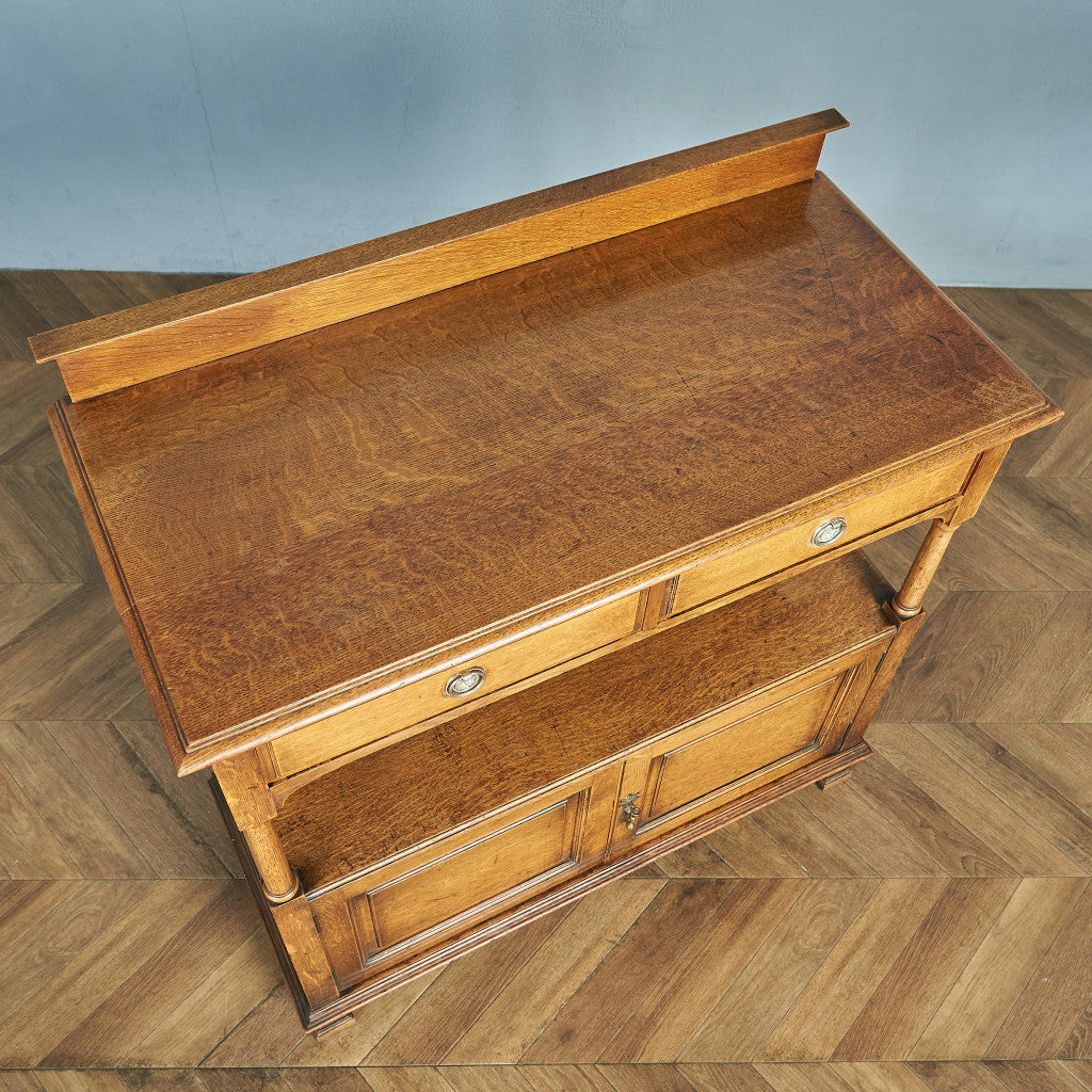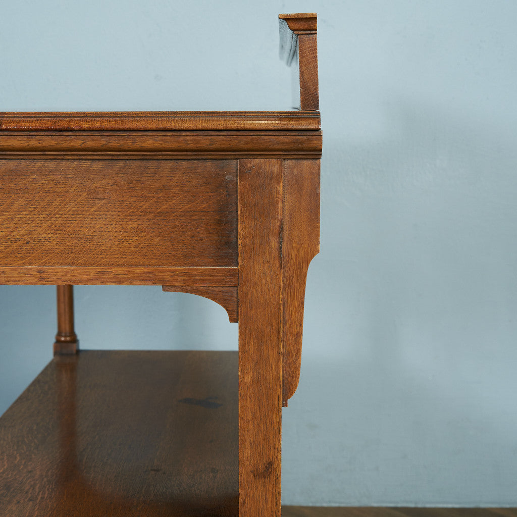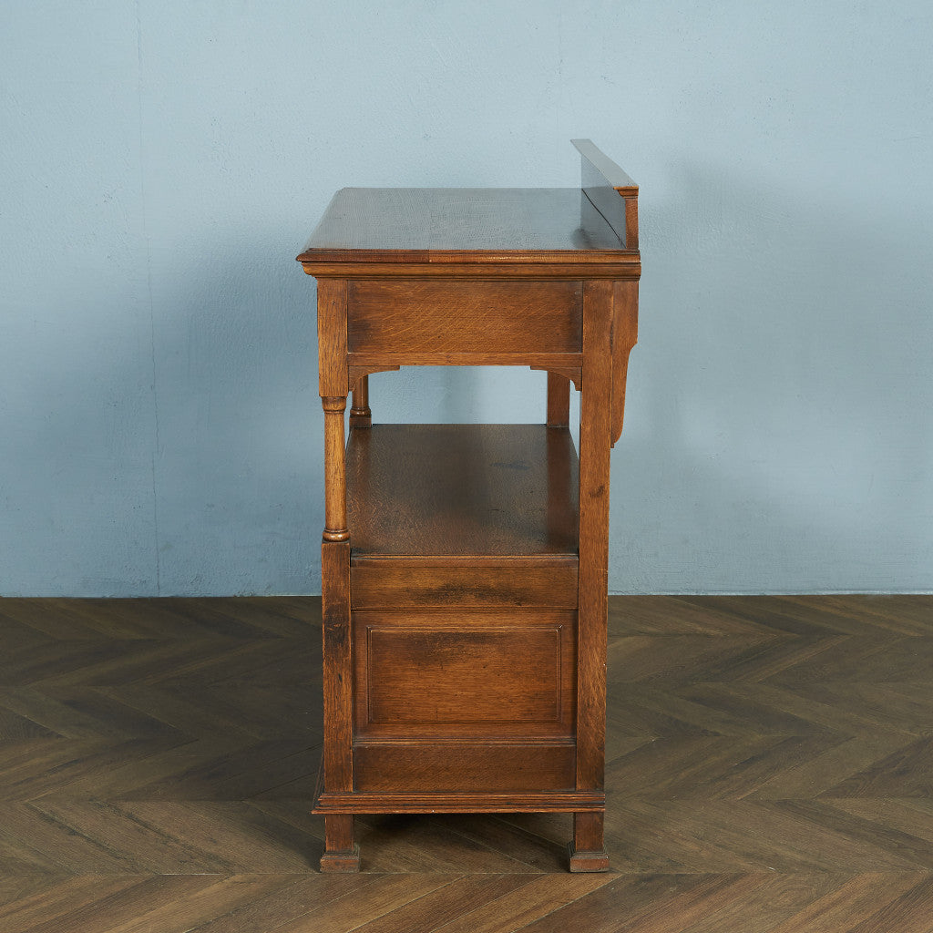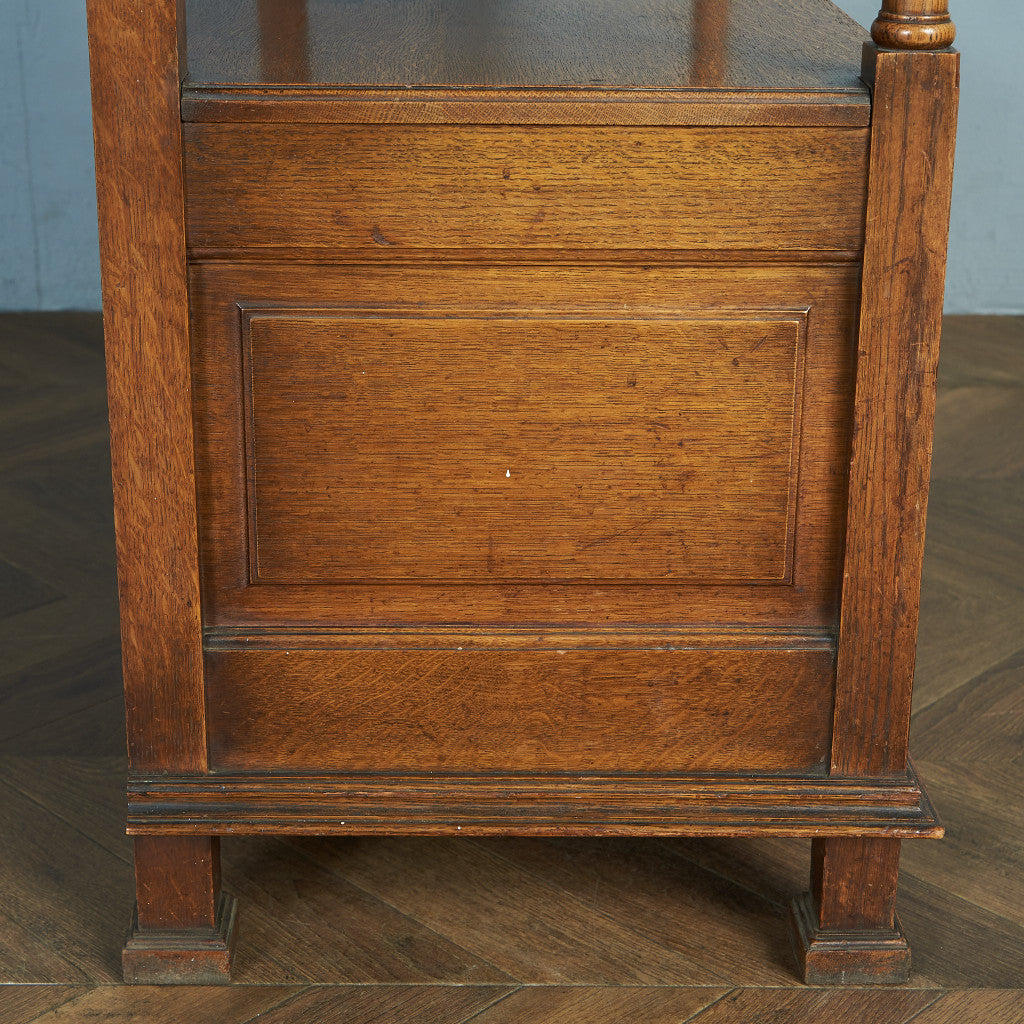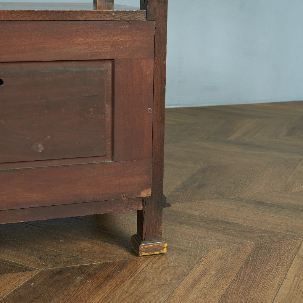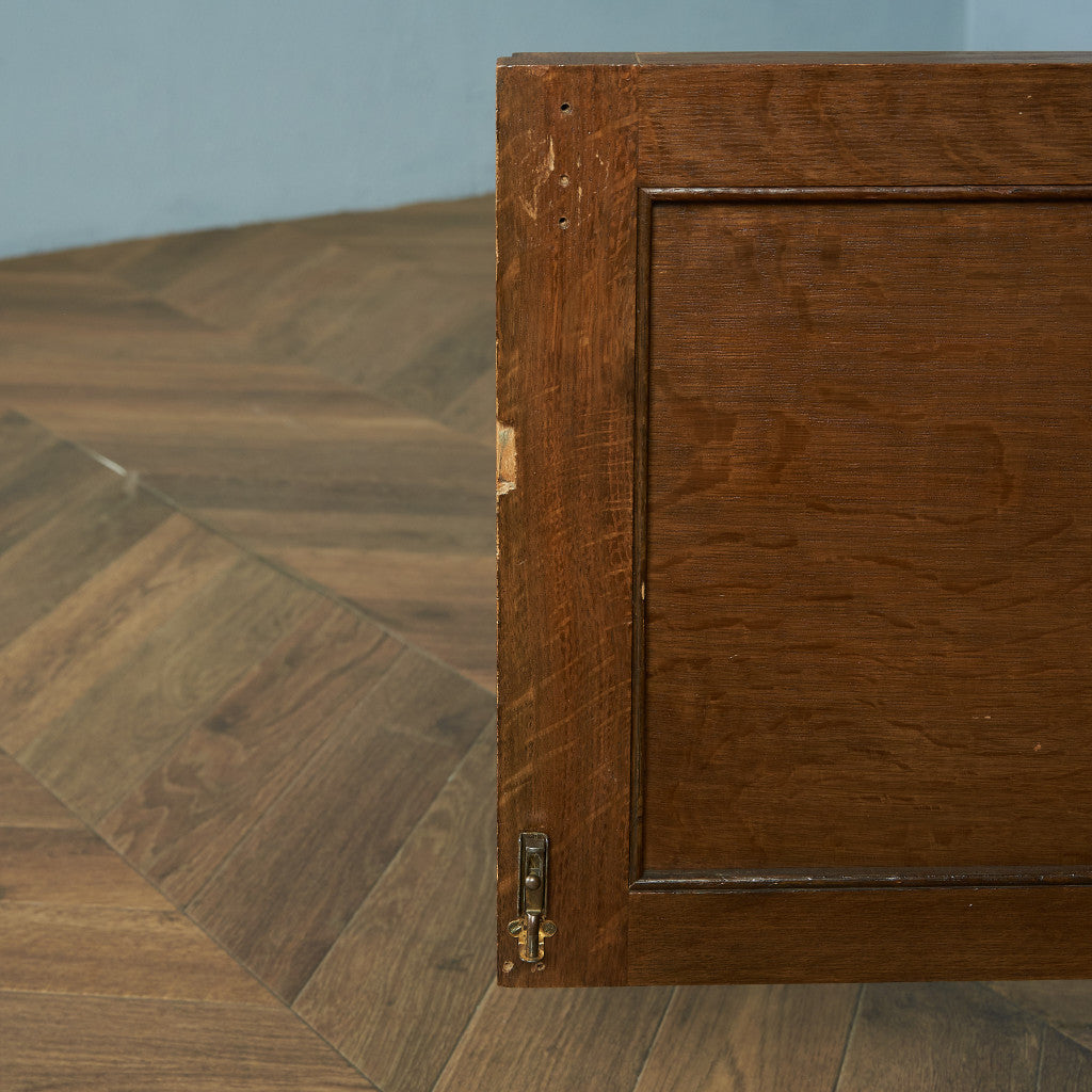 力強い木目のオーク材に金具取っ手がアクセントになった、エレガントな佇まいが魅力的。観音開きの扉収納や引き出し、オープン収納を備えた実用性の高い一品です。天板はちょっとした作業台としても便利にお使いいただけます。古き良き西欧の伝統を感じさせるクラシカルなデザイン、程よく古びた風合いが素朴で優しい雰囲気を演出します。