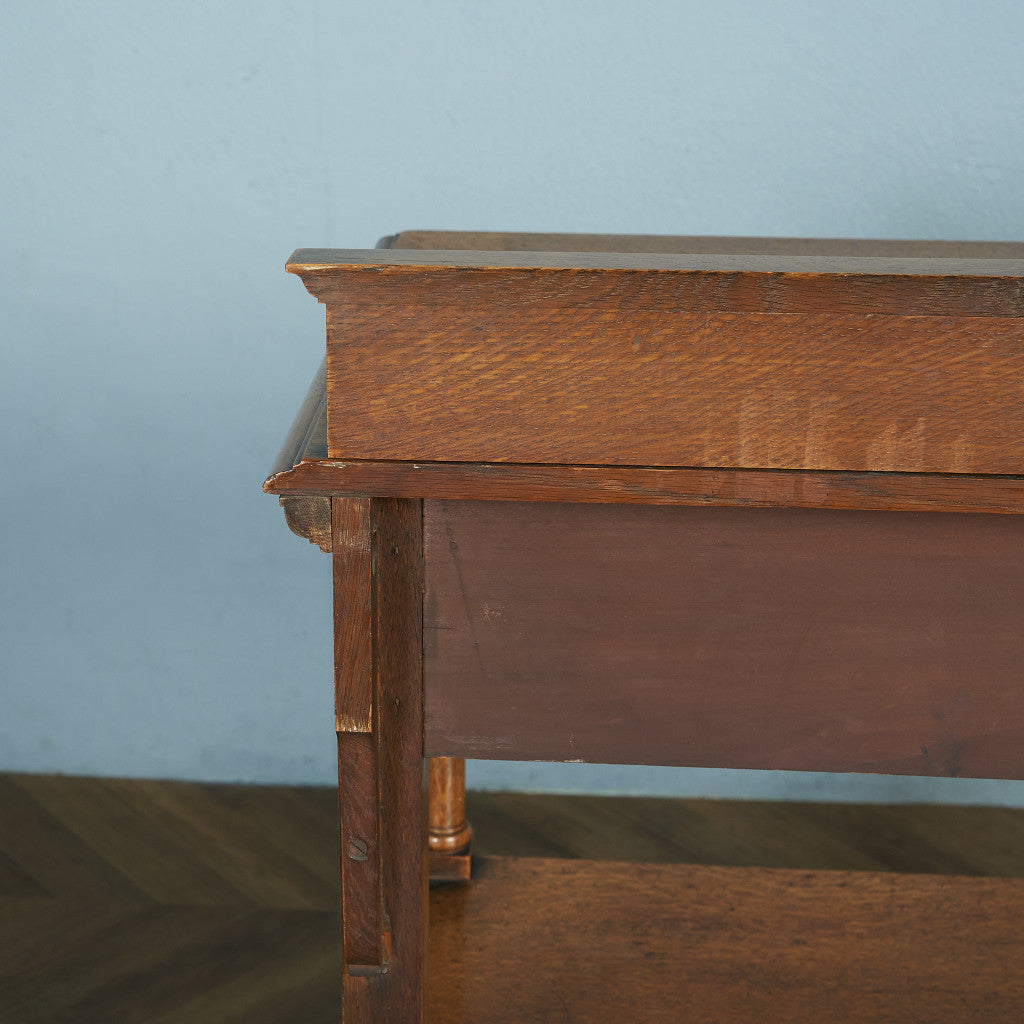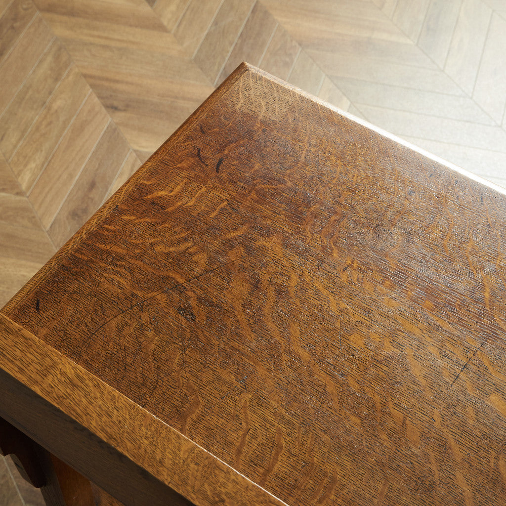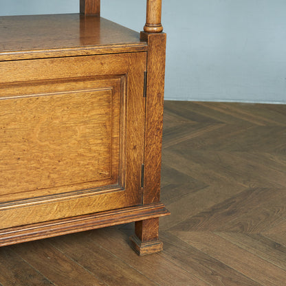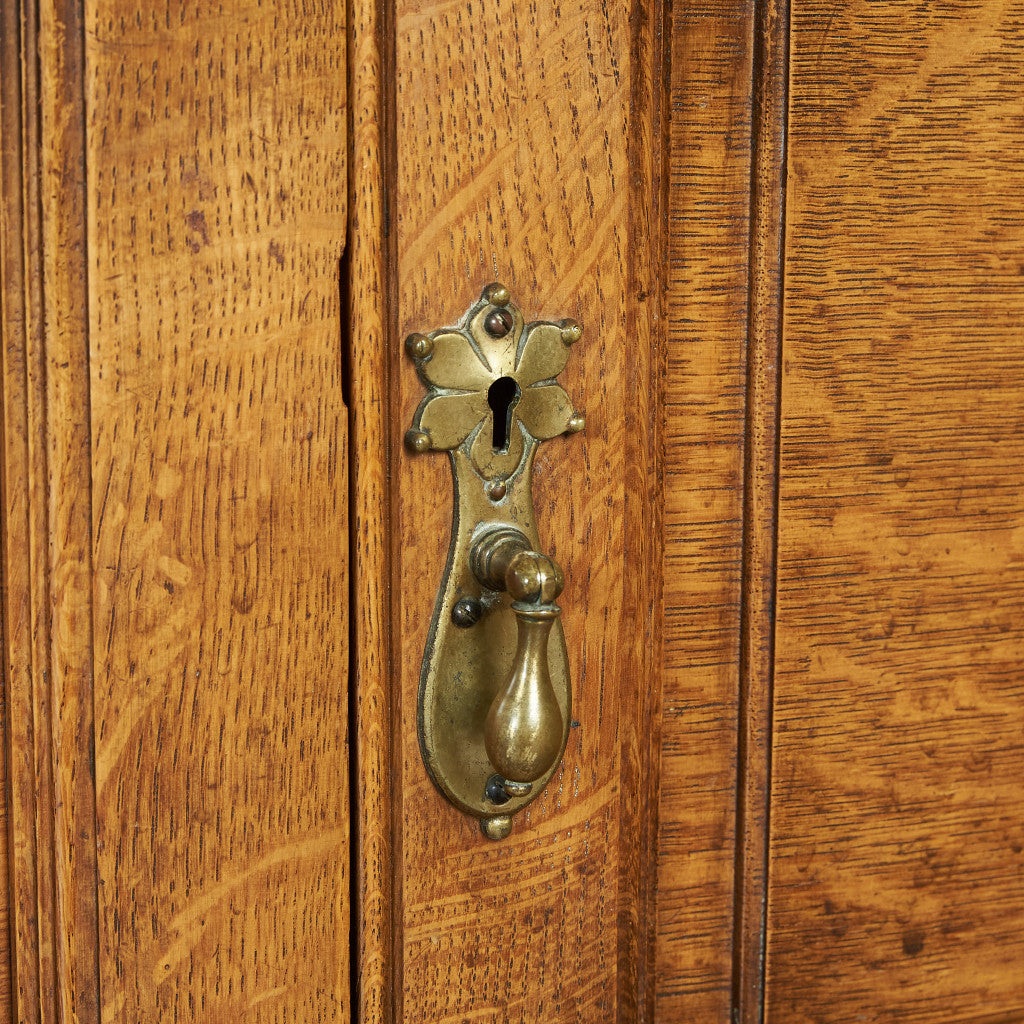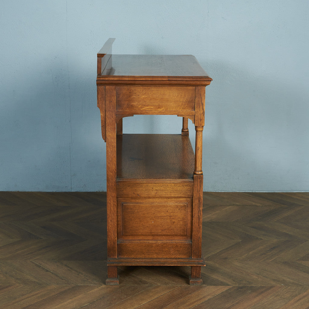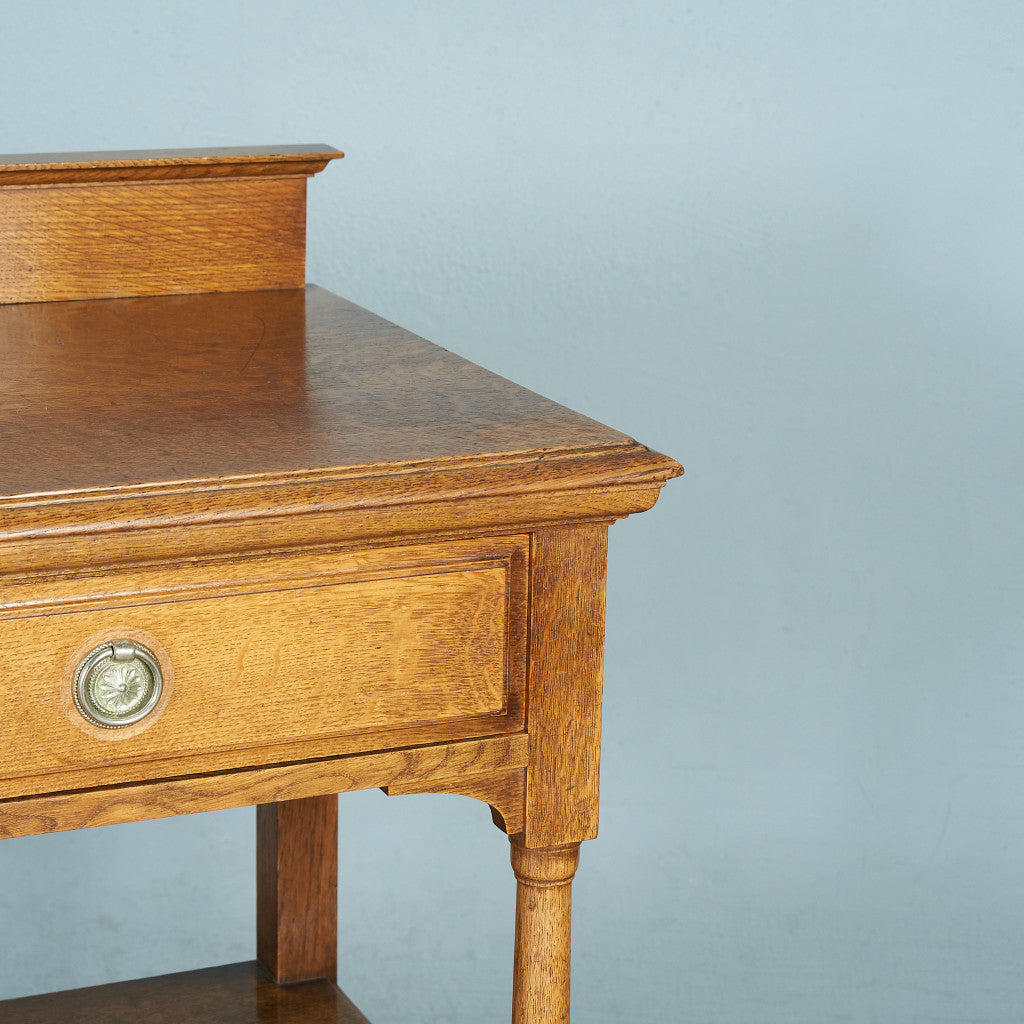 力強い木目のオーク材に金具取っ手がアクセントになった、エレガントな佇まいが魅力的。観音開きの扉収納や引き出し、オープン収納を備えた実用性の高い一品です。天板はちょっとした作業台としても便利にお使いいただけます。古き良き西欧の伝統を感じさせるクラシカルなデザイン、程よく古びた風合いが素朴で優しい雰囲気を演出します。