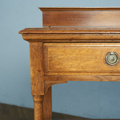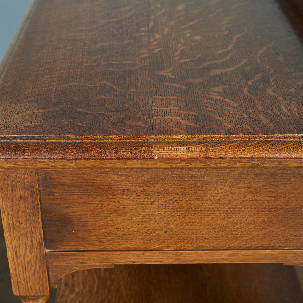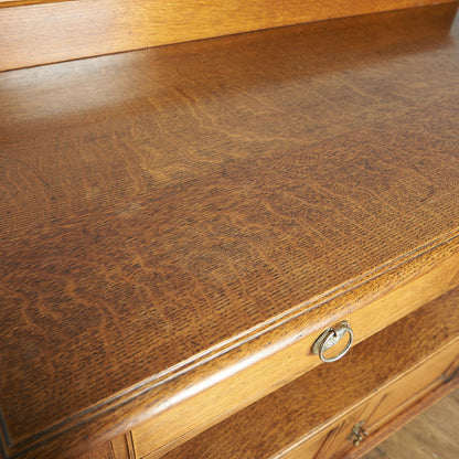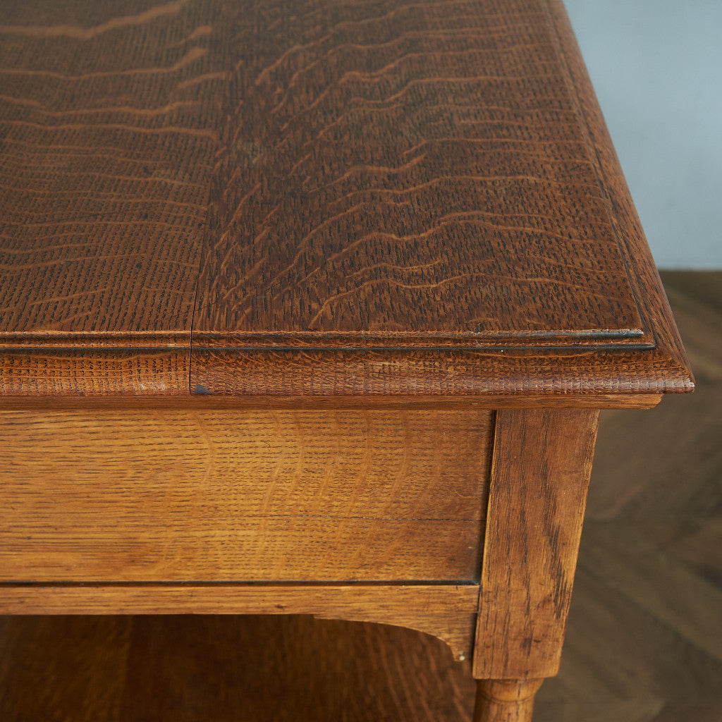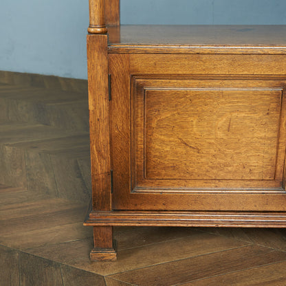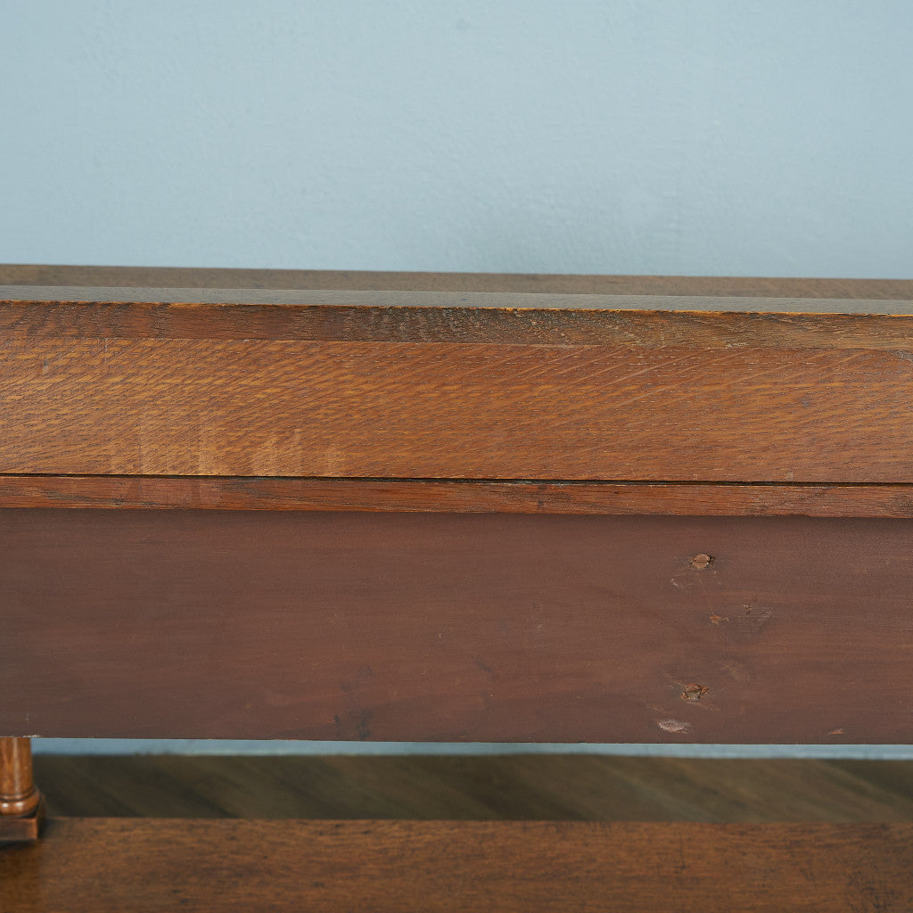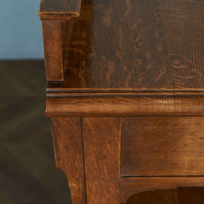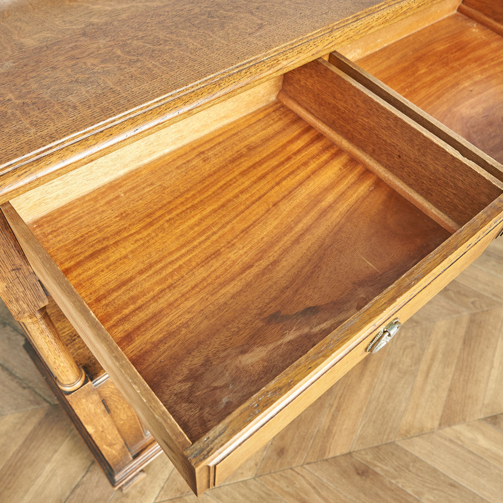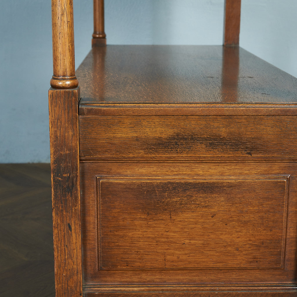 力強い木目のオーク材に金具取っ手がアクセントになった、エレガントな佇まいが魅力的。観音開きの扉収納や引き出し、オープン収納を備えた実用性の高い一品です。天板はちょっとした作業台としても便利にお使いいただけます。古き良き西欧の伝統を感じさせるクラシカルなデザイン、程よく古びた風合いが素朴で優しい雰囲気を演出します。