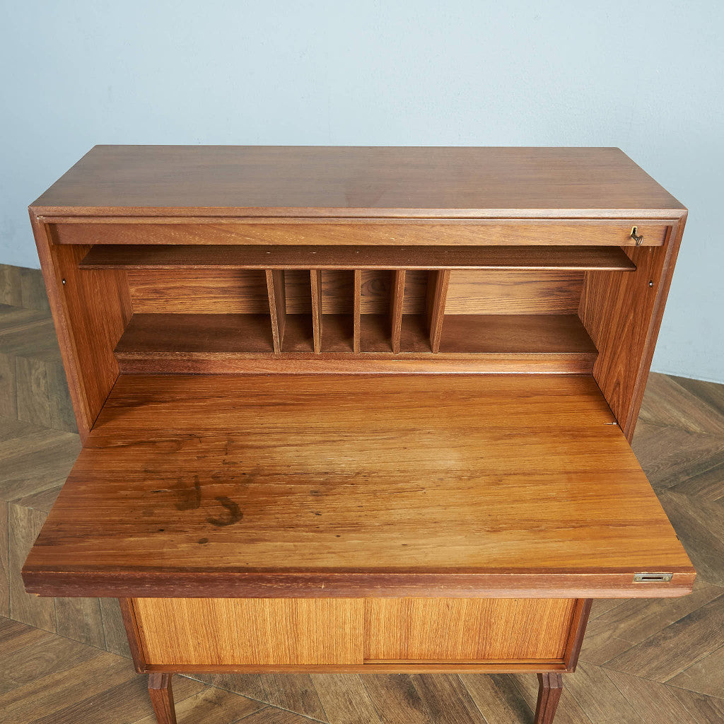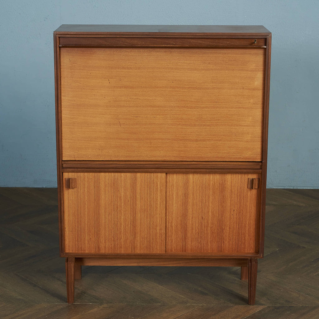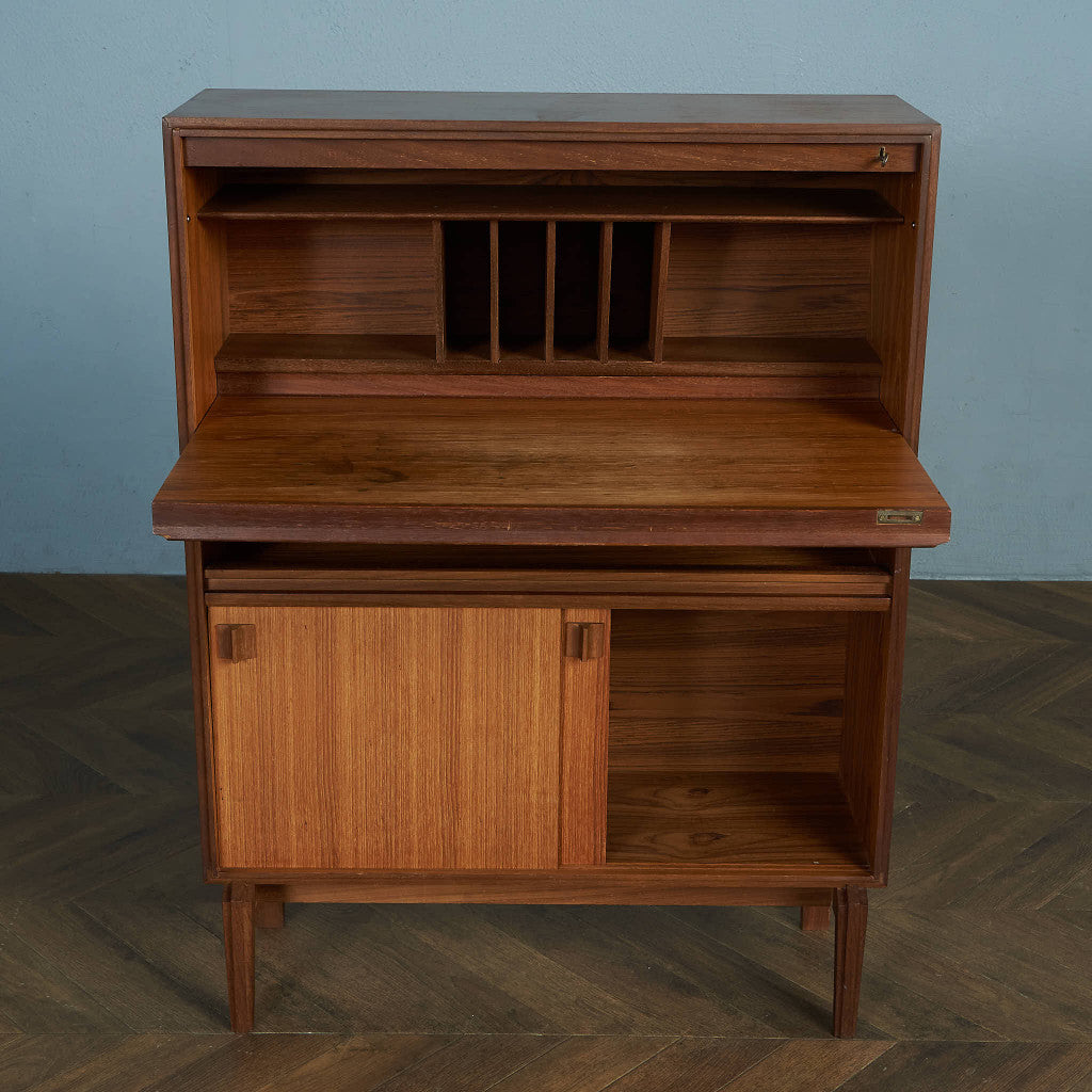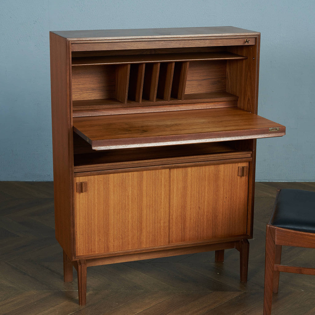 必要時に天板を展開することで空間の一角を書斎に変えるライティングビューロー。急な来客時など作業の途中でも天板をさっと閉じることで空間の美観を損ないません。現代の間取りでも使いやすいコンパクトなサイズ感の実用性の高いヴィンテージファニチャーです。