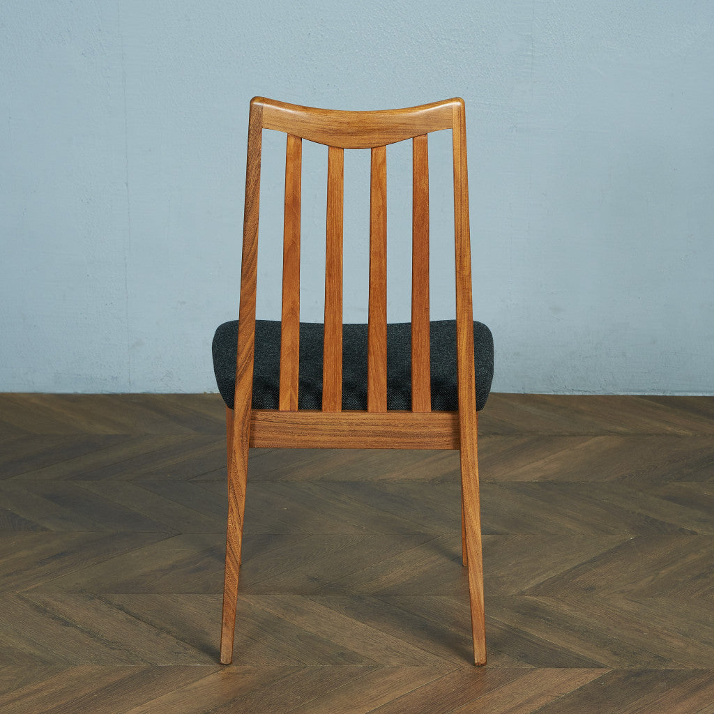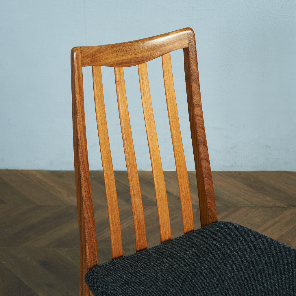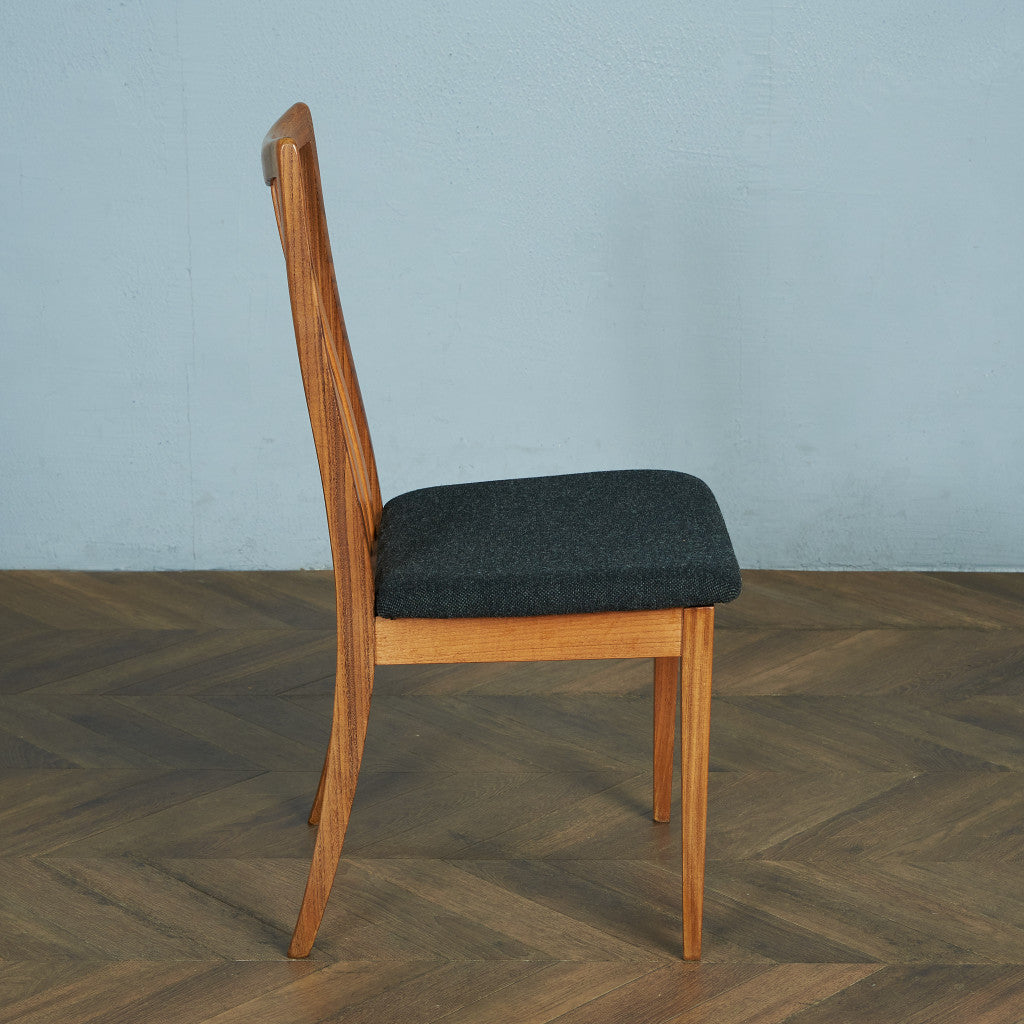 Leslie・G・ Dandy(レスリー・G・ダンディ)デザインのダイニングチェア。G-PLANを代表するチェアのひとつで、当時大ヒットした作品です。1972年の発売から1987年までの間、毎週2,000脚も製造されていました。スラット部分に明るい褐色のチーク材を使用、緩めのカーブが繊細さを感じさせつつも、シャープな印象になりすぎない、特別な魅力のあるチェアです。