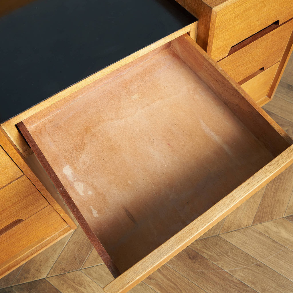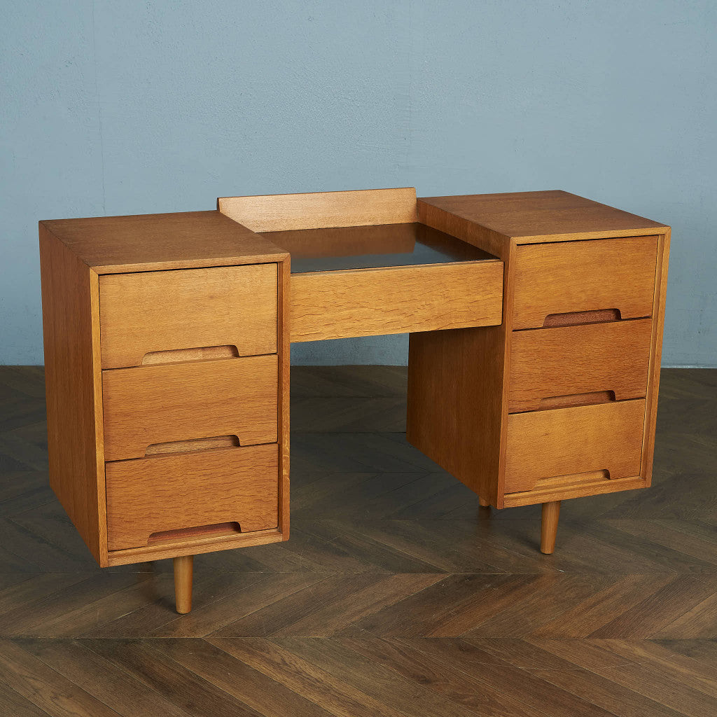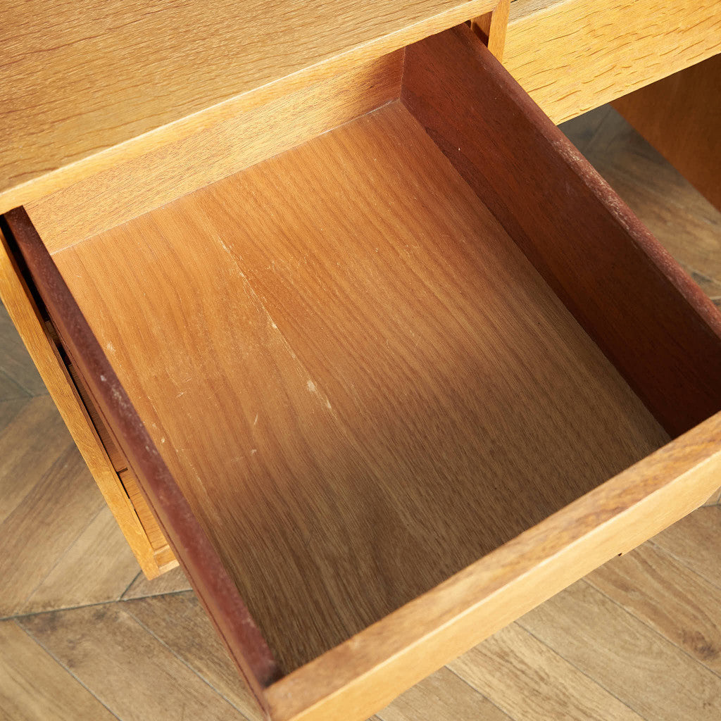 良質なオーク材使用の、洗練された佇まいが映えるドレッシングデスク。元々はドレッサーとして製造されたと思われますが、ミラーが無いので一般的なデスクとしてご使用いただけます。シンプルながらもデザイン製の高い印象的なお品です