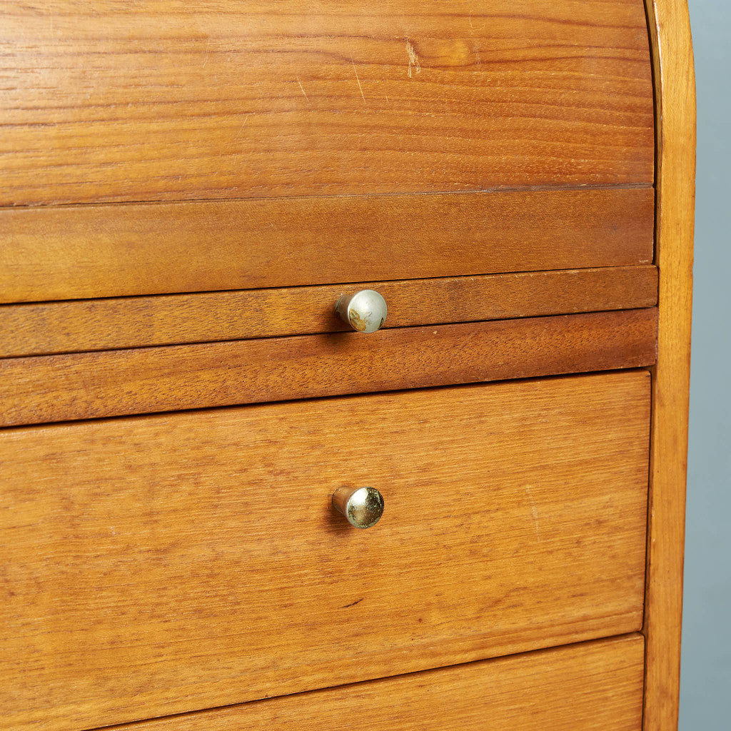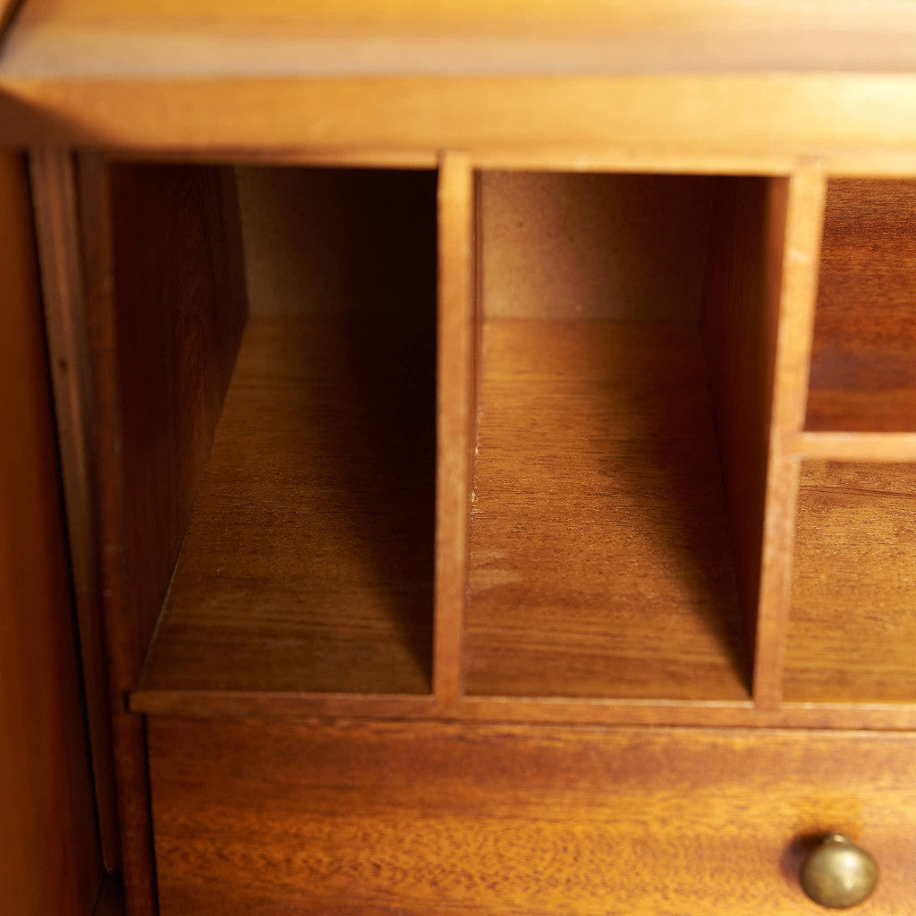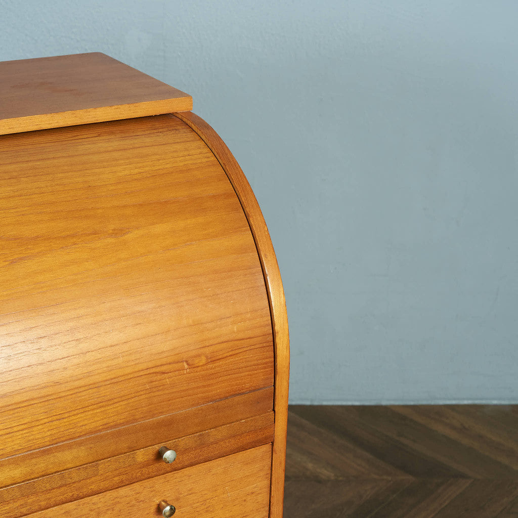 フォルムの美しさが際立つ、ロールトップのライティングビューロー。必要時に天板を展開することで空間の一角が書斎に変わる優れもの。急な来客時など作業の途中でも天板を閉じることで空間の美観を損ないません。ヴィンテージチークの美しい木肌に金具取っ手がアクセントになった、シンプルながらもデザイン製の高い印象的なお品です。