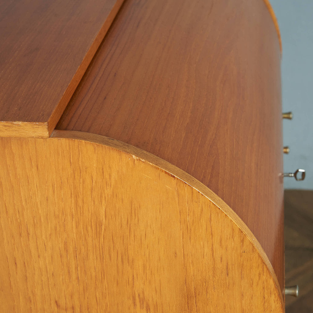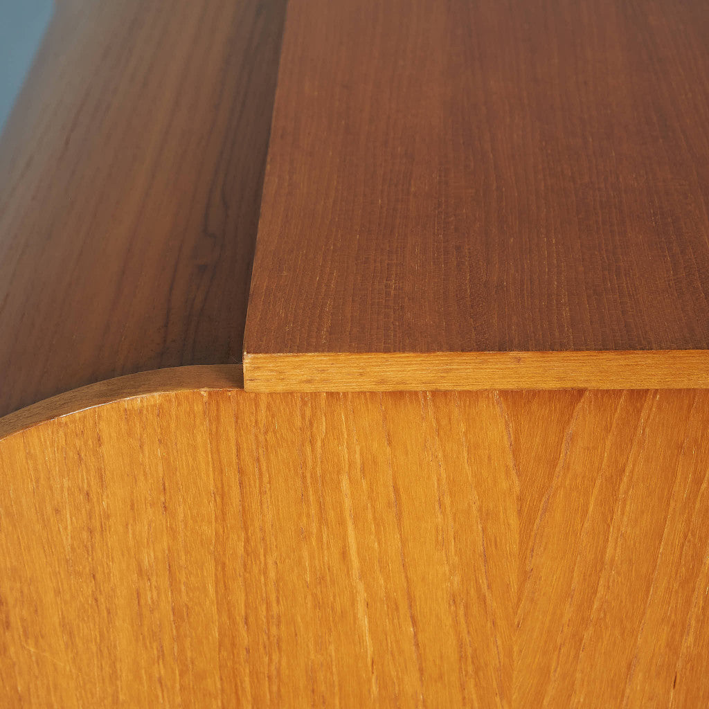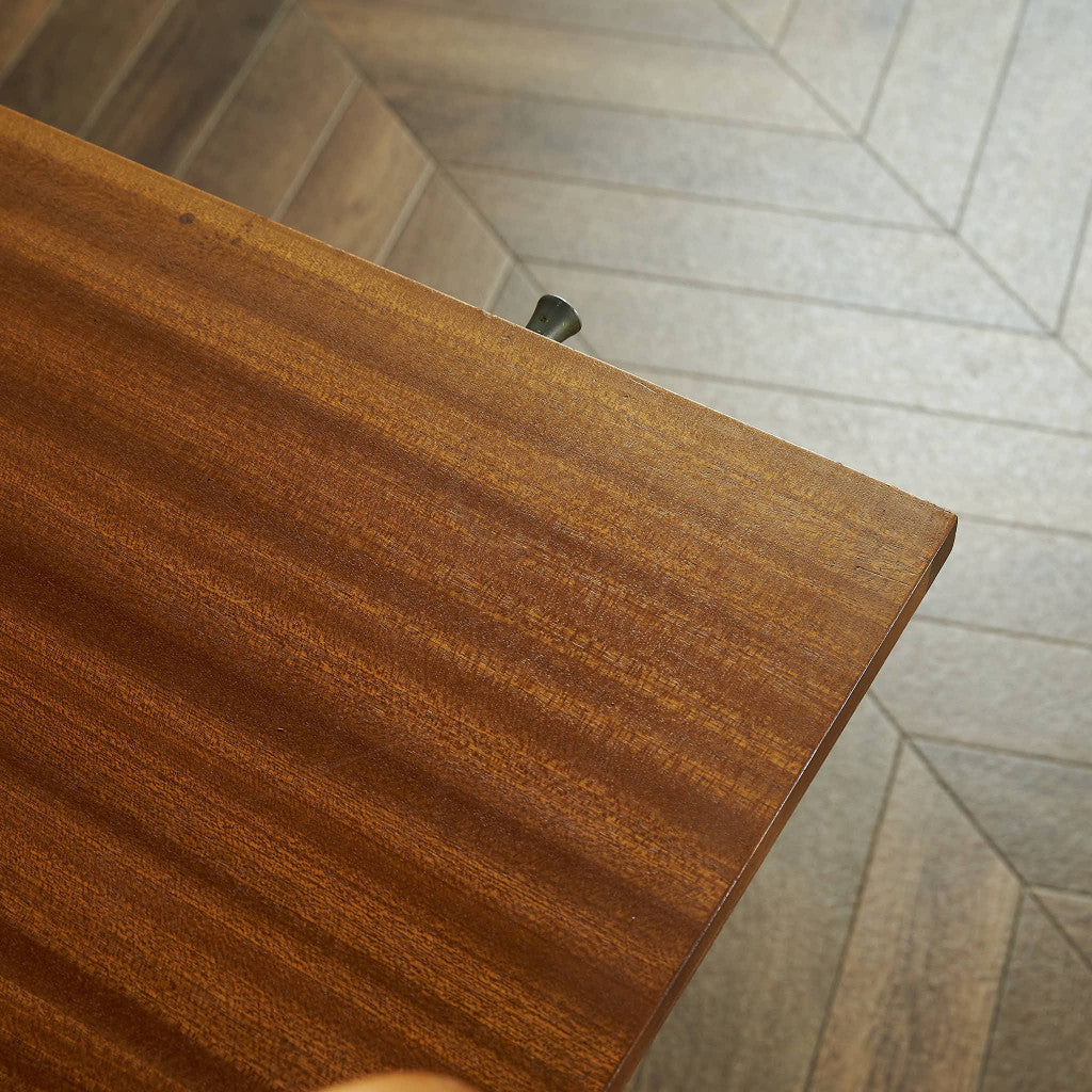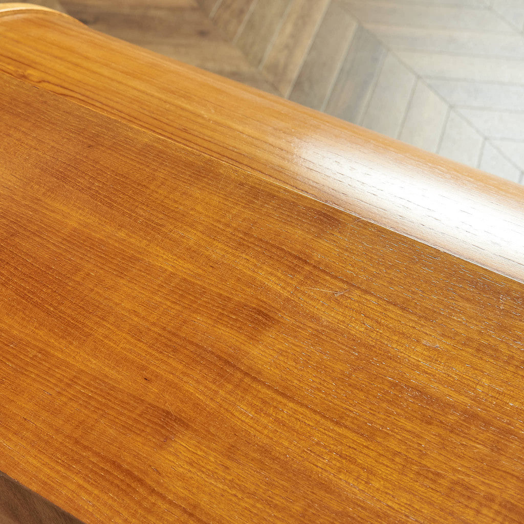 フォルムの美しさが際立つ、ロールトップのライティングビューロー。必要時に天板を展開することで空間の一角が書斎に変わる優れもの。急な来客時など作業の途中でも天板を閉じることで空間の美観を損ないません。ヴィンテージチークの美しい木肌に金具取っ手がアクセントになった、シンプルながらもデザイン製の高い印象的なお品です。
