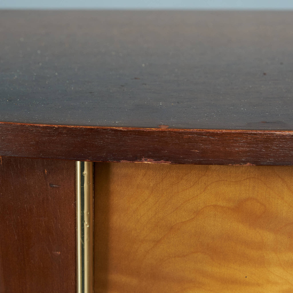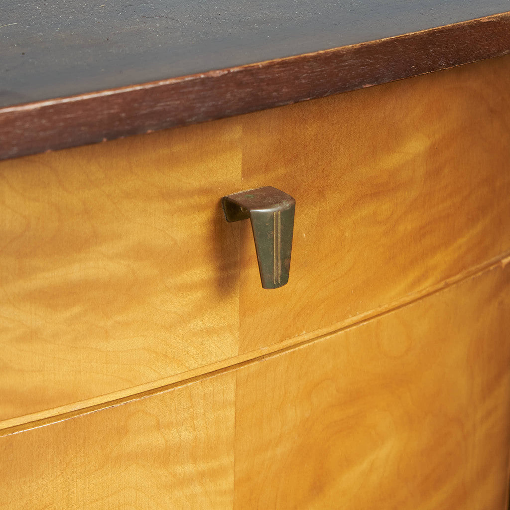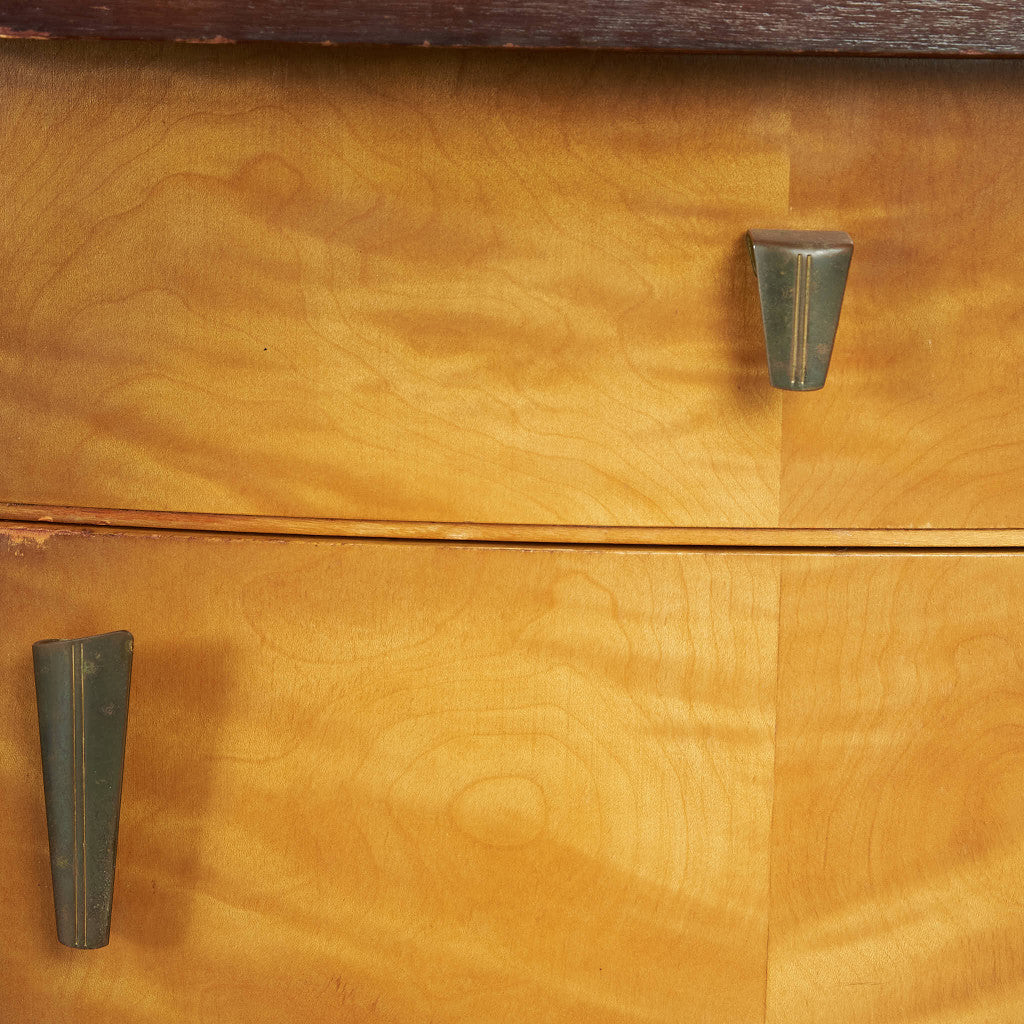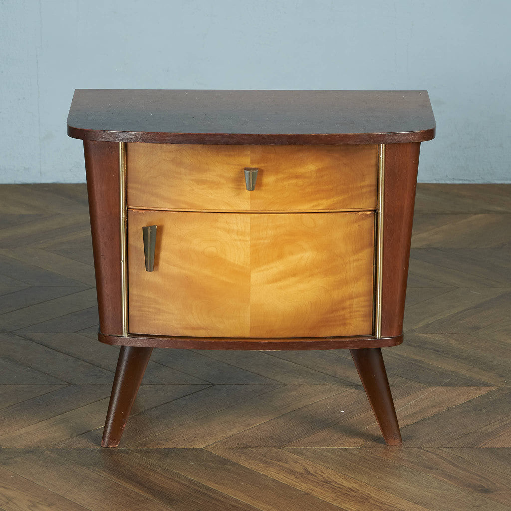 濃淡のある天然木のコントラストがモダンな印象のベッドサイドキャビネット。サイドから中央にかけてゆるやかにカーブした前面デザインや、洗練された印象の取っ手、テーパードレッグなど、美しい仕上がりが魅力です。細部に作り手のこだわりが感じられる上質なお品です。