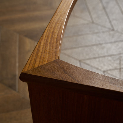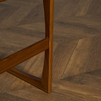 フランスのスクエア(四角)になって踊る古典舞踊、Quadrilleの名前を冠する1965年発表のG-PLAN Quadrilleシリーズ。Frescoシリーズと同じく60年代のデンマークデザインを源泉にもち、美しい褐色のチーク材を使用。四方を面取りされた樽型取手、内側に緩やかな弧を描き外形を四角に組まれた美しい形状の脚が特徴です。