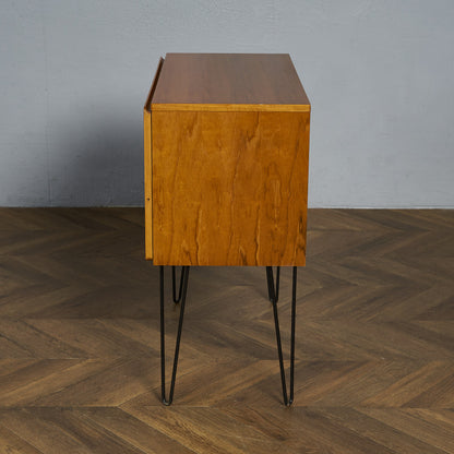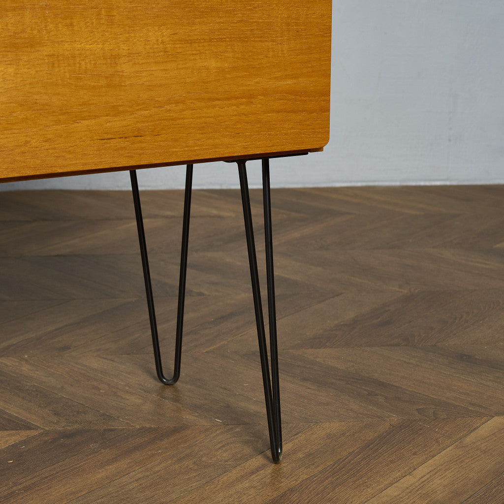 シンプルでスタイリッシュなデザインが魅力的なBEAVER & TAPLEY社のキャビネット。ヘアピンレッグと呼ばれる鉄製の脚でカスタマイズされ、より現代的でインダストリアルな雰囲気に生まれ変わっています。小さな文庫書籍や食器、コレクションなどの収納に最適な一品です。実用的でありながらも作り手のこだわりを感じさせる、北欧の年代物とも相性の良いヴィンテージファニチャーです。