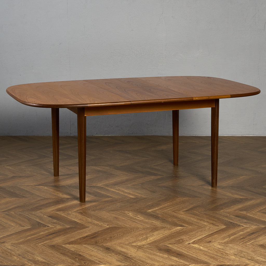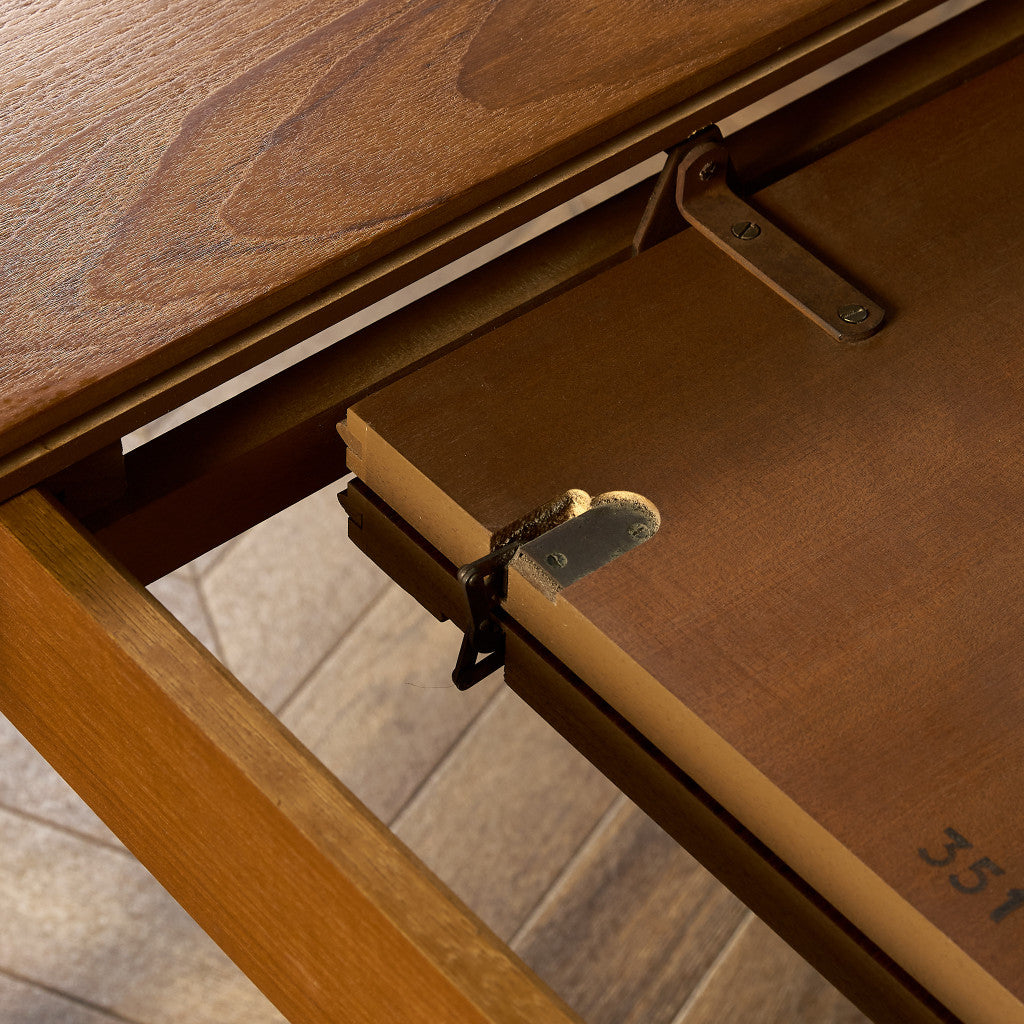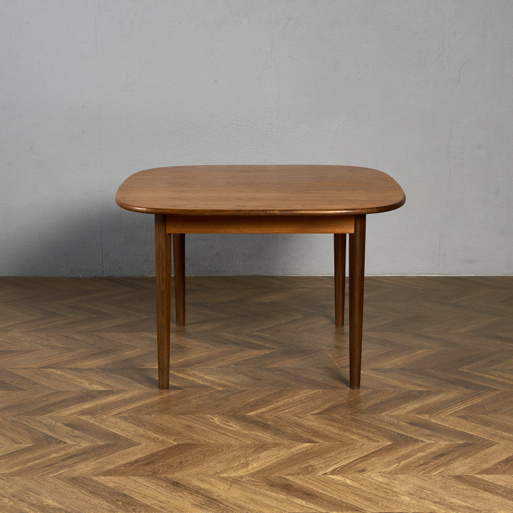 チーク材が使用された、ベーシックかつ汎用性の高いダイニングテーブル。 天板下に収納された拡張天板を中央に展開させることでテーブルの上はそのままに簡単にサイズの拡張が可能なエクステンションテーブルです。普段は2人〜4人用、来客時などは天板をさっと広げて6人用としてお使いいただけます。