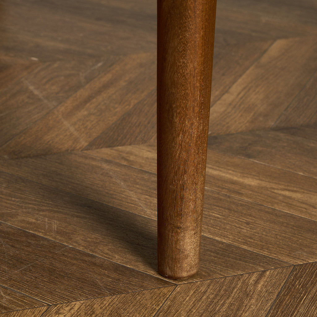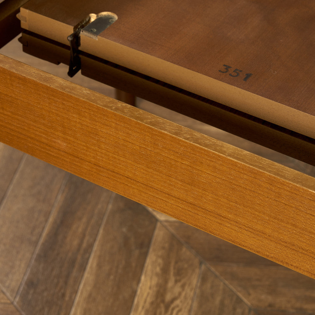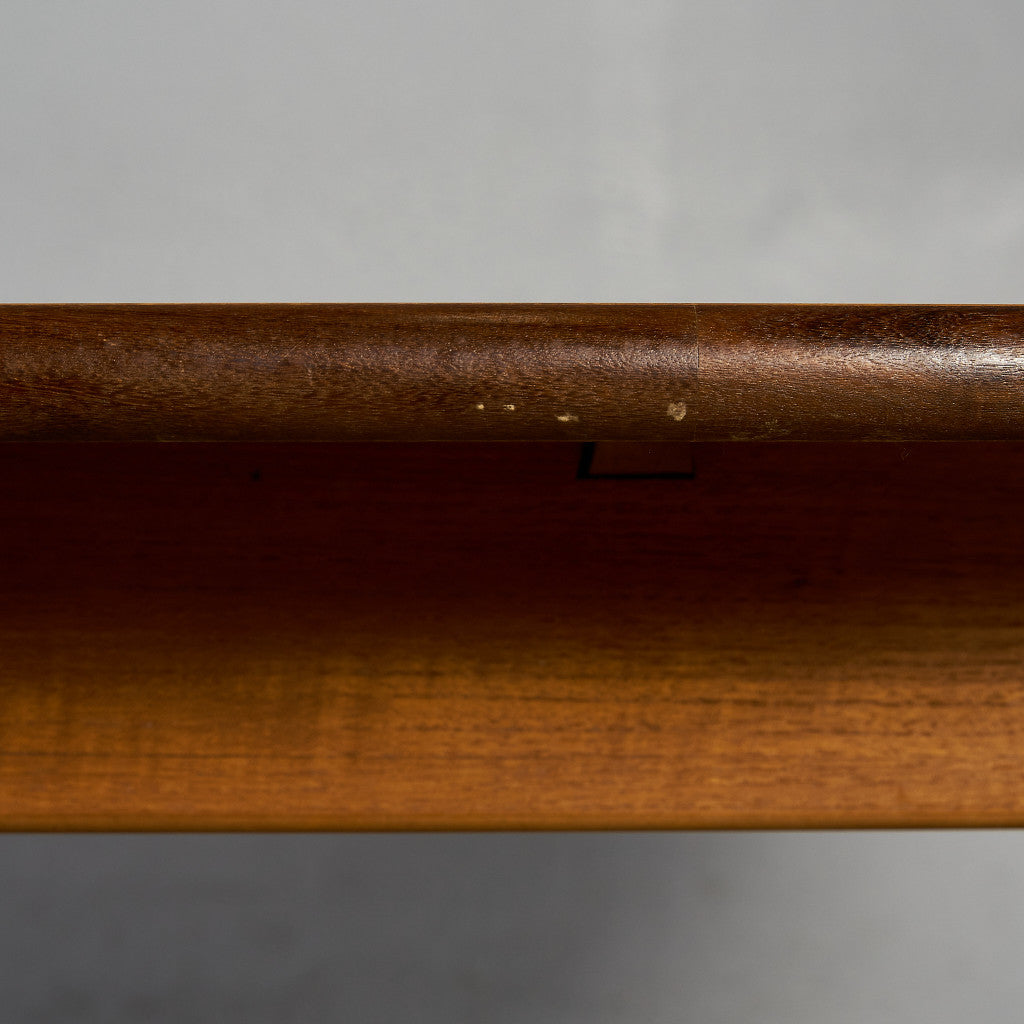 チーク材が使用された、ベーシックかつ汎用性の高いダイニングテーブル。 天板下に収納された拡張天板を中央に展開させることでテーブルの上はそのままに簡単にサイズの拡張が可能なエクステンションテーブルです。普段は2人〜4人用、来客時などは天板をさっと広げて6人用としてお使いいただけます。