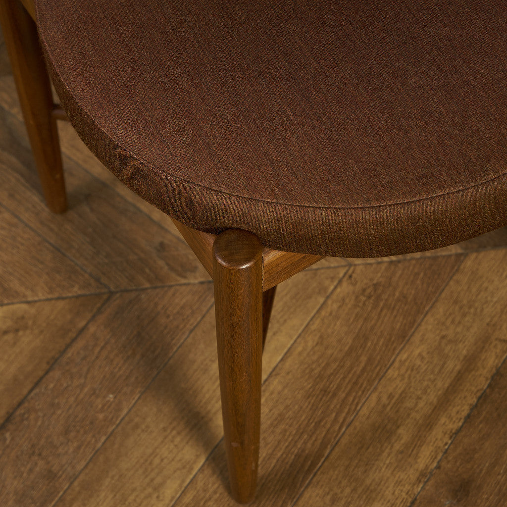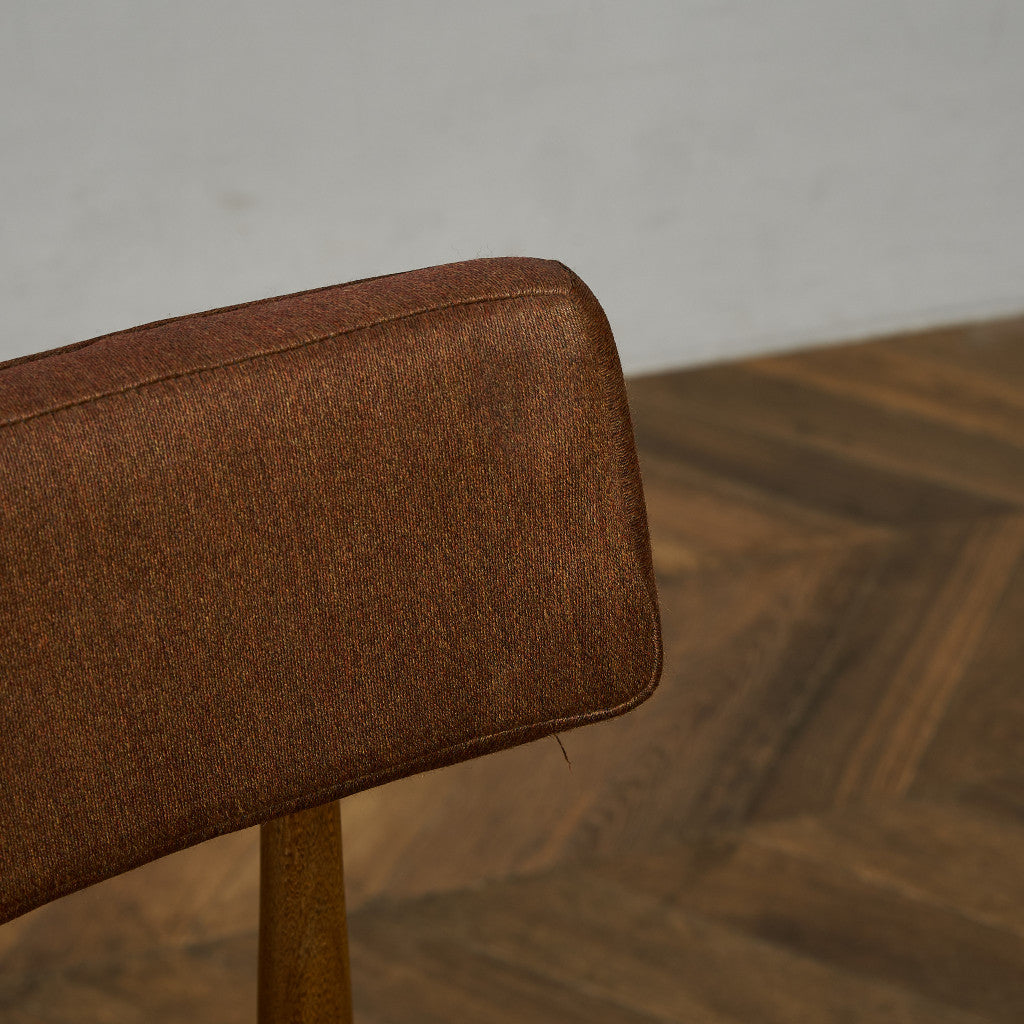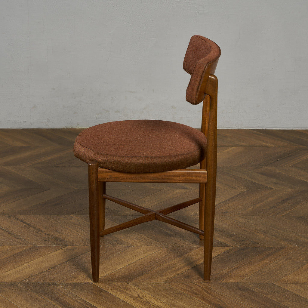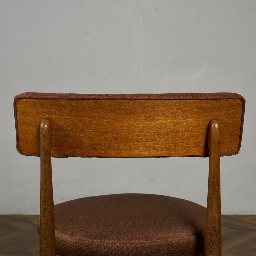 フレスコシリーズのダイニングチェアの中でも最も人気が高い定番モデル。クッション性の高い丸座とクッション付きの背もたれを備えており座り心地はピカイチ。うっすらと弧を描く背もたれの曲線はG-PLANのラウンドダイニングテーブルのエッジラインに合わせることで一体感のあるコーディネートが可能。脚からプライウッドの背もたれへ続くなめらかなラインが非常に美しいため背面から見ても非常に絵になる椅子です。