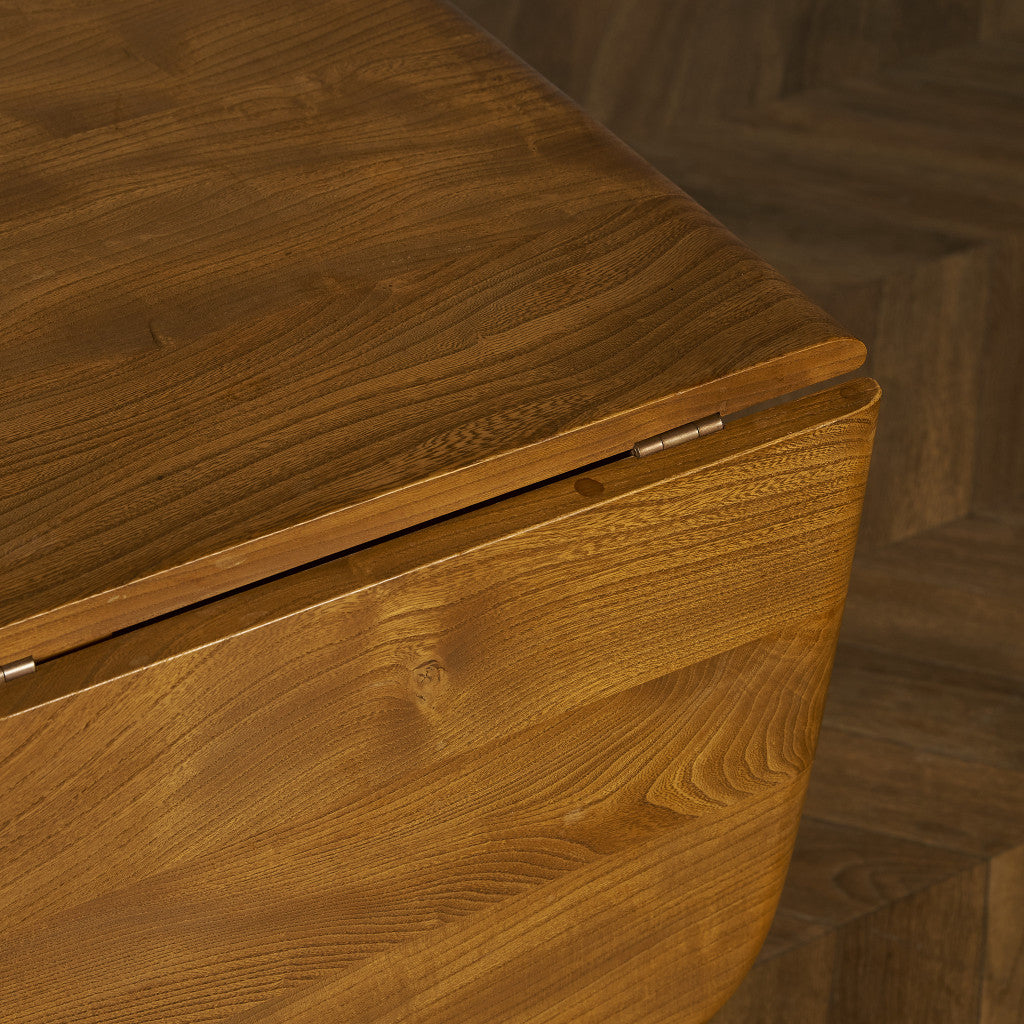 ウィングの部分を広げるとレクタングルのテーブルトップになり、たたむとほぼ正方形となります。片側だけたたむ事もできます。パーティーなどでお客様が見えたりする時には広げて、普段お使いの際にはコンパクトにたたんで使用するなど、シチュエーションで使い分ける事ができるテーブルです。現在でも人気のあるこのテーブルは、2017年に復刻版が発売されました。復刻版は折りたたみの天板を支える支柱がアルミに変更されています。