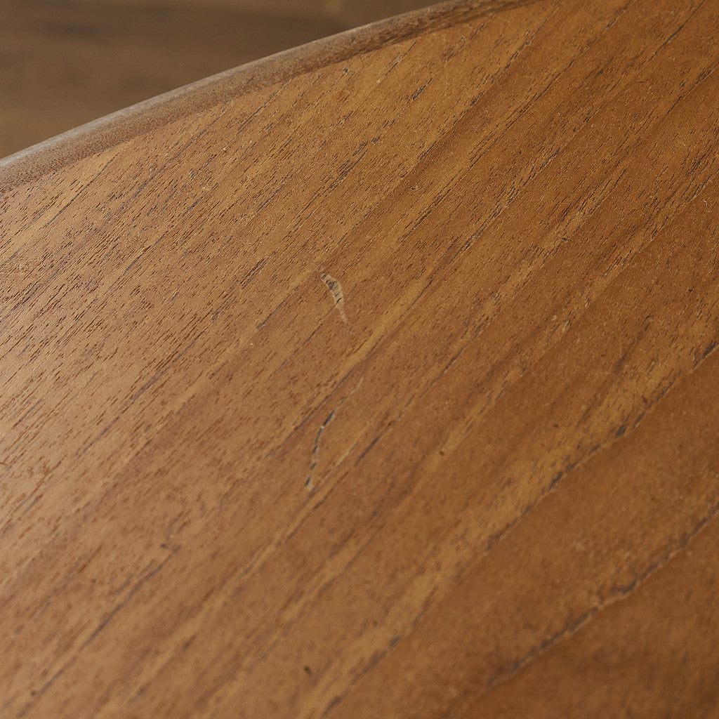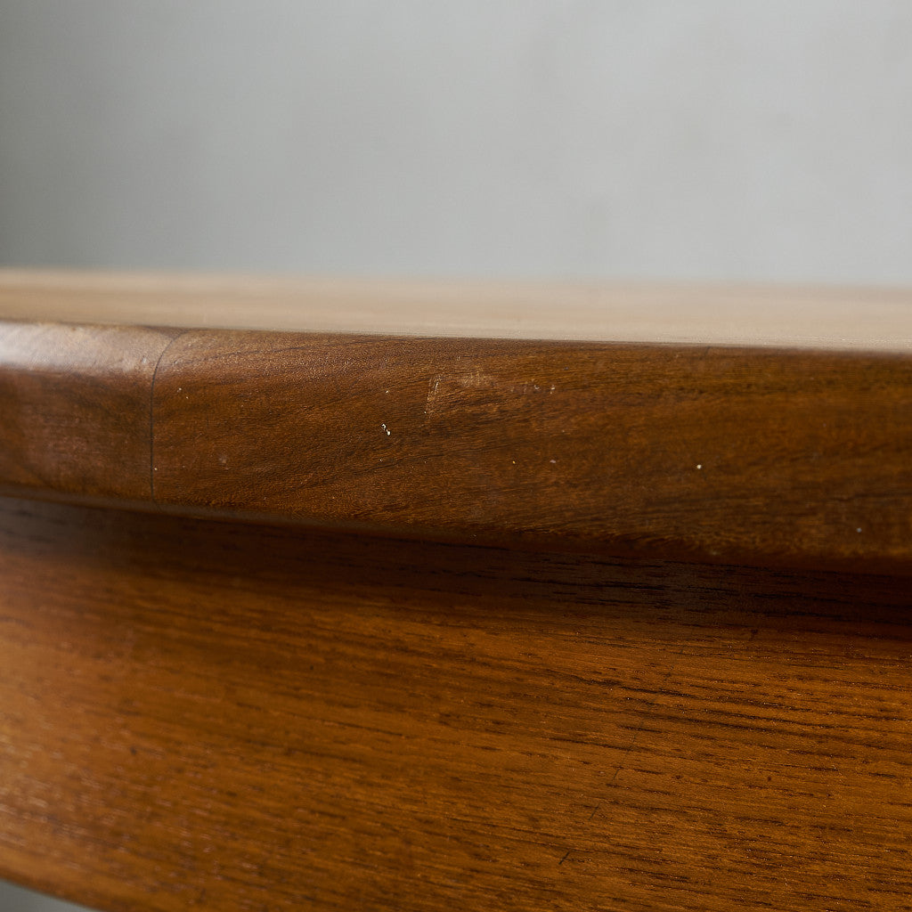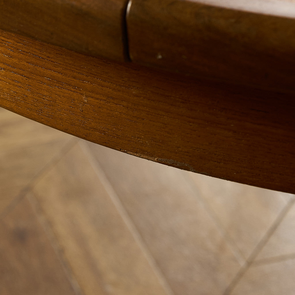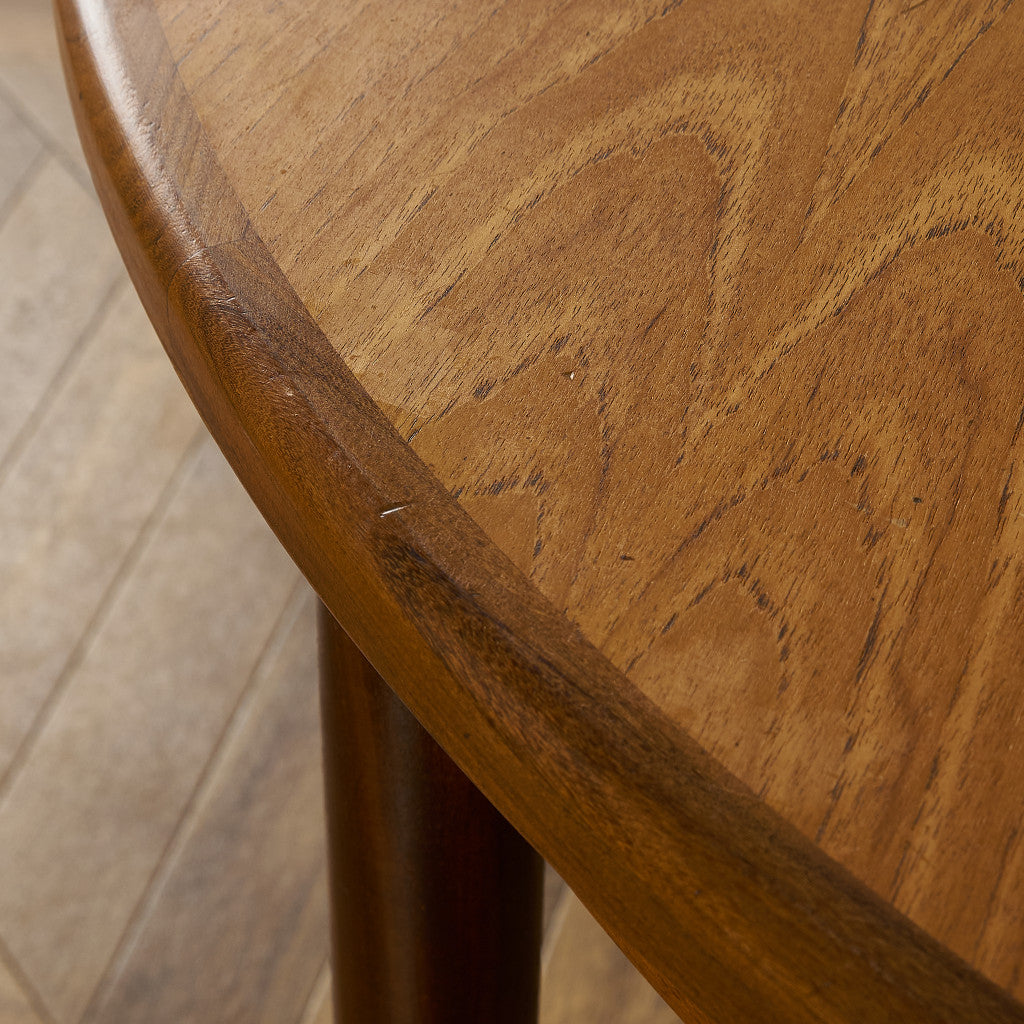 ミッドセンチュリーG-PLANコレクションの中心とも言える定番モデルのラウンドエクステンションテーブル。G-PLANのカタログにおいてもフレスコ、シエラ、ダニッシュ等のチーク材を用いたシリーズで横断的に組み合わせられるベーシックかつ汎用性の高いテーブルです。トップにはチーク、脚と縁には濃色の材を用いたバイカラー仕様。天板下に収納された拡張天板を中央に展開させることでテーブルの上はそのままに簡単にサイズの拡張が可能なエクステンションテーブルです。普段は2人〜4人用、来客時などは天板をさっと広げて6人用としてお使いいただけます。