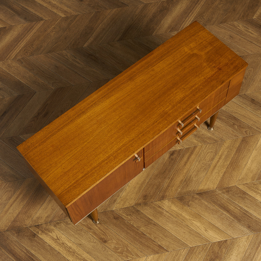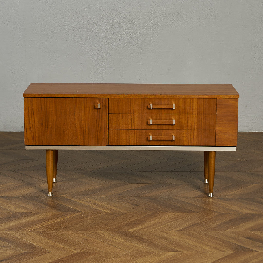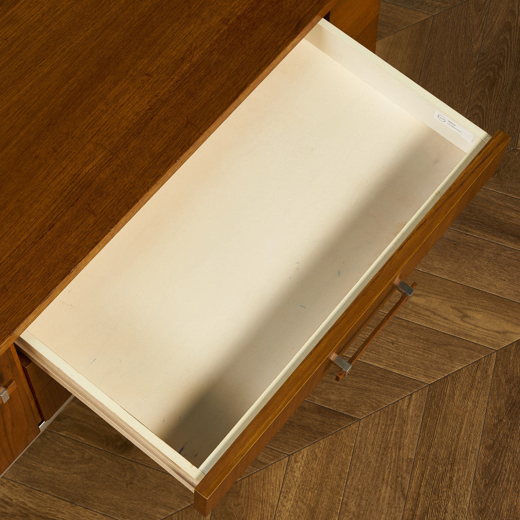 デンマークスタイルに独自のアレンジが施された、希少性の高いベルギー製のサイドボード。英国ミッドセンチュリー家具とは一味違う、個性的なデザインが印象的です。実用性の高さと使いやすいスケール感を備えた一品です。