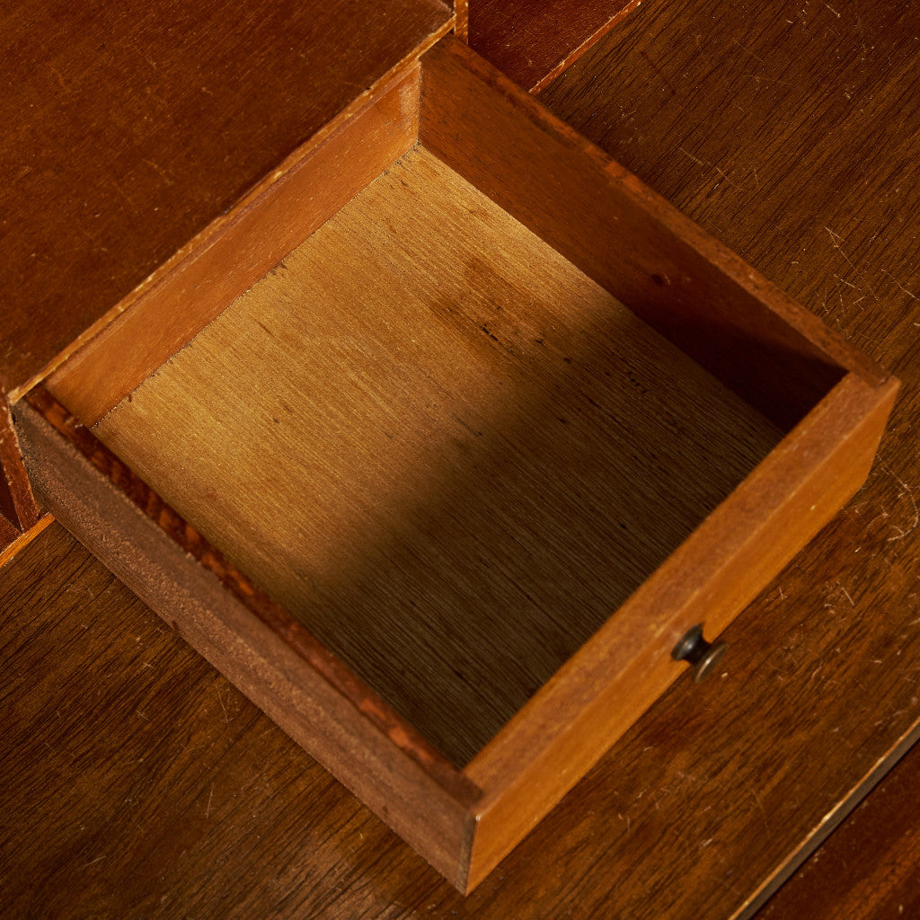 必要時に天板を展開することで空間の一角を書斎に変えるライティングビューロー。急な来客時など作業の途中でも天板をさっと閉じることで空間の美観を損ないません。