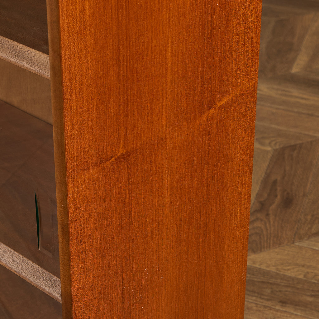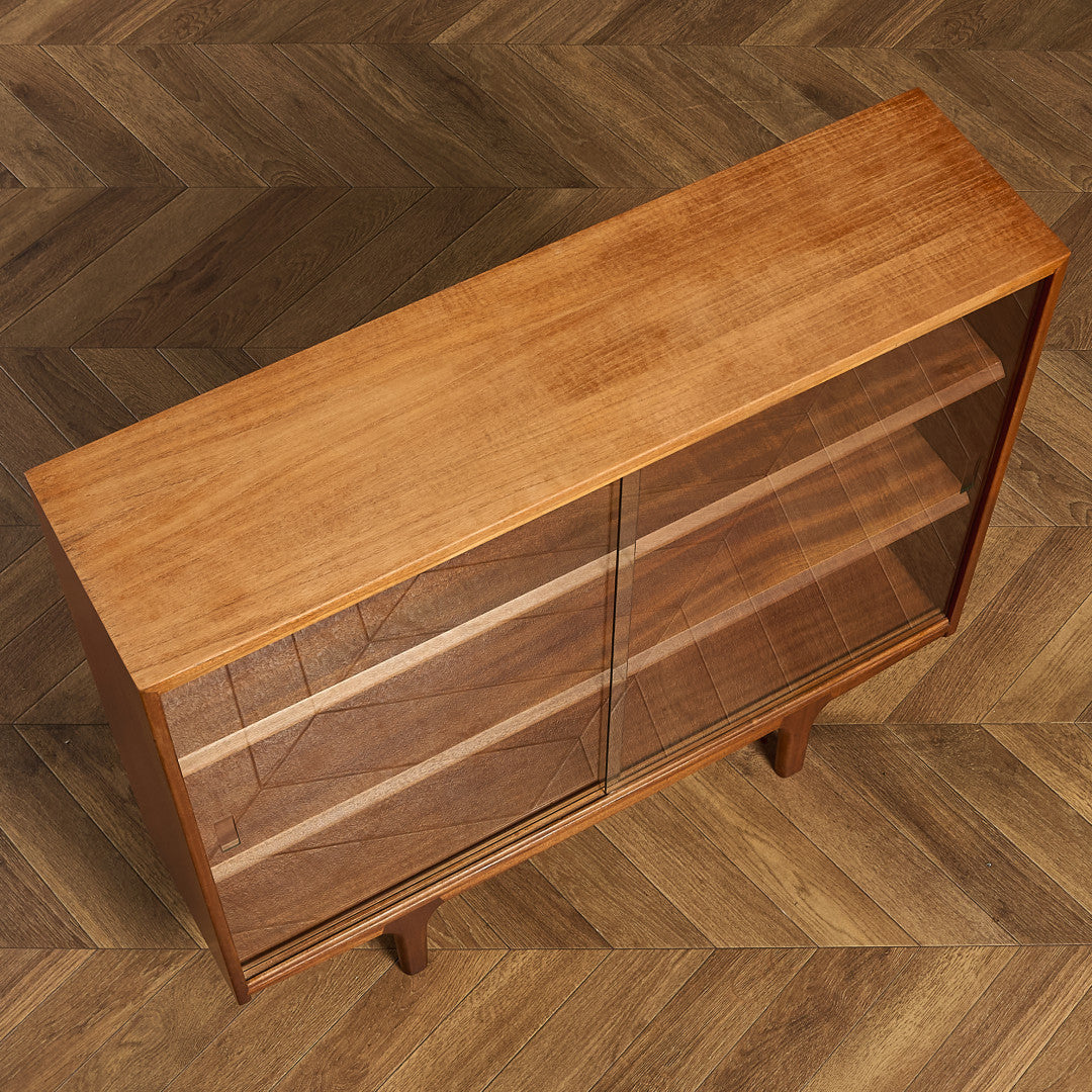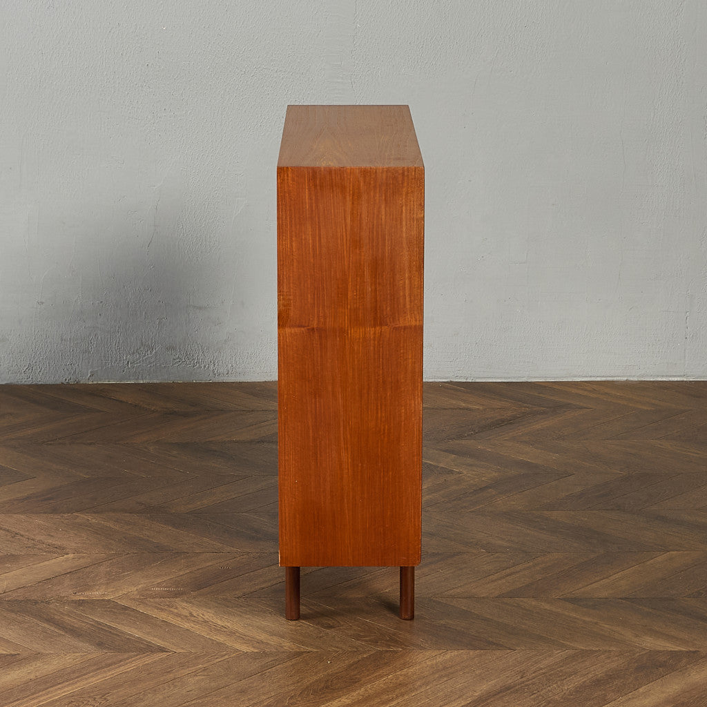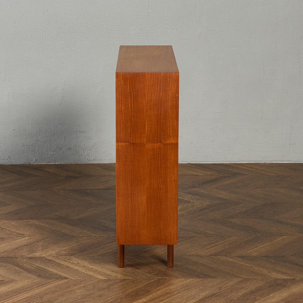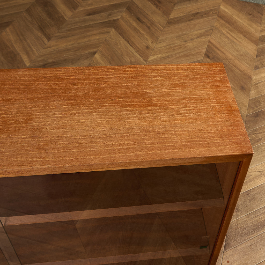 チーク材のあたたかな質感、洗練されたデザインが印象的。奥行きが浅いので限られたスペースでの文庫書籍や食器、コレクションなど見せる収納に最適です。実用的でありながらも作り手のこだわりを感じさせるヴィンテージファニチャーです。