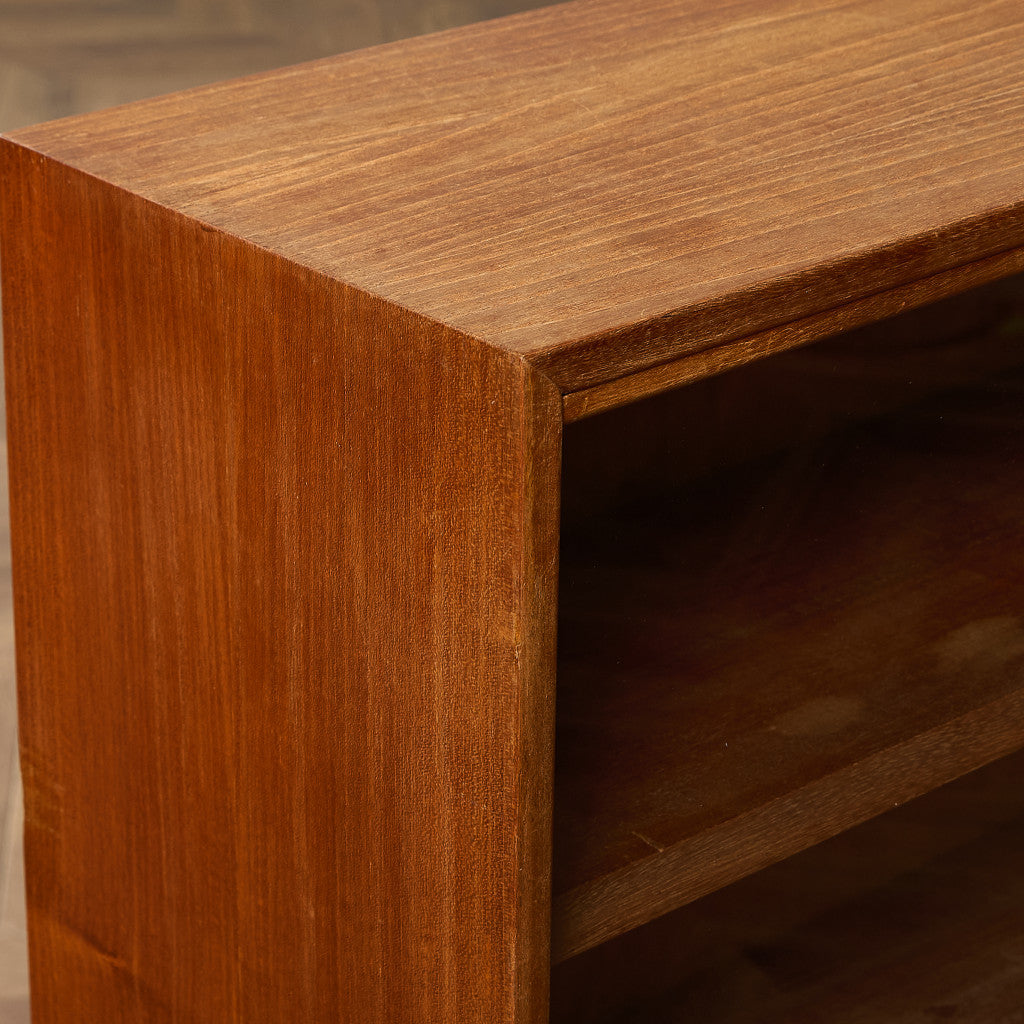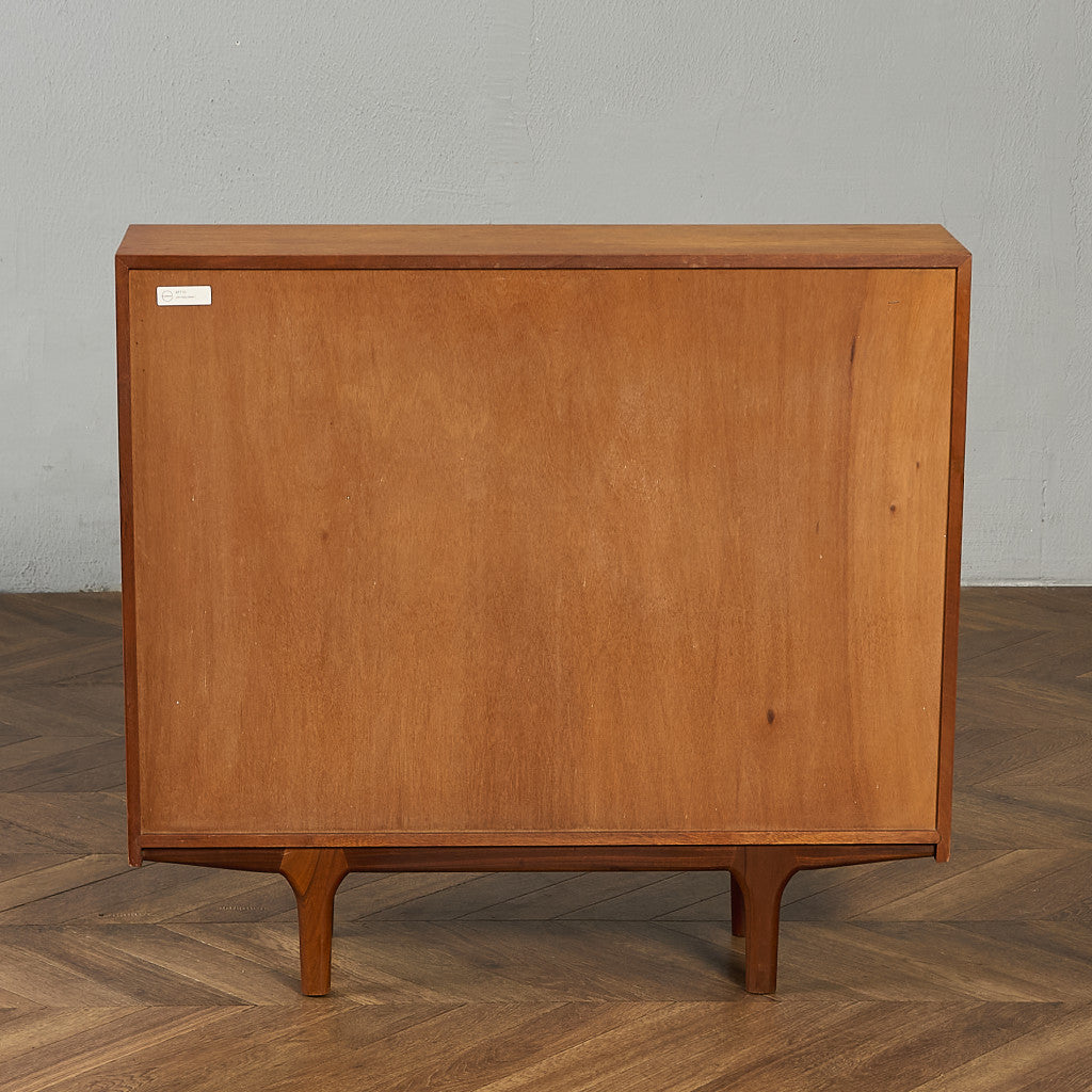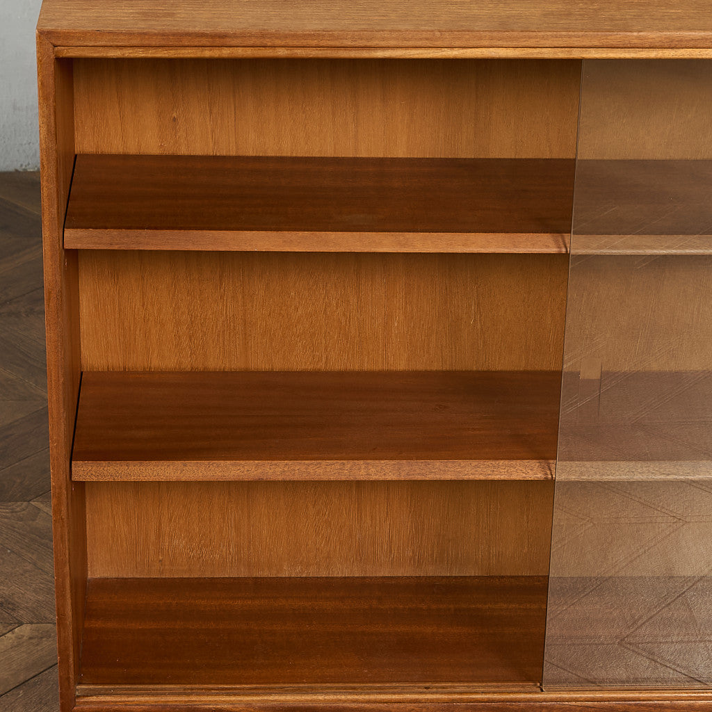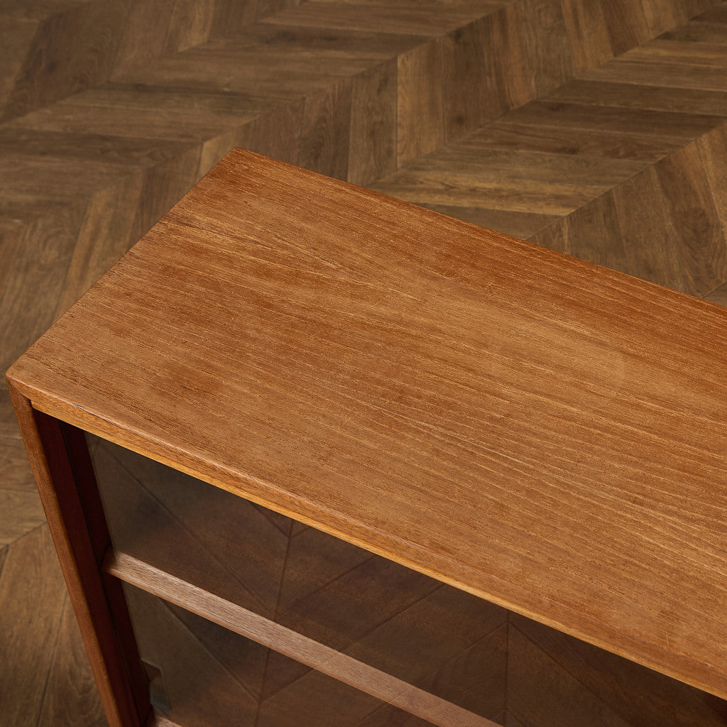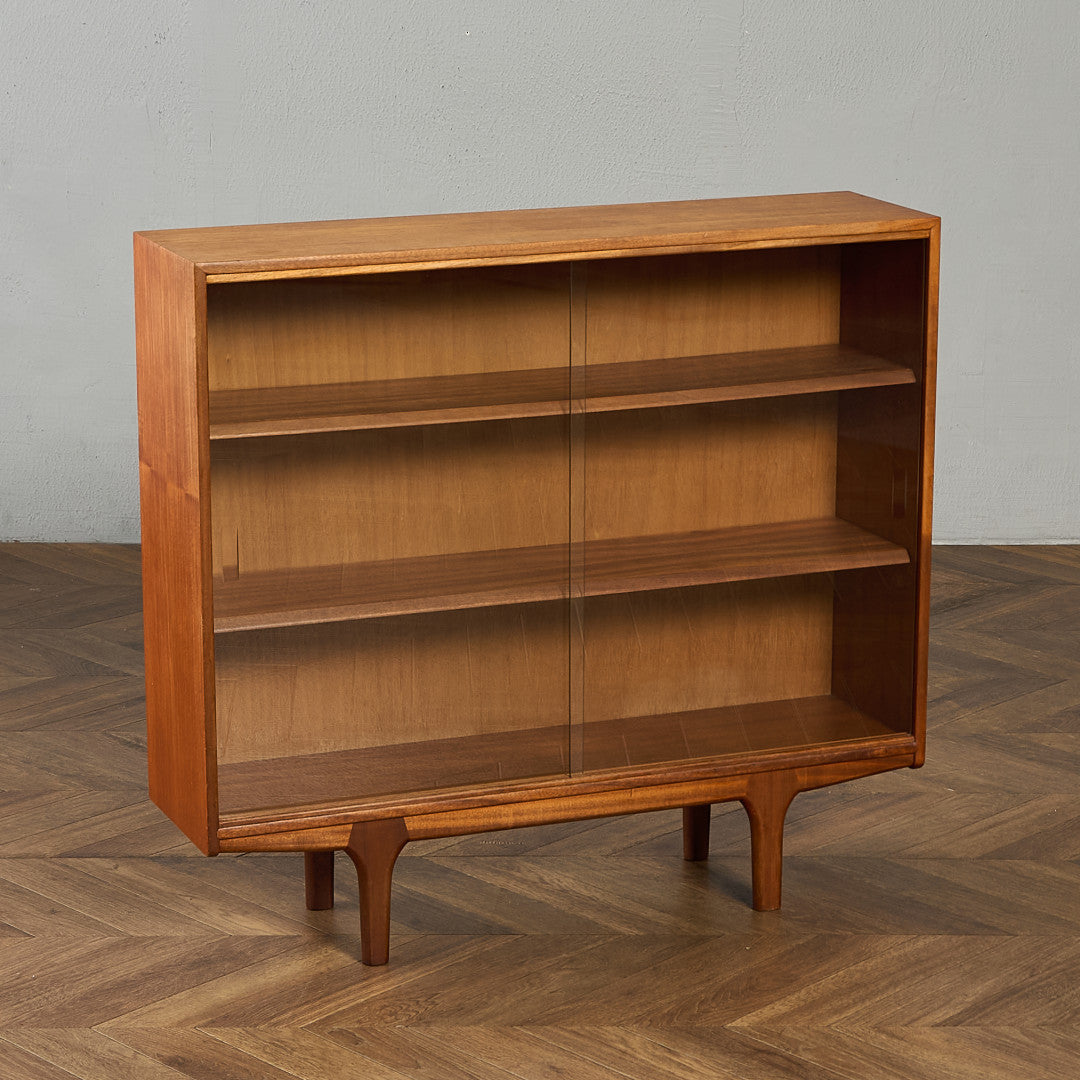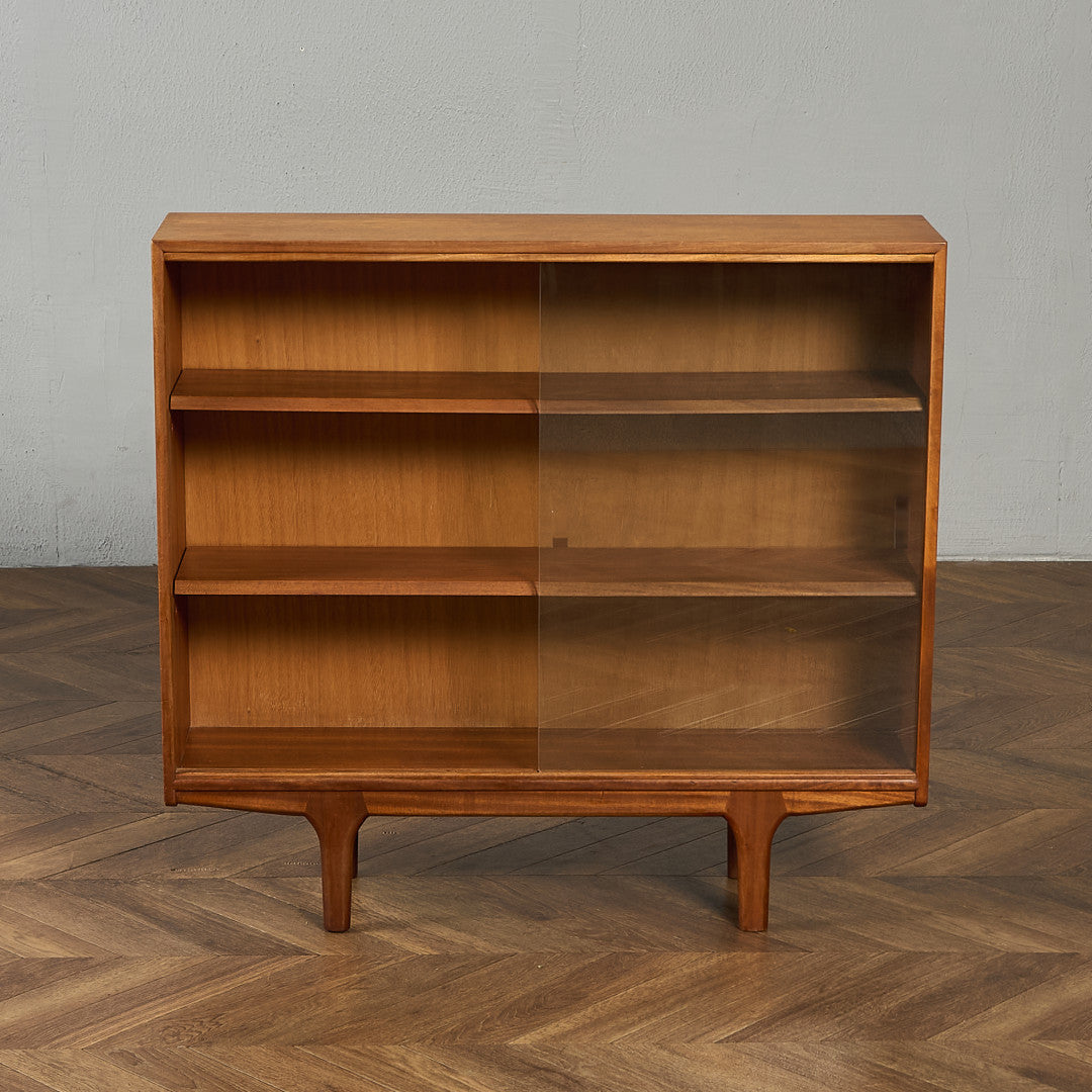 チーク材のあたたかな質感、洗練されたデザインが印象的。奥行きが浅いので限られたスペースでの文庫書籍や食器、コレクションなど見せる収納に最適です。実用的でありながらも作り手のこだわりを感じさせるヴィンテージファニチャーです。