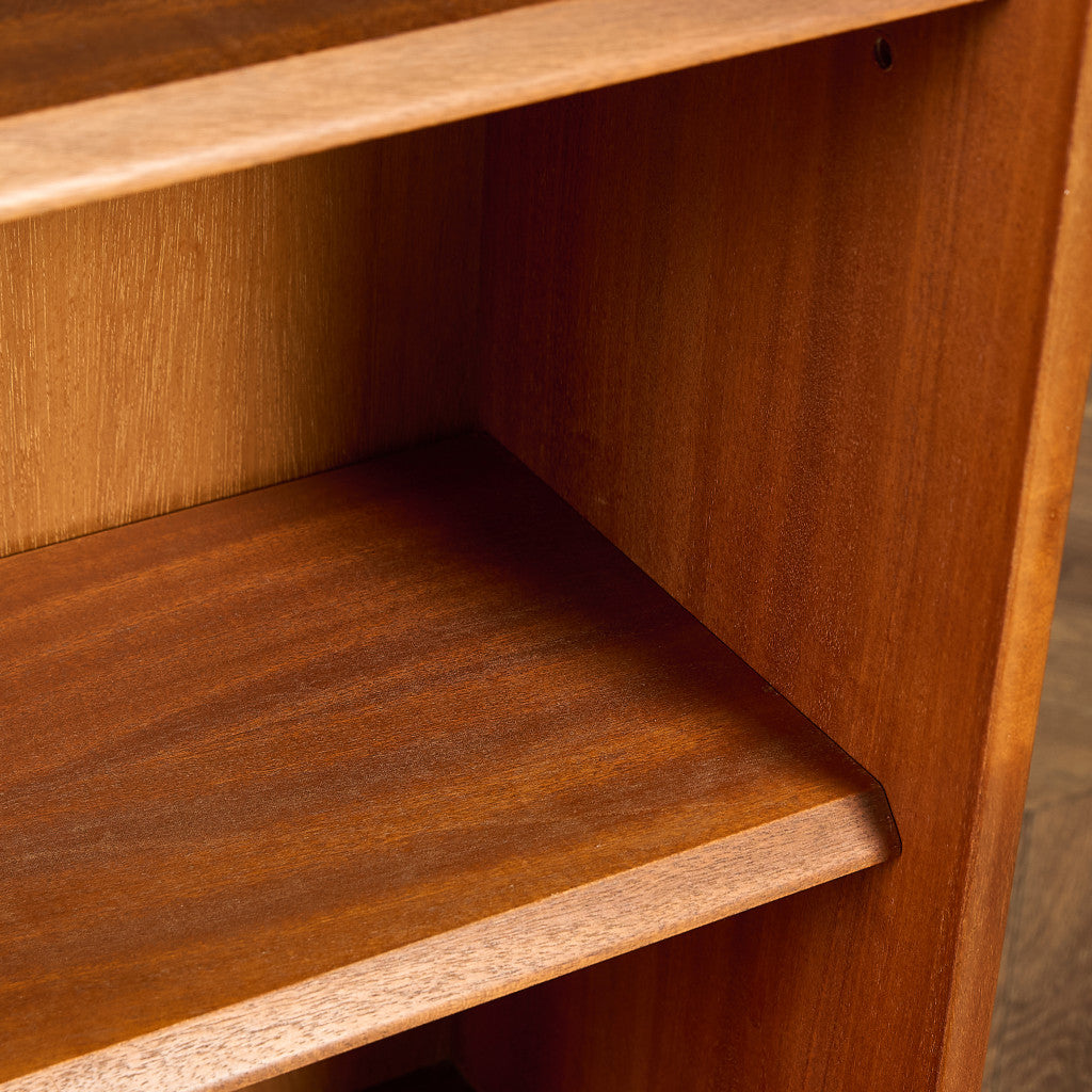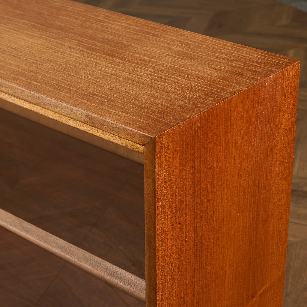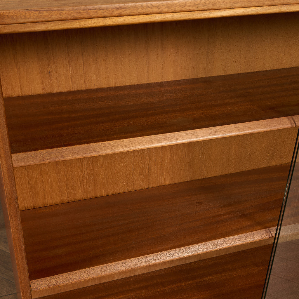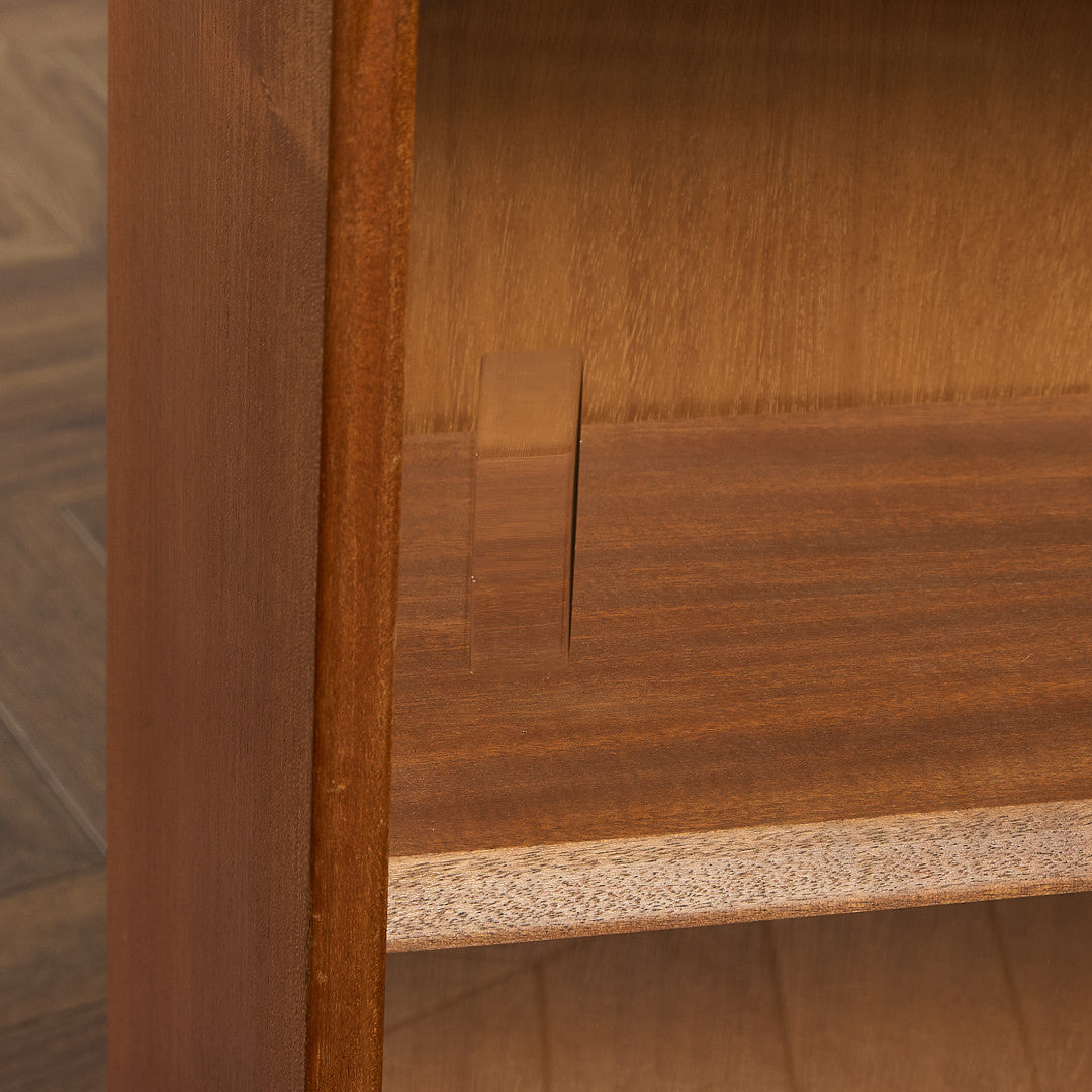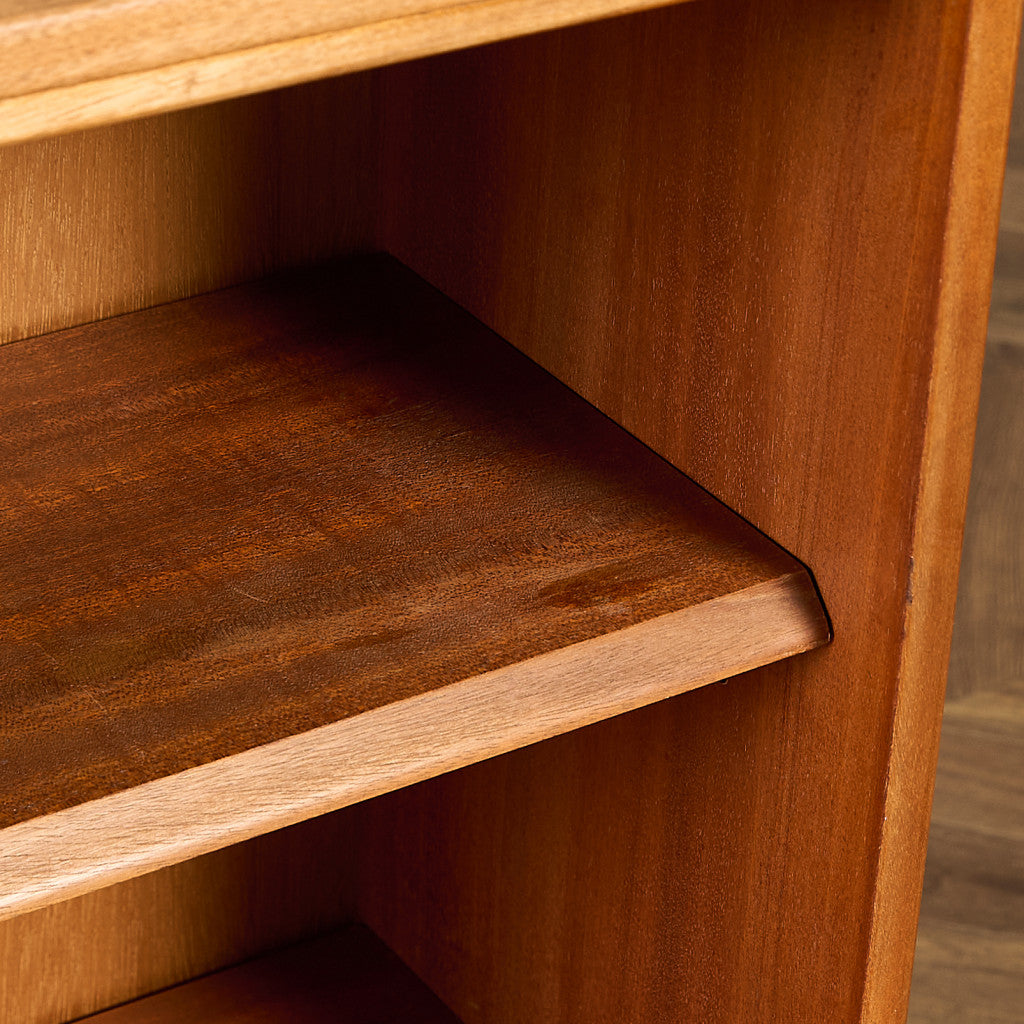 チーク材のあたたかな質感、洗練されたデザインが印象的。奥行きが浅いので限られたスペースでの文庫書籍や食器、コレクションなど見せる収納に最適です。実用的でありながらも作り手のこだわりを感じさせるヴィンテージファニチャーです。