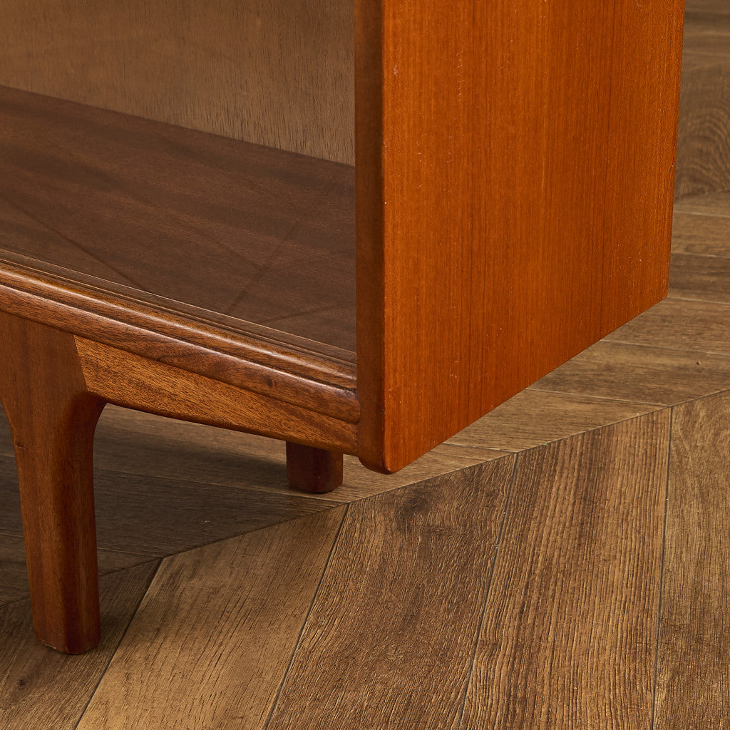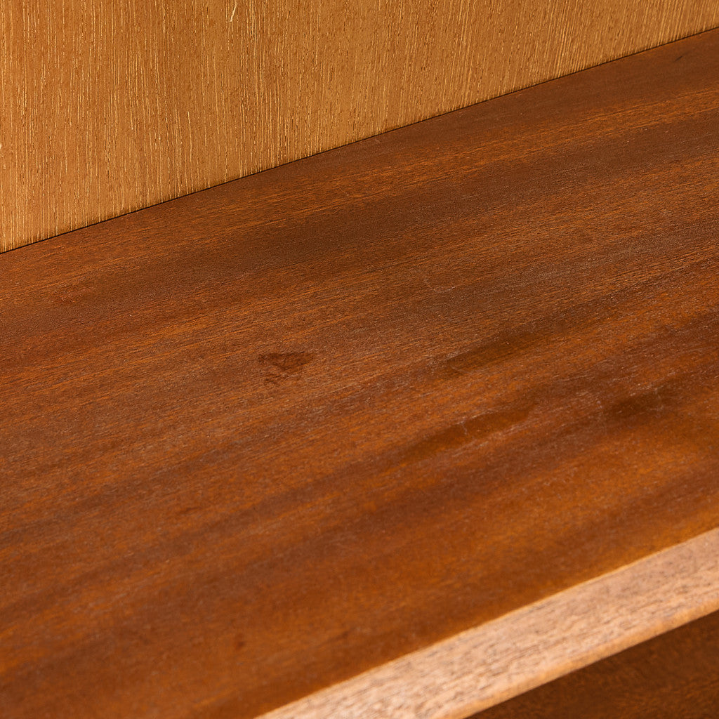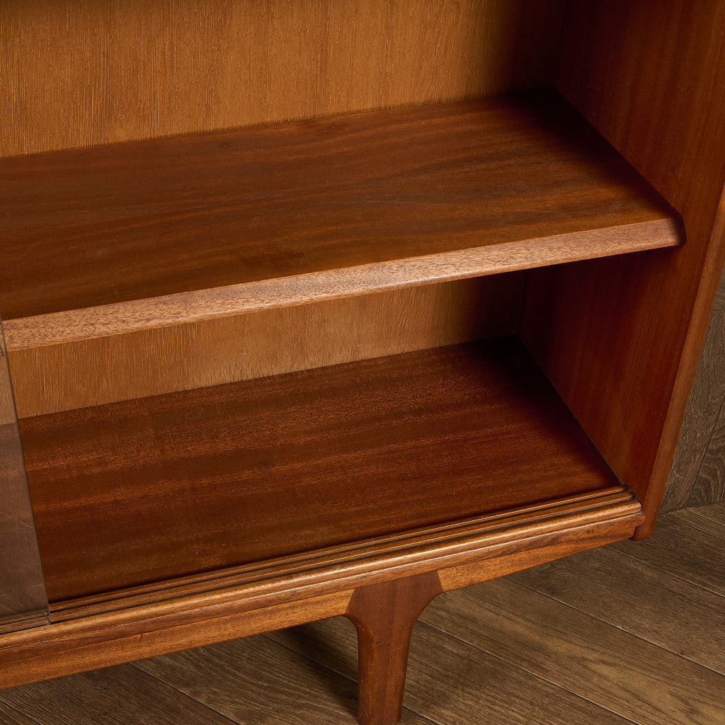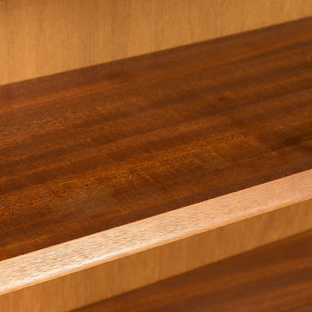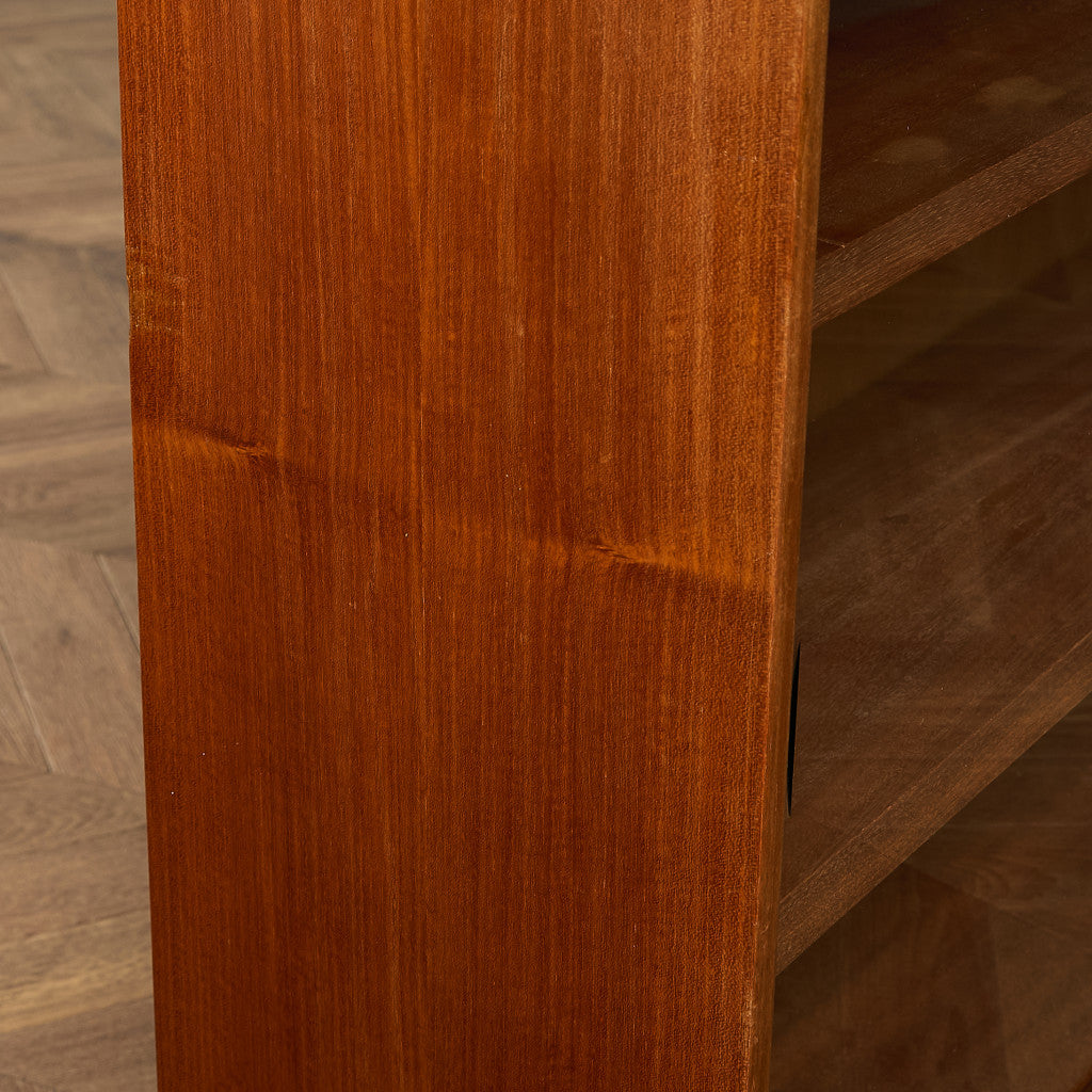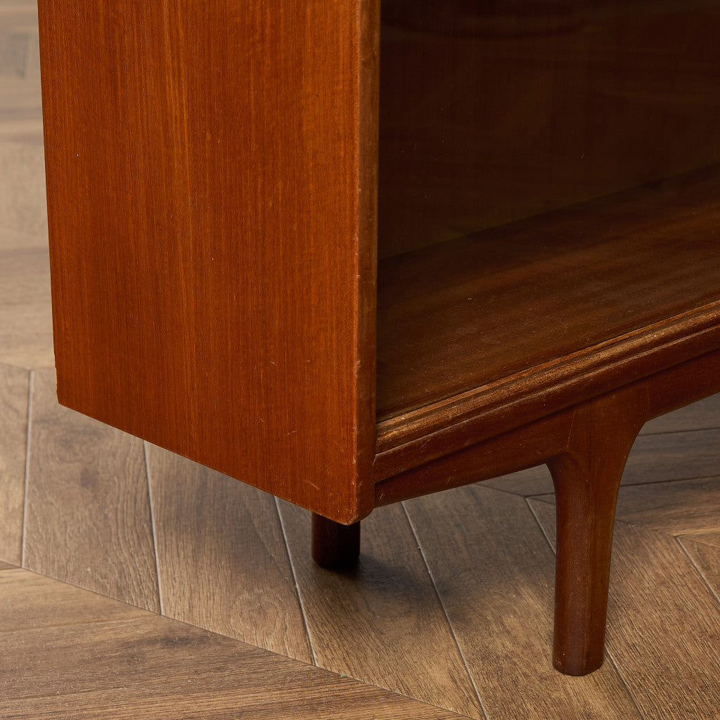 チーク材のあたたかな質感、洗練されたデザインが印象的。奥行きが浅いので限られたスペースでの文庫書籍や食器、コレクションなど見せる収納に最適です。実用的でありながらも作り手のこだわりを感じさせるヴィンテージファニチャーです。