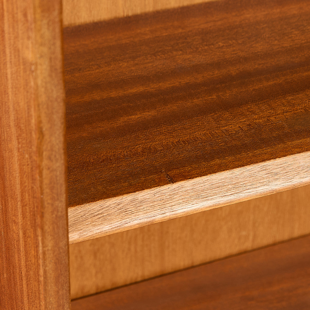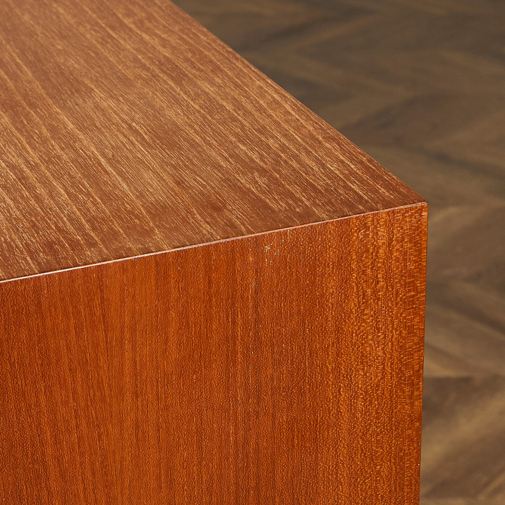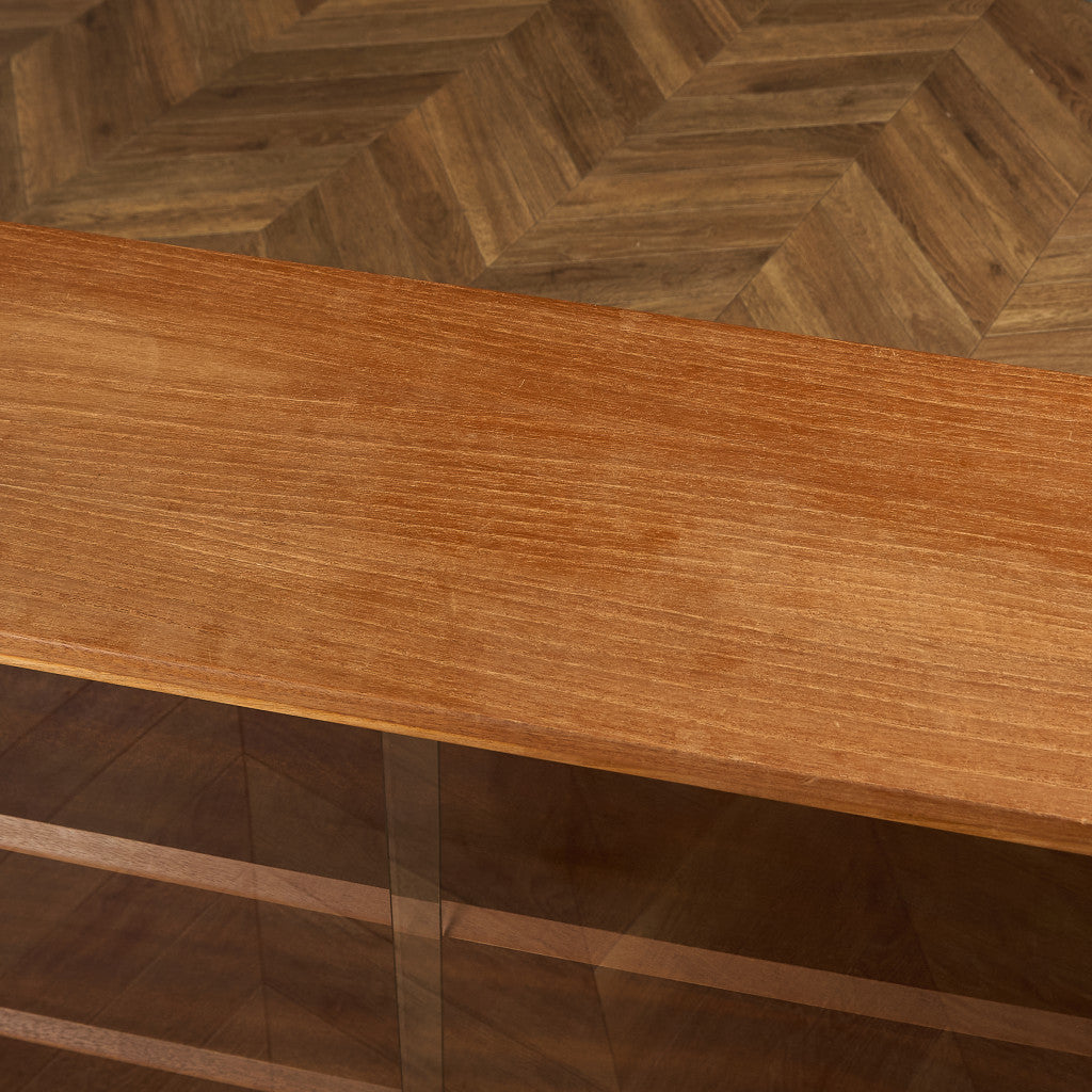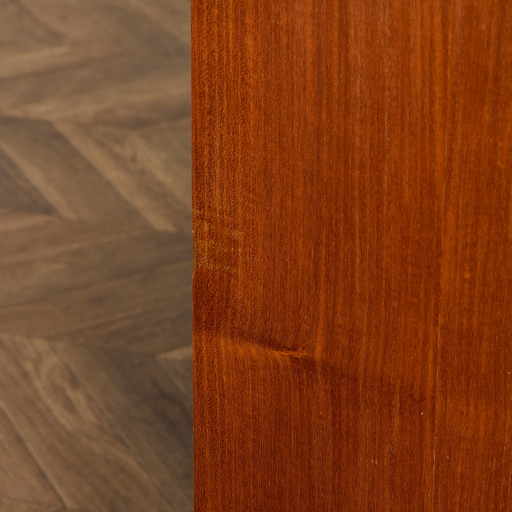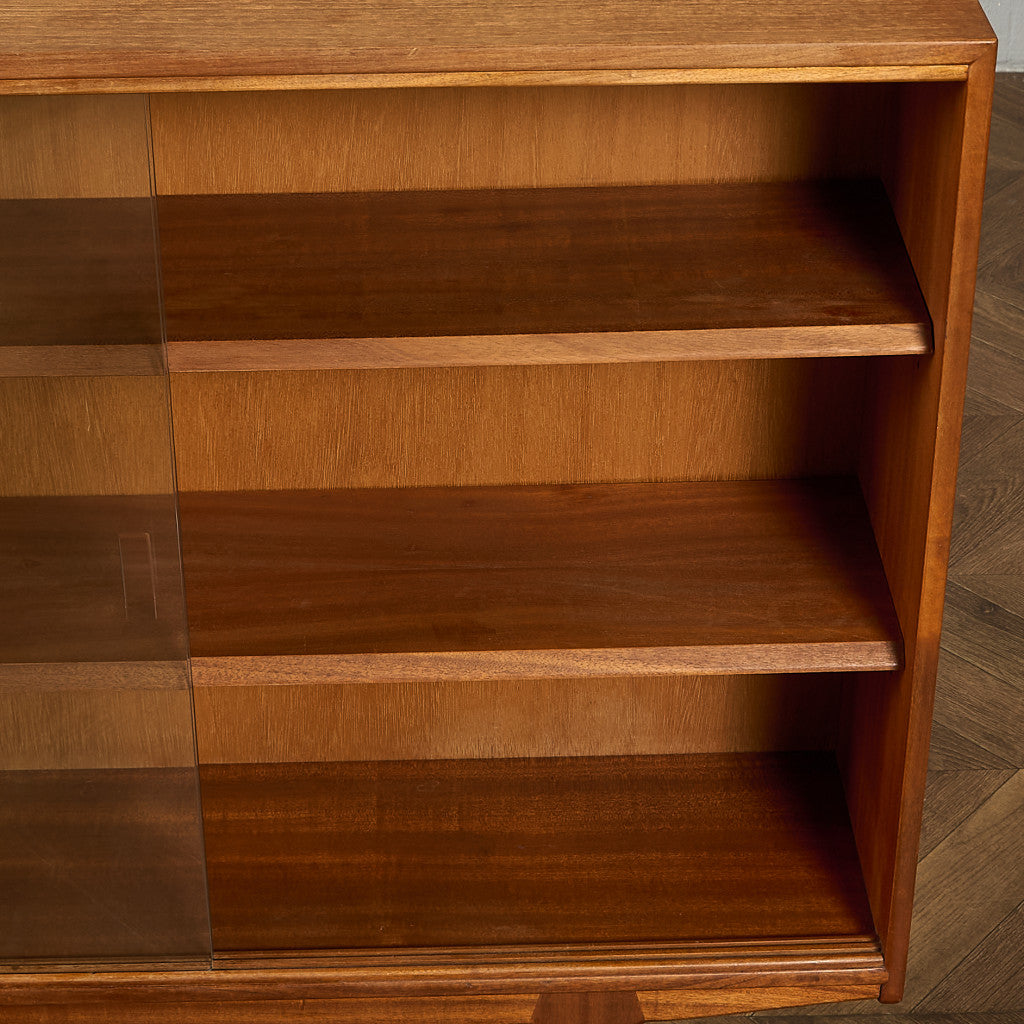 チーク材のあたたかな質感、洗練されたデザインが印象的。奥行きが浅いので限られたスペースでの文庫書籍や食器、コレクションなど見せる収納に最適です。実用的でありながらも作り手のこだわりを感じさせるヴィンテージファニチャーです。