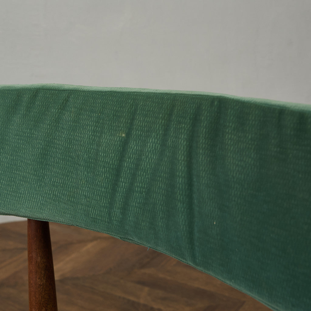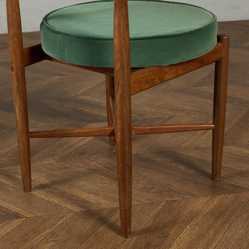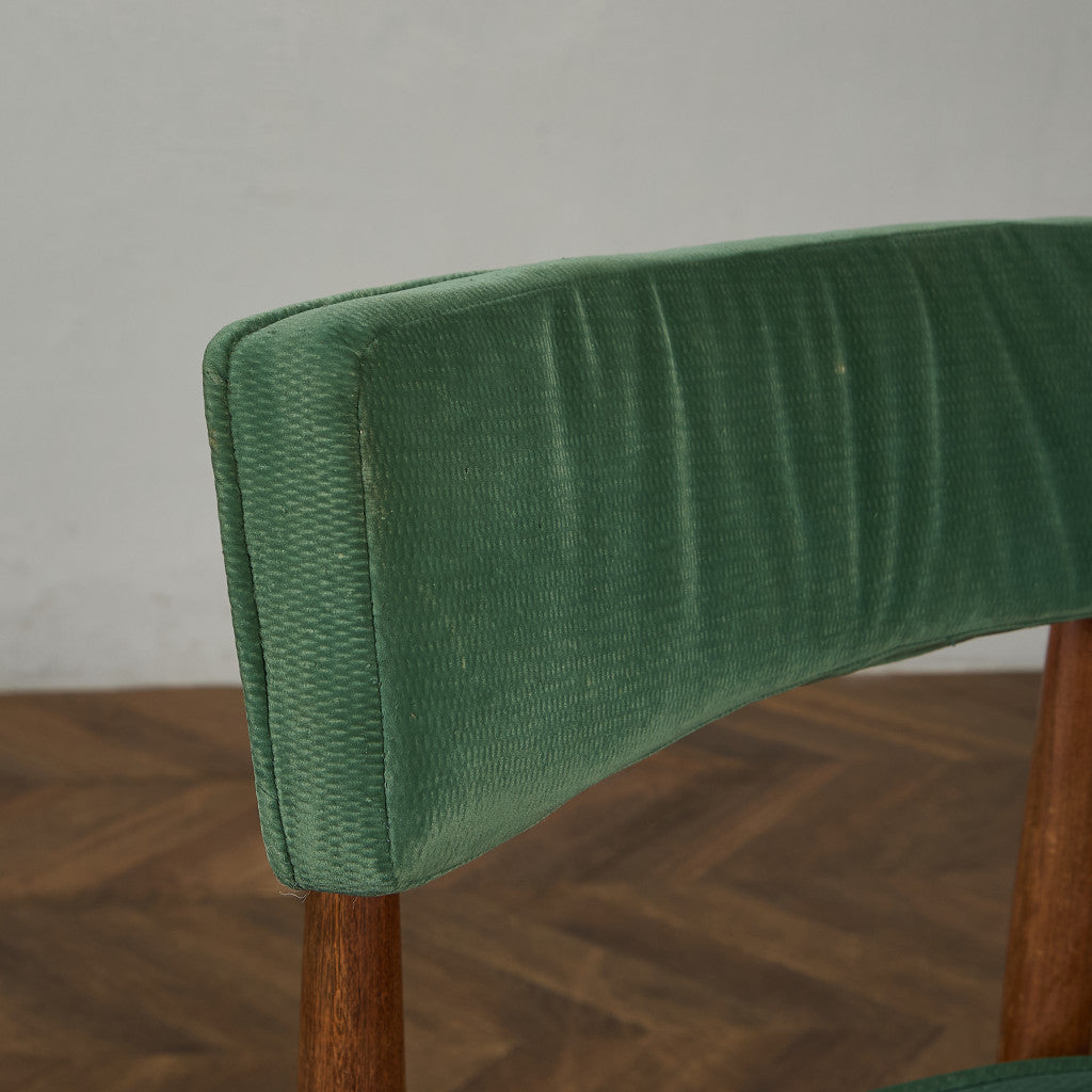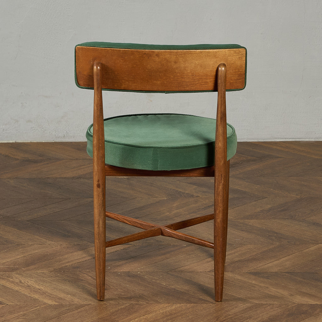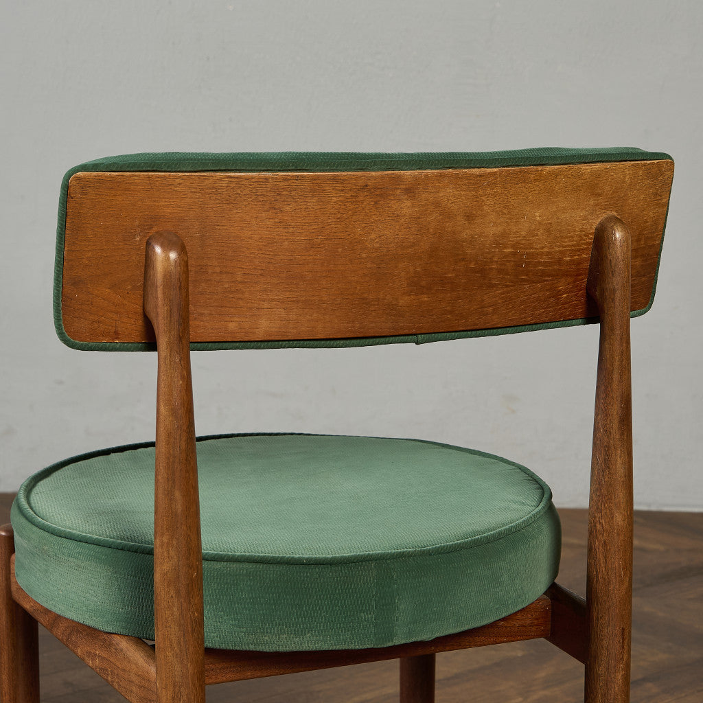 フレスコシリーズのダイニングチェアの中でも最も人気が高い定番モデル。クッション性の高い丸座とクッション付きの背もたれを備えており座り心地はピカイチ。うっすらと弧を描く背もたれの曲線はG-PLANのラウンドダイニングテーブルのエッジラインに合わせることで一体感のあるコーディネートが可能。脚からプライウッドの背もたれへ続くなめらかなラインが非常に美しいため背面から見ても非常に絵になる椅子です。