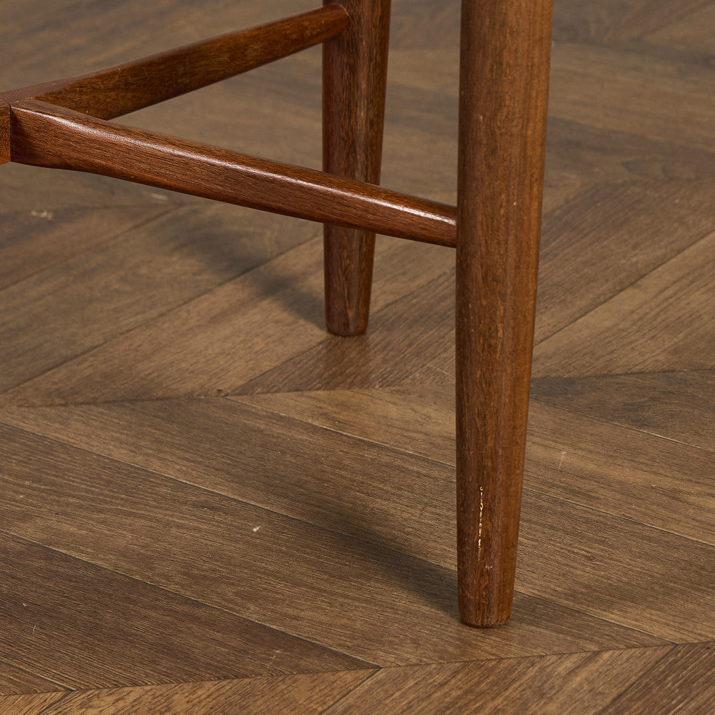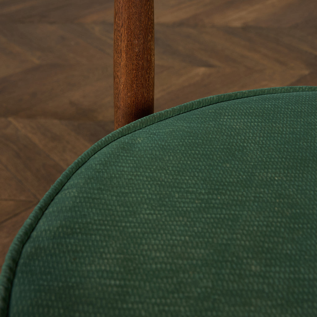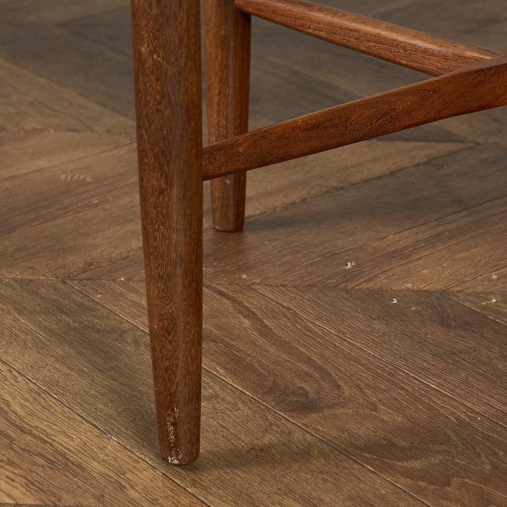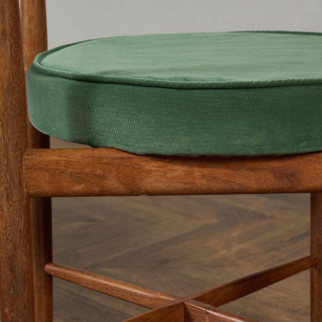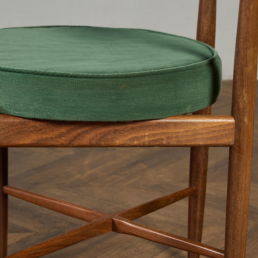 フレスコシリーズのダイニングチェアの中でも最も人気が高い定番モデル。クッション性の高い丸座とクッション付きの背もたれを備えており座り心地はピカイチ。うっすらと弧を描く背もたれの曲線はG-PLANのラウンドダイニングテーブルのエッジラインに合わせることで一体感のあるコーディネートが可能。脚からプライウッドの背もたれへ続くなめらかなラインが非常に美しいため背面から見ても非常に絵になる椅子です。