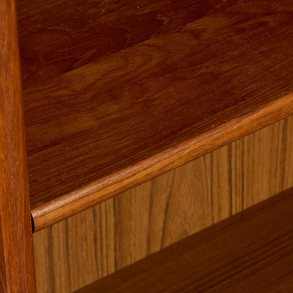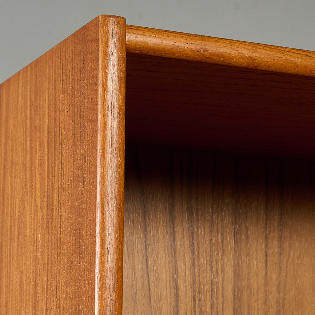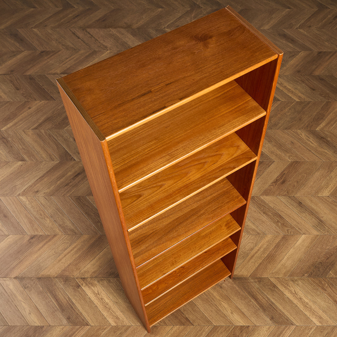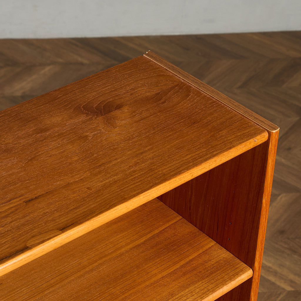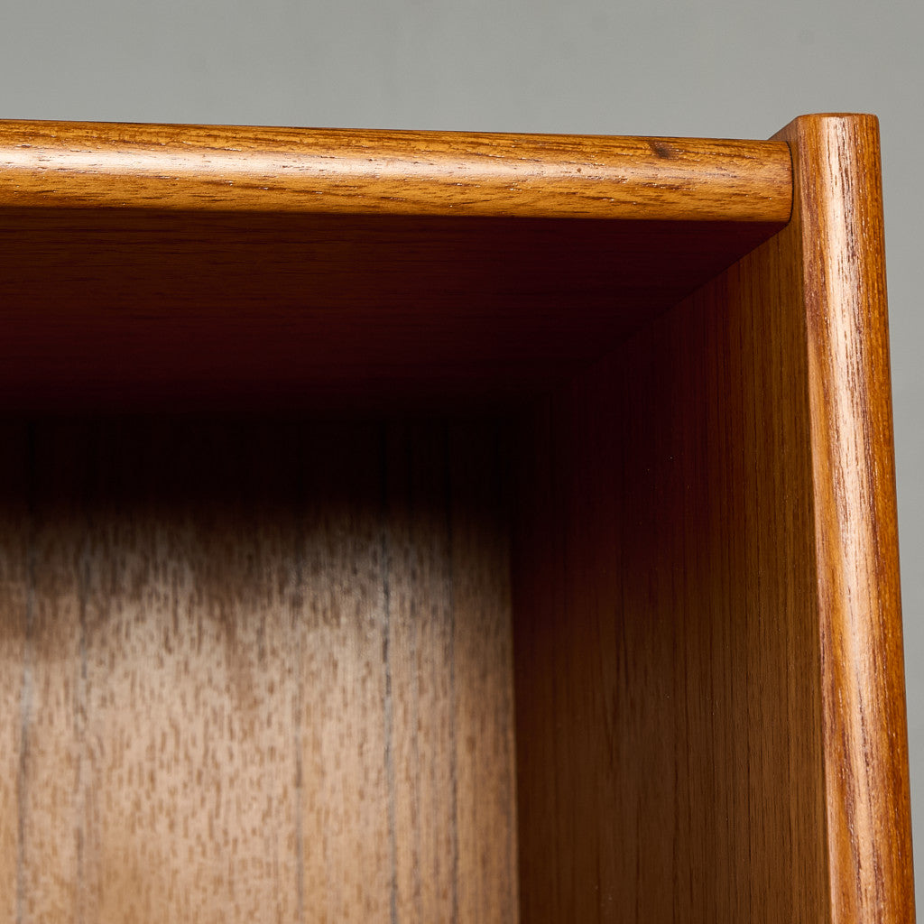 チーク材を使用した、オープン仕様のブックシェルフ。シンプルながらも細部に作り手のこだわりを感じる、北欧家具黄金期のヴィンテージファニチャーです。スリムなので使い勝手がよく、高さに充分なスペースがあるため収納力も豊富です。