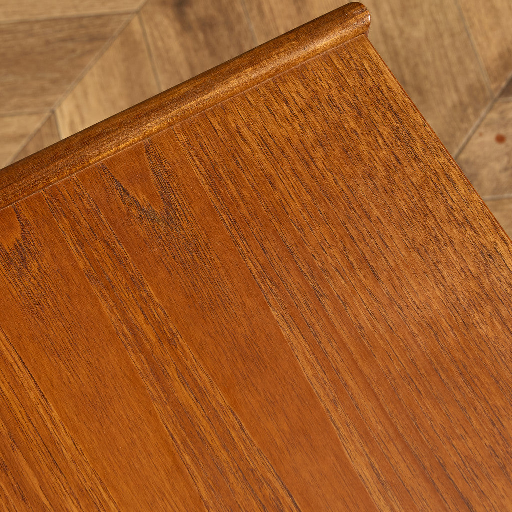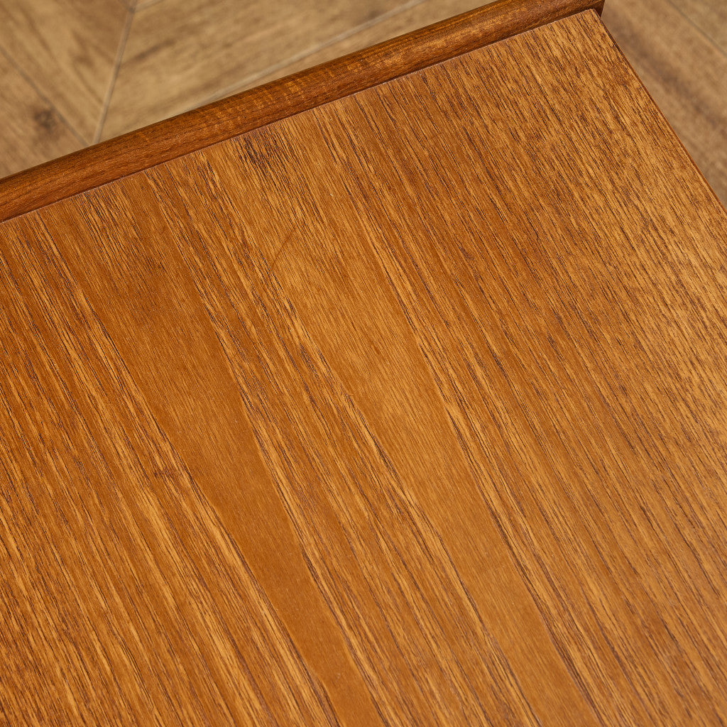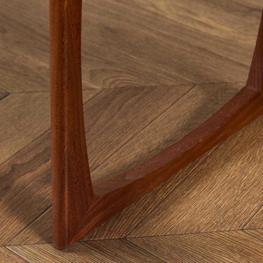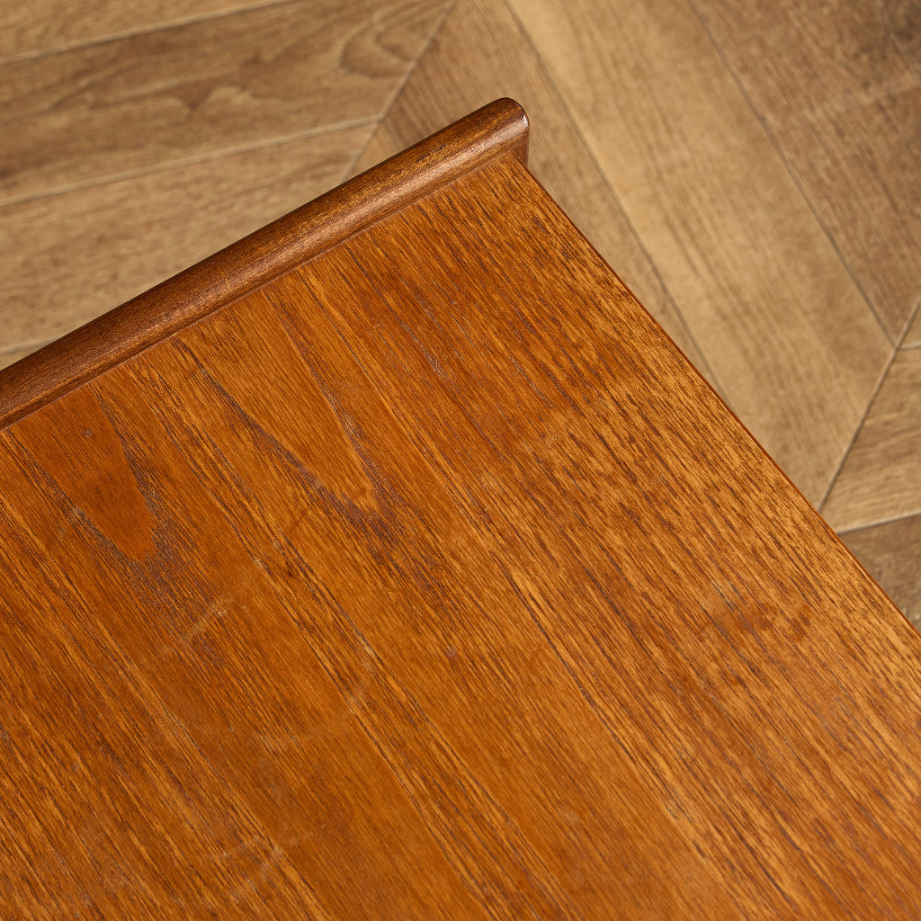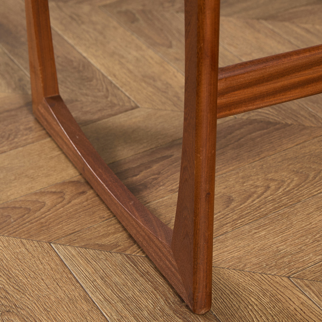 フランスのスクエア(四角)になって踊る古典舞踊、Quadrilleの名前を冠する1965年発表のG-PLAN Quadrilleシリーズ。Frescoシリーズと同じく60年代のデンマークデザインを源泉にもち、美しい褐色のチーク材を使用。四方を面取りされた樽型取手、内側に緩やかな弧を描き外形を四角に組まれた美しい形状の脚が特徴です。