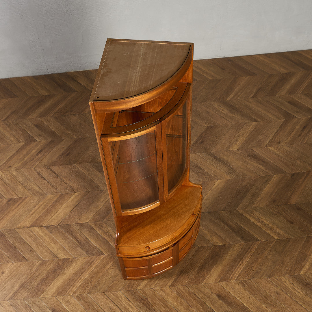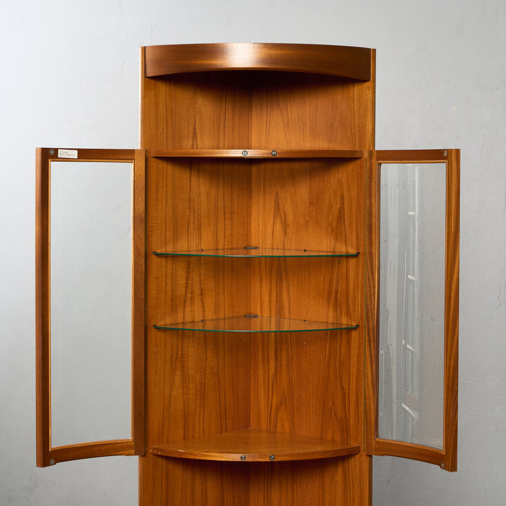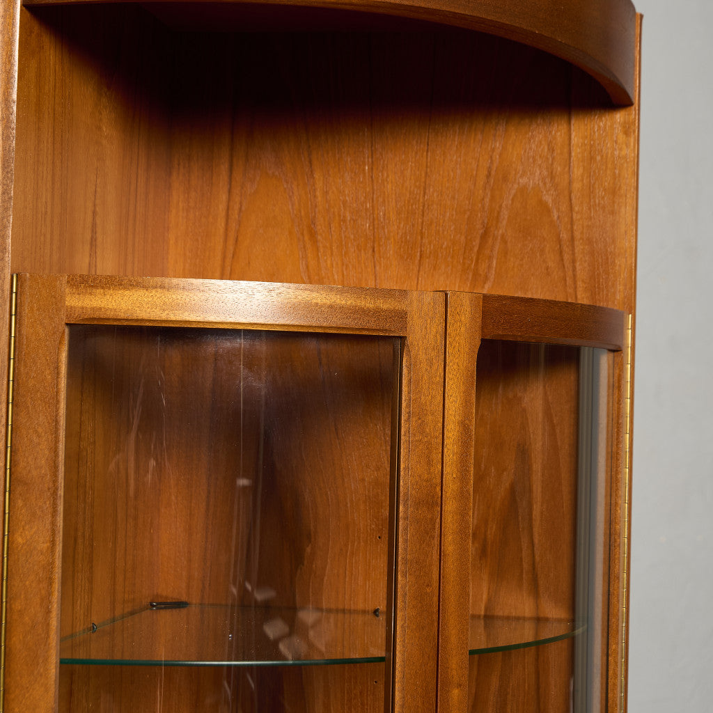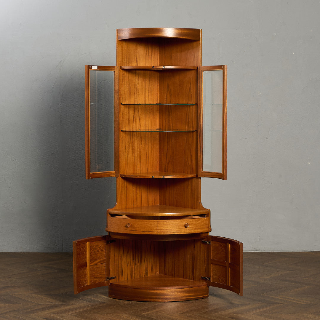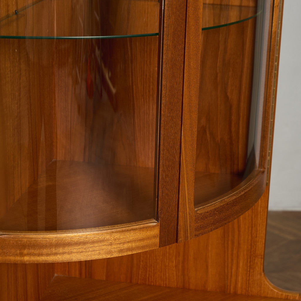 レア度の高いトールタイプのガラスコーナーキャビネットです。少しクラシック家具寄りの、湾曲した前面扉の框構造が印象的。ヴィンテージチークのあたたかな質感が味わい、手の込んだ仕上がりの洗練されたキャビネットです。G-PLANやMcINTOSHと比べて流通が少ないこともコレクター心をくすぐります。